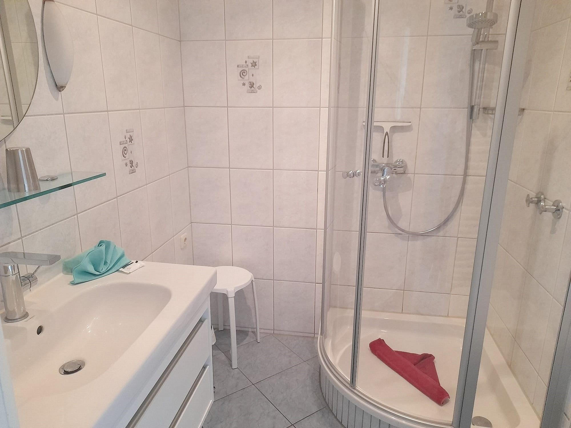 Modernes, hell gefliestes Bad mit Dusche, WC und Waschbecken.