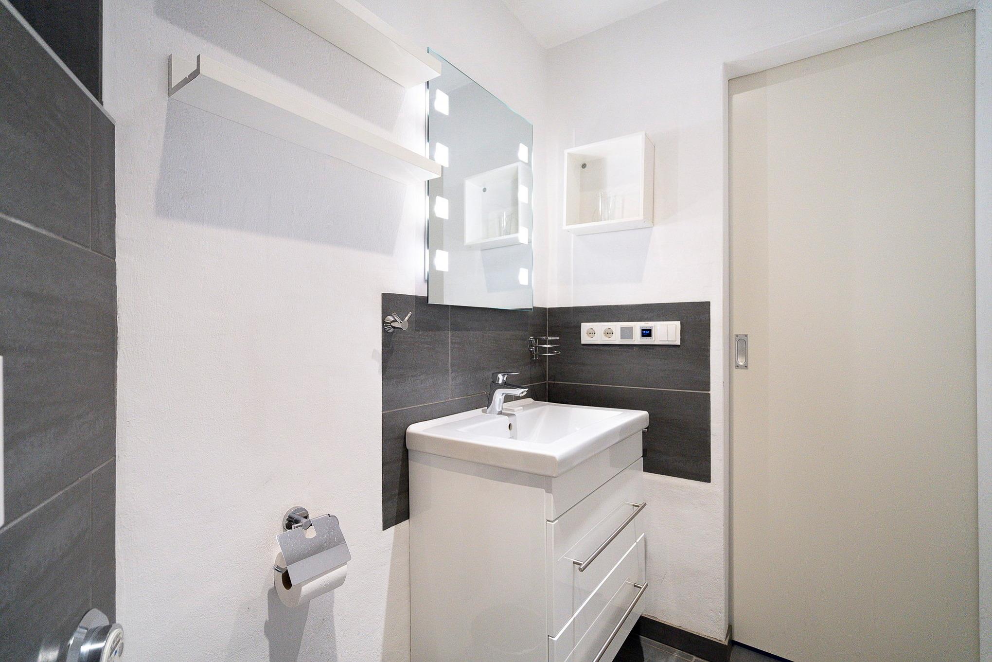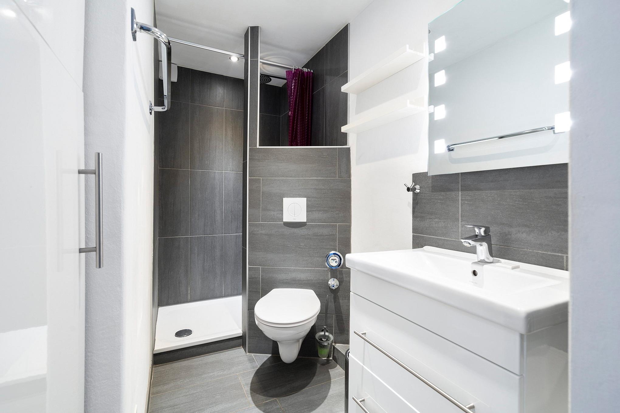 Modernes, freundliches Bad mit Regendusche, WC und Waschbecken. Zur Unterhaltung steht ein eingebautes Radio bereit.