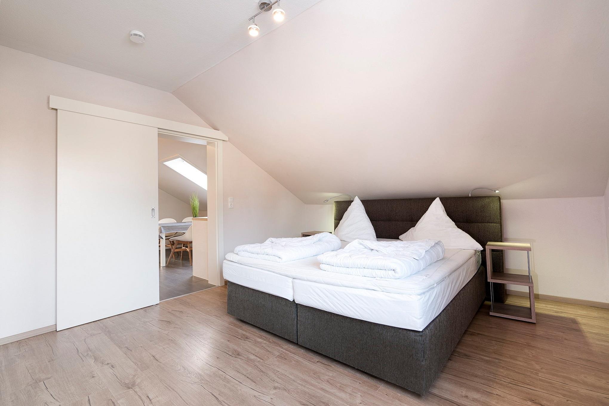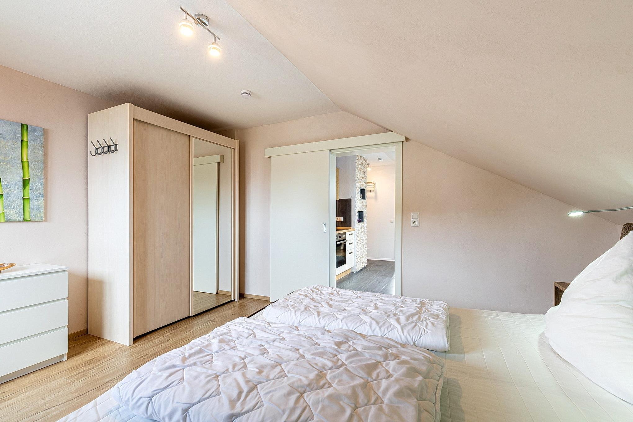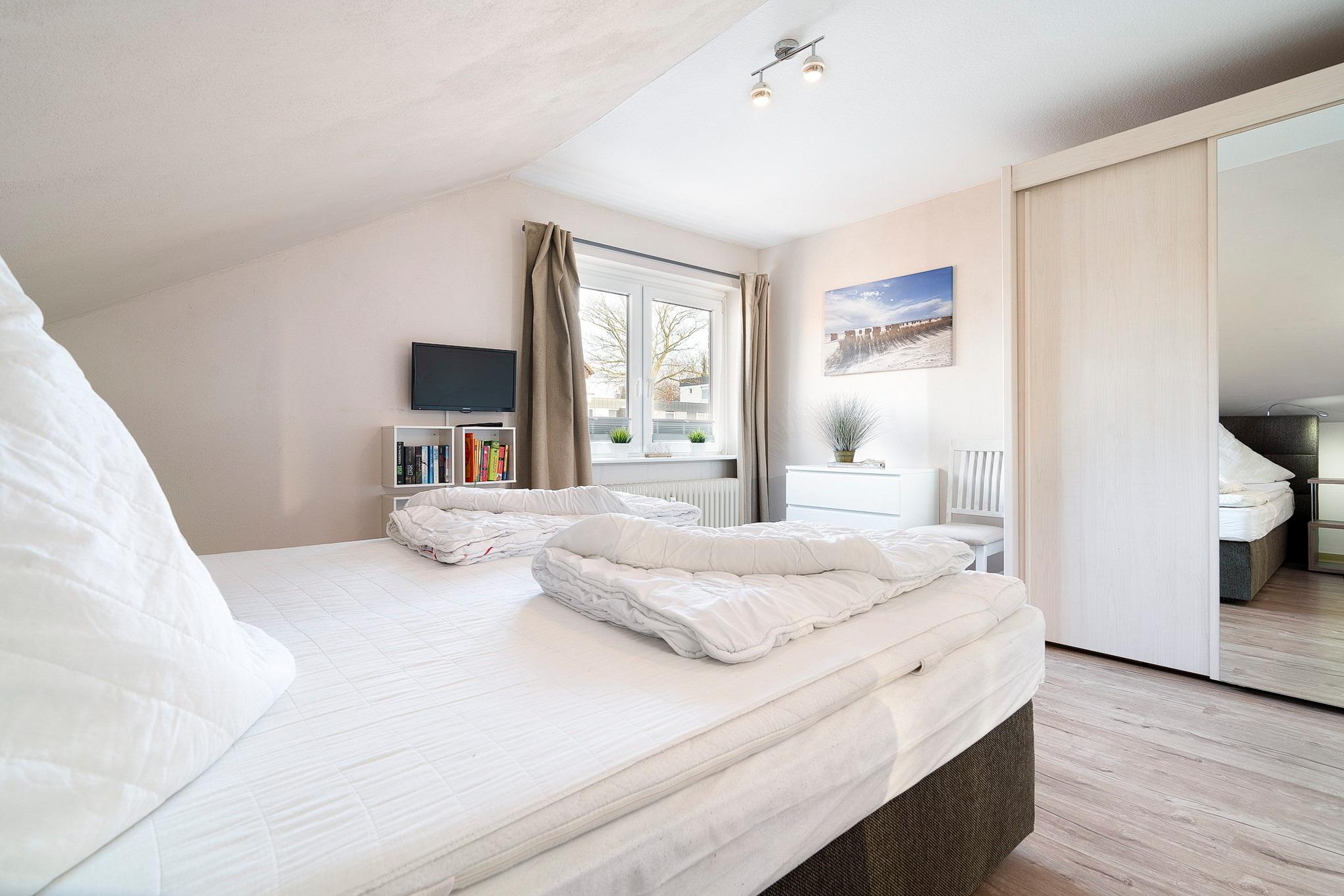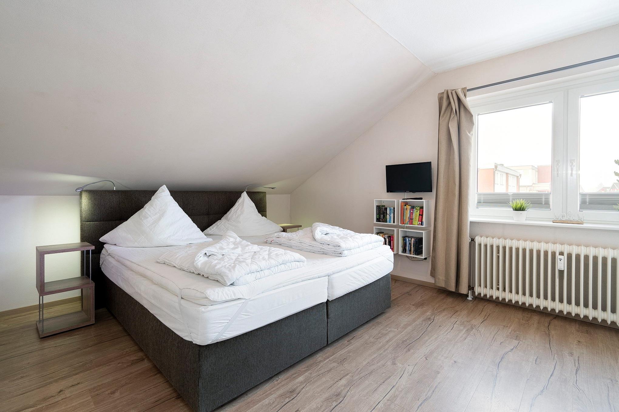 Modernes, freundliches, separates Schlafzimmer mit einem Boxspringbett (180 x 200cm), Nachtschränken, einem 2-türigen Kleiderschrank und einer Kommode. Zur Unterhaltung steht ein Flachbildfernseher (SAT) mit DVD-Player zur Verfügung. Das Zimmer ist mit Laminatboden ausgelegt, das Fenster lässt sich durch eine Innenjalousie etwas verdunkeln.