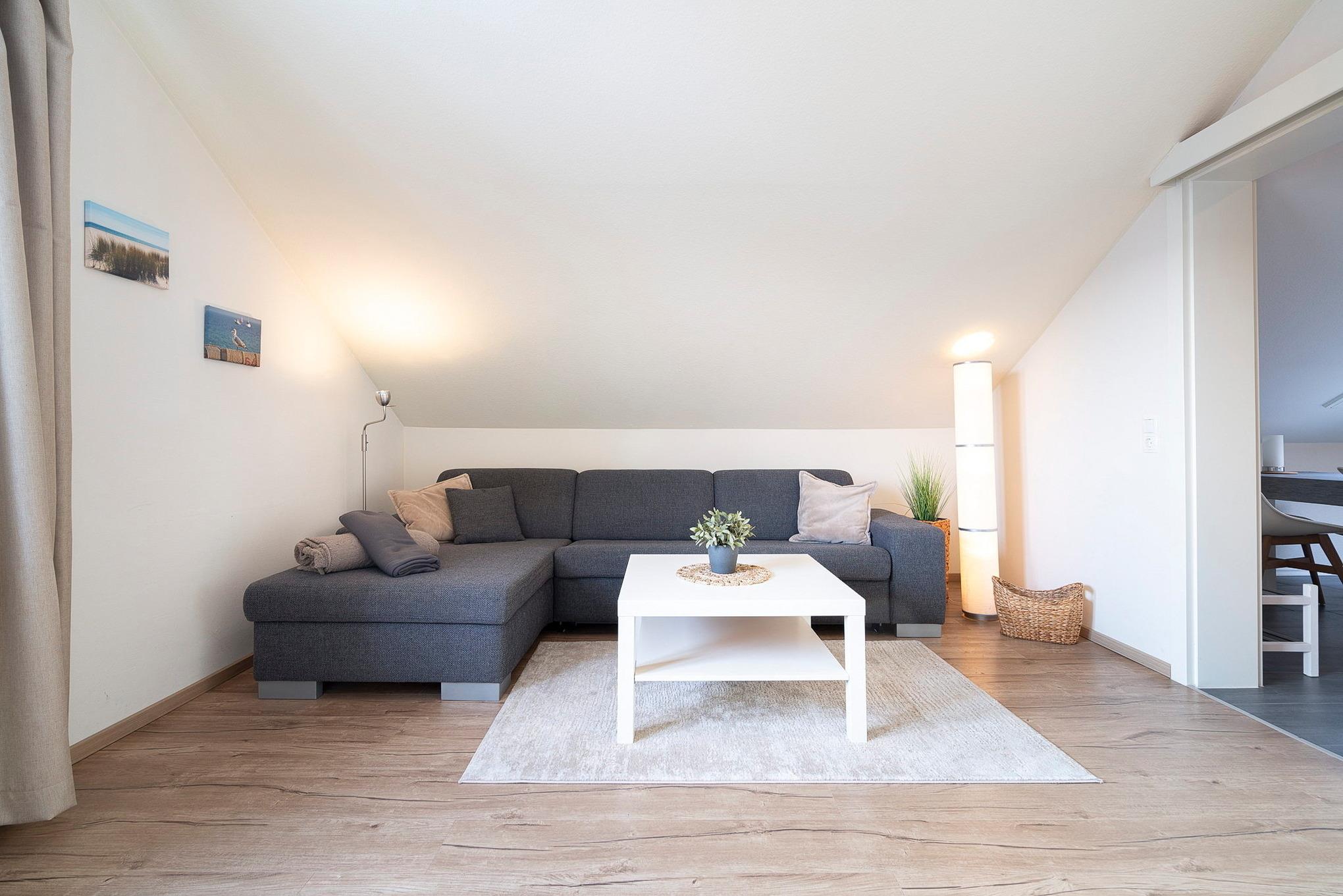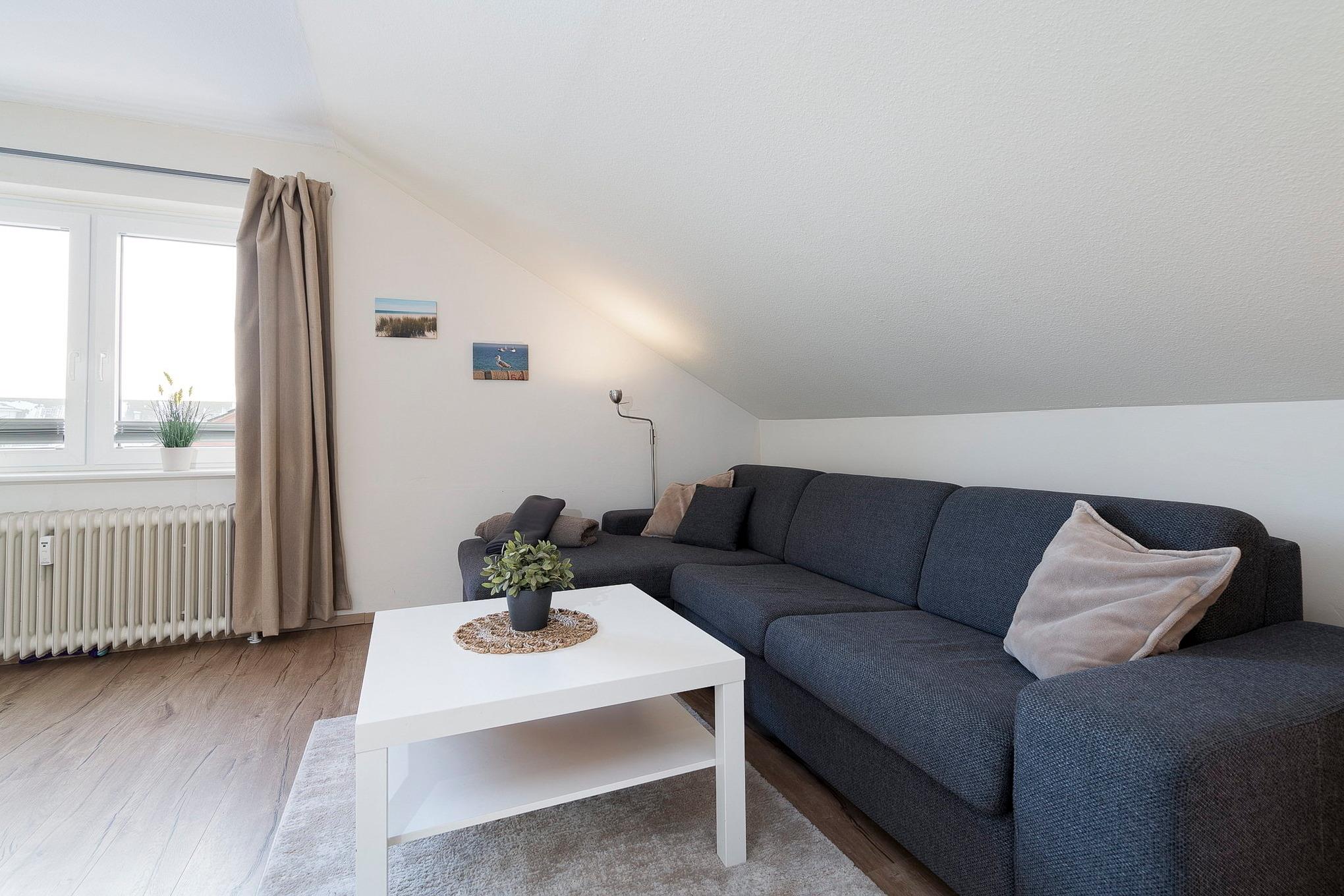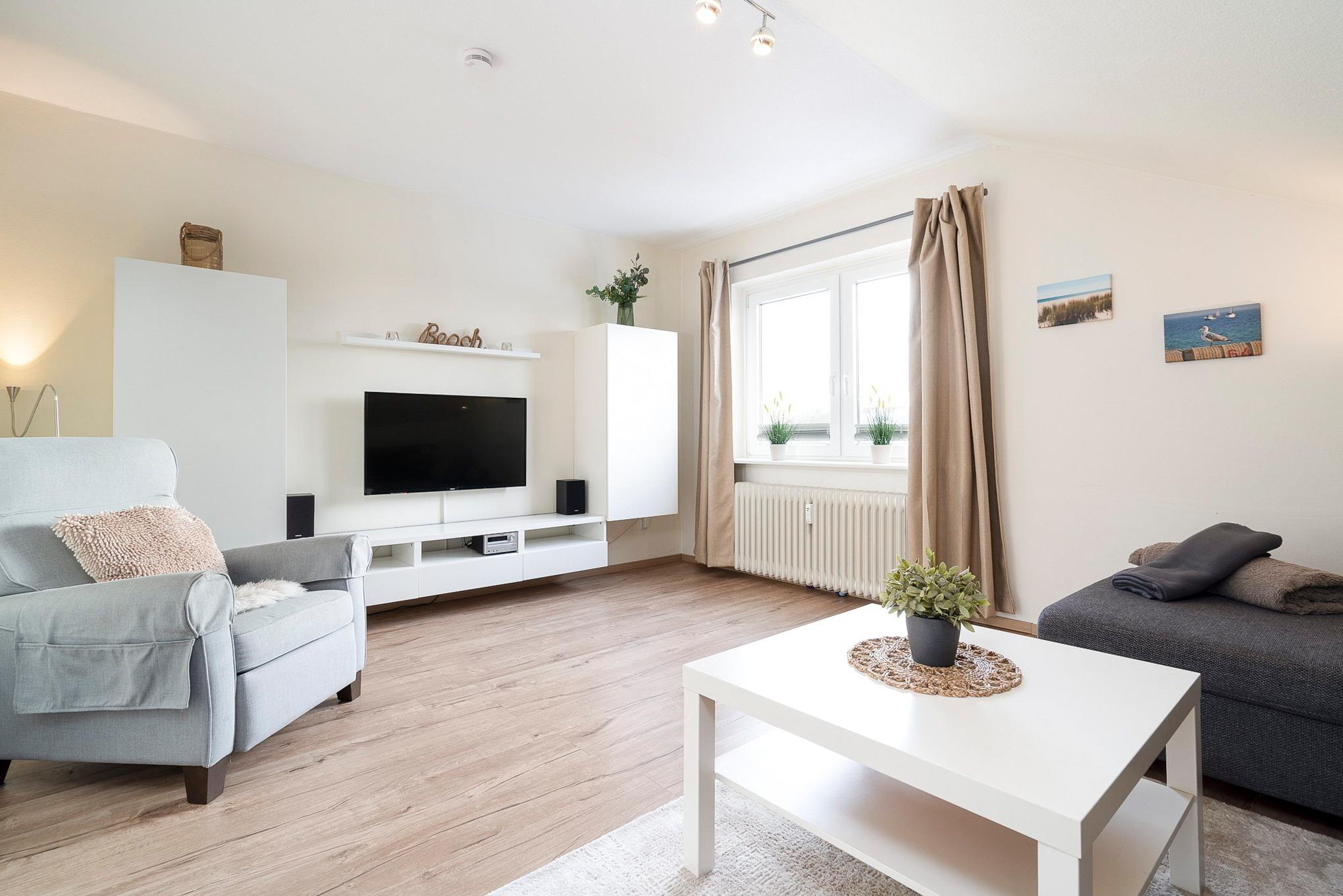 Modernes, helles, freundliches Wohnzimmer mit einer Schlafcouch (140x200cm mit Lattenrost), einem Couchtisch und einem Wohnzimmerelement. Zur Unterhaltung steht ein Flachbildfernseher (SAT) zur Verfügung. Das Wohnzimmer ist mit Designer-Planken ausgelegt, das Fenster lässt sich durch eine Innenjalousie etwas verdunkeln.