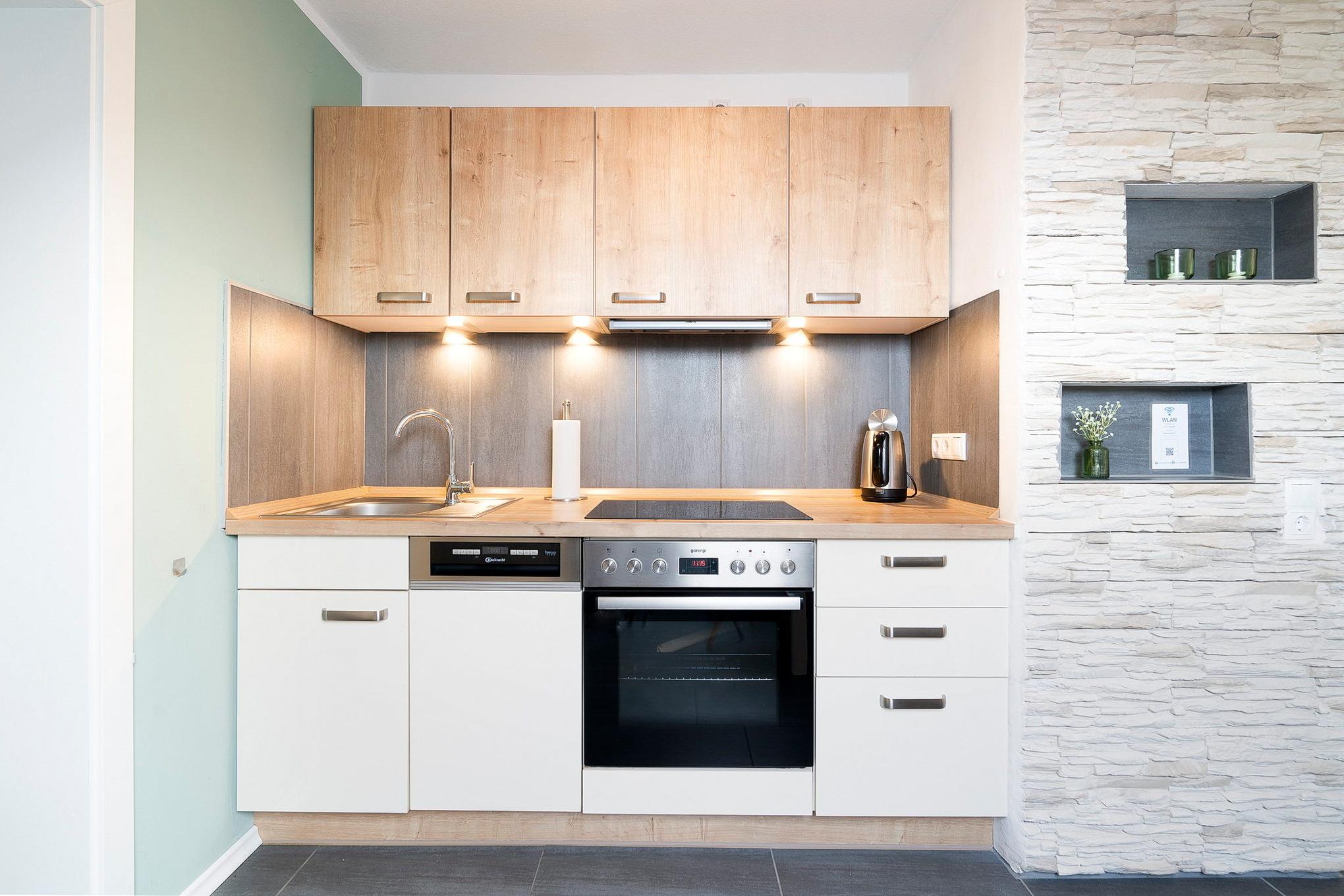 Moderne, komplett ausgestattete Wohnküche mit 4-Platten Induktionskochfeld, Umluft-Backofen, Spülmaschine, Kühlschrank mit kleinem 3-Sterne Gefrierfach, Kaffeemaschine, Kapselmaschine (Dolce Gusto), Mikrowelle, Wasserkocher und Toaster, einem Essplatz für 4 Personen und einer Kommode.