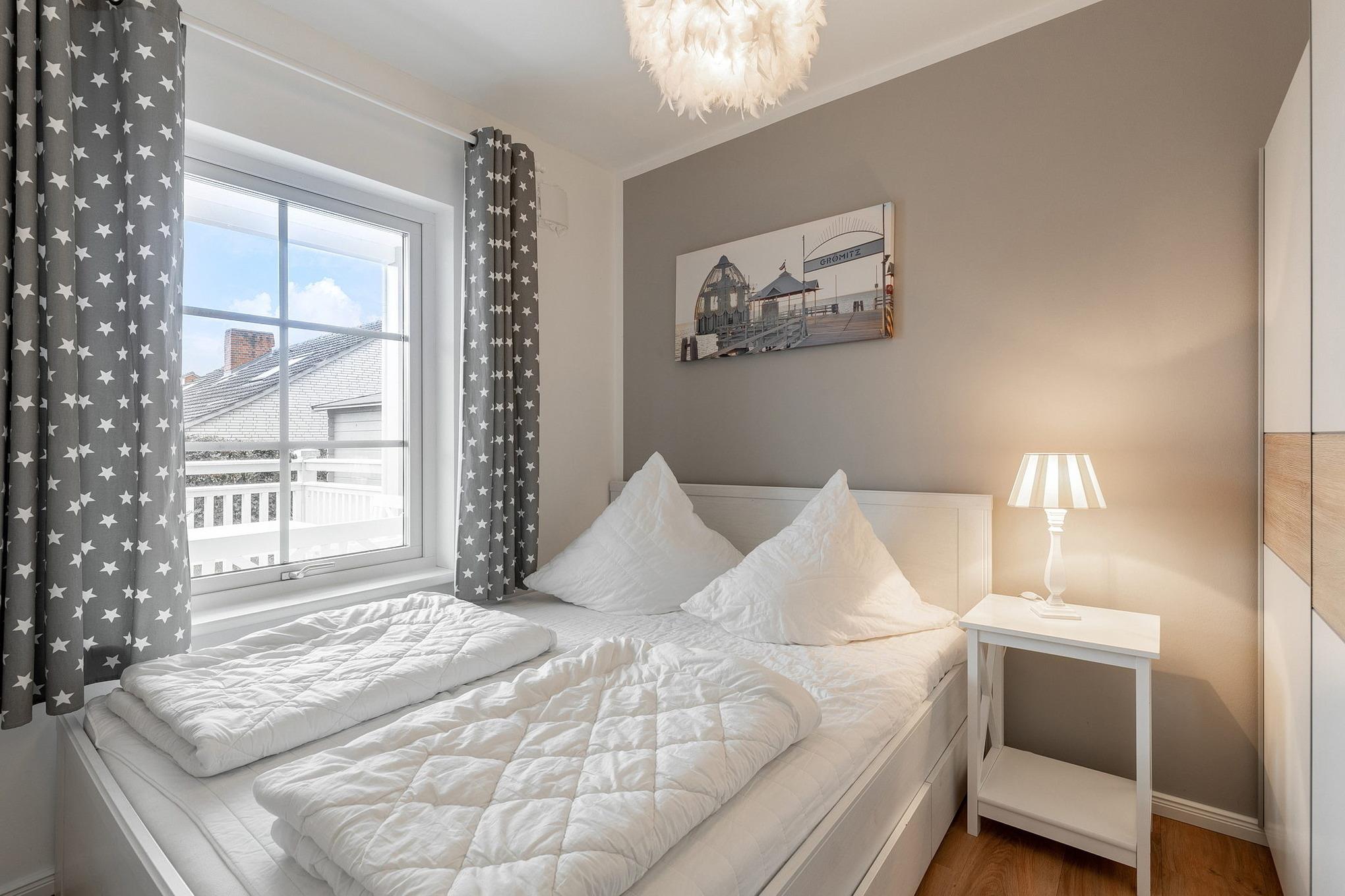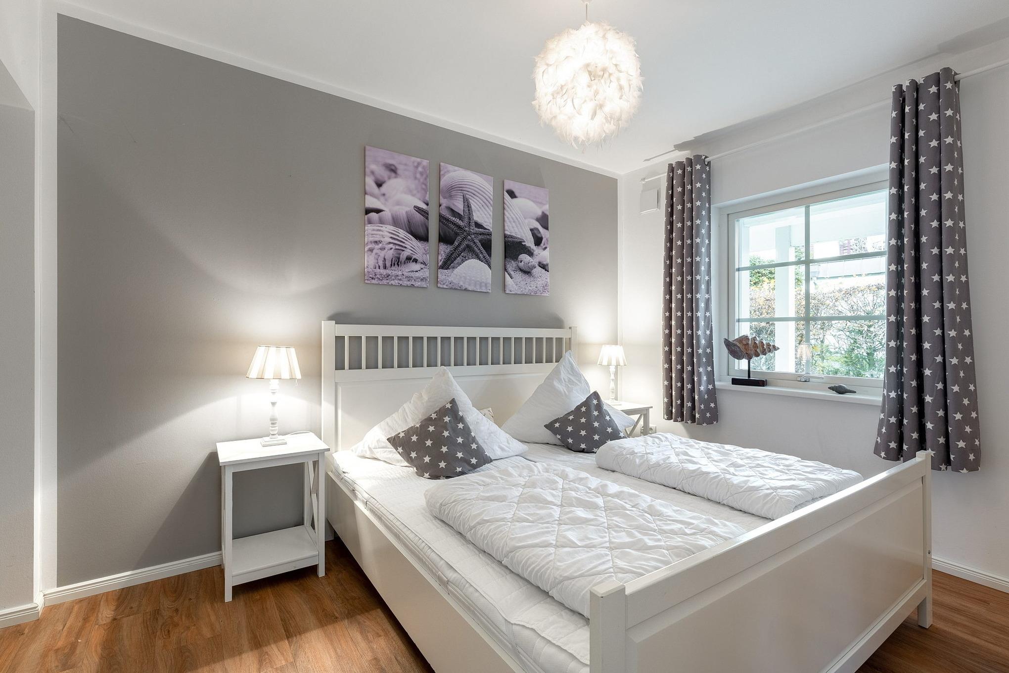 Separates, modern eingerichtetes Schlafzimmer mit Doppelbett (140x200cm), einem Nachttisch und einem Kleiderschrank. Das Schlafzimmer ist mit Vinylboden ausgelegt. Das Fenster zur Terrasse lässt sich durch einen Vorhang etwas verdunkeln.
