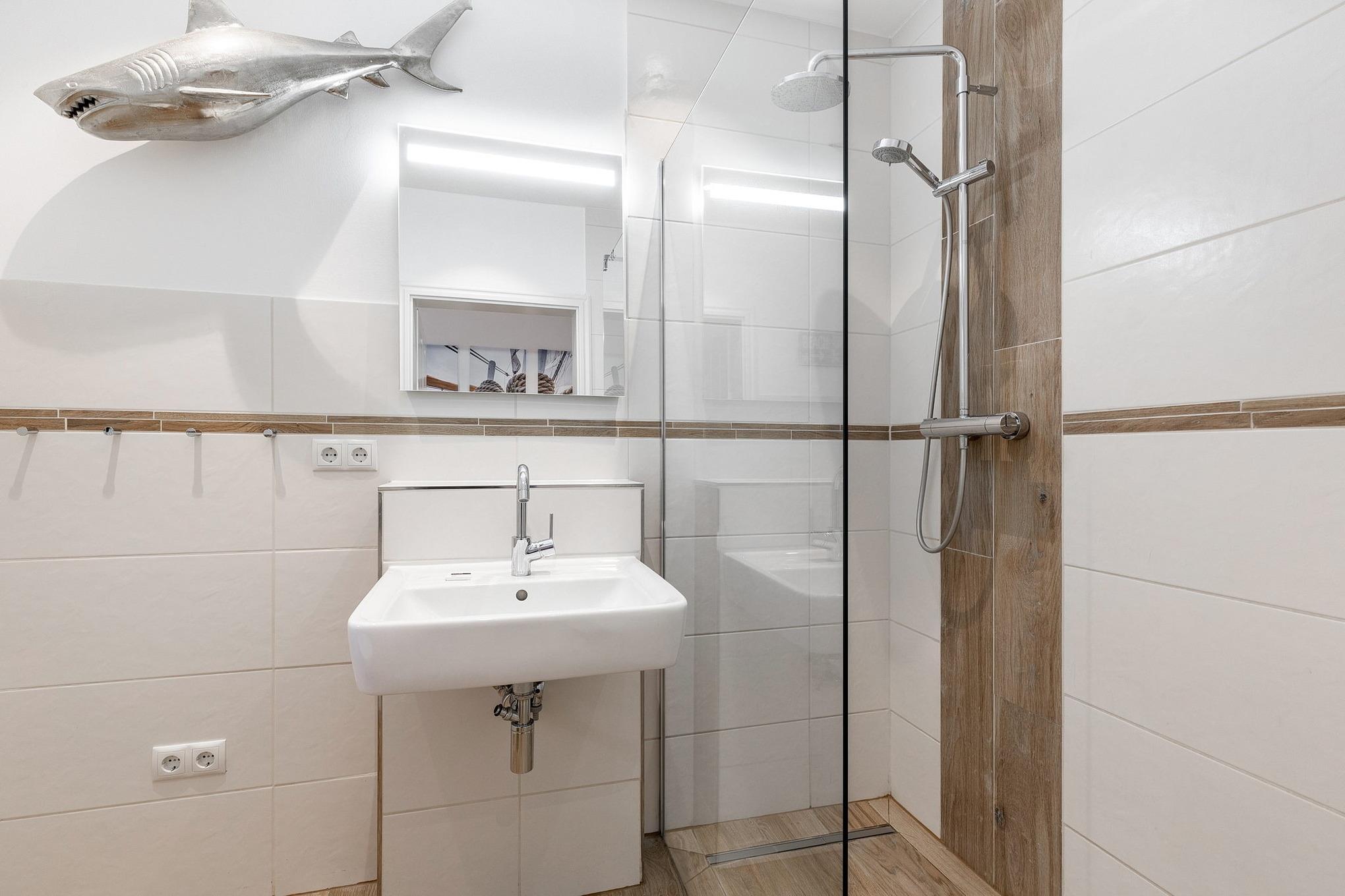 Modernes, freundliches Tageslichtbad mit Dusche, WC und Waschbecken.