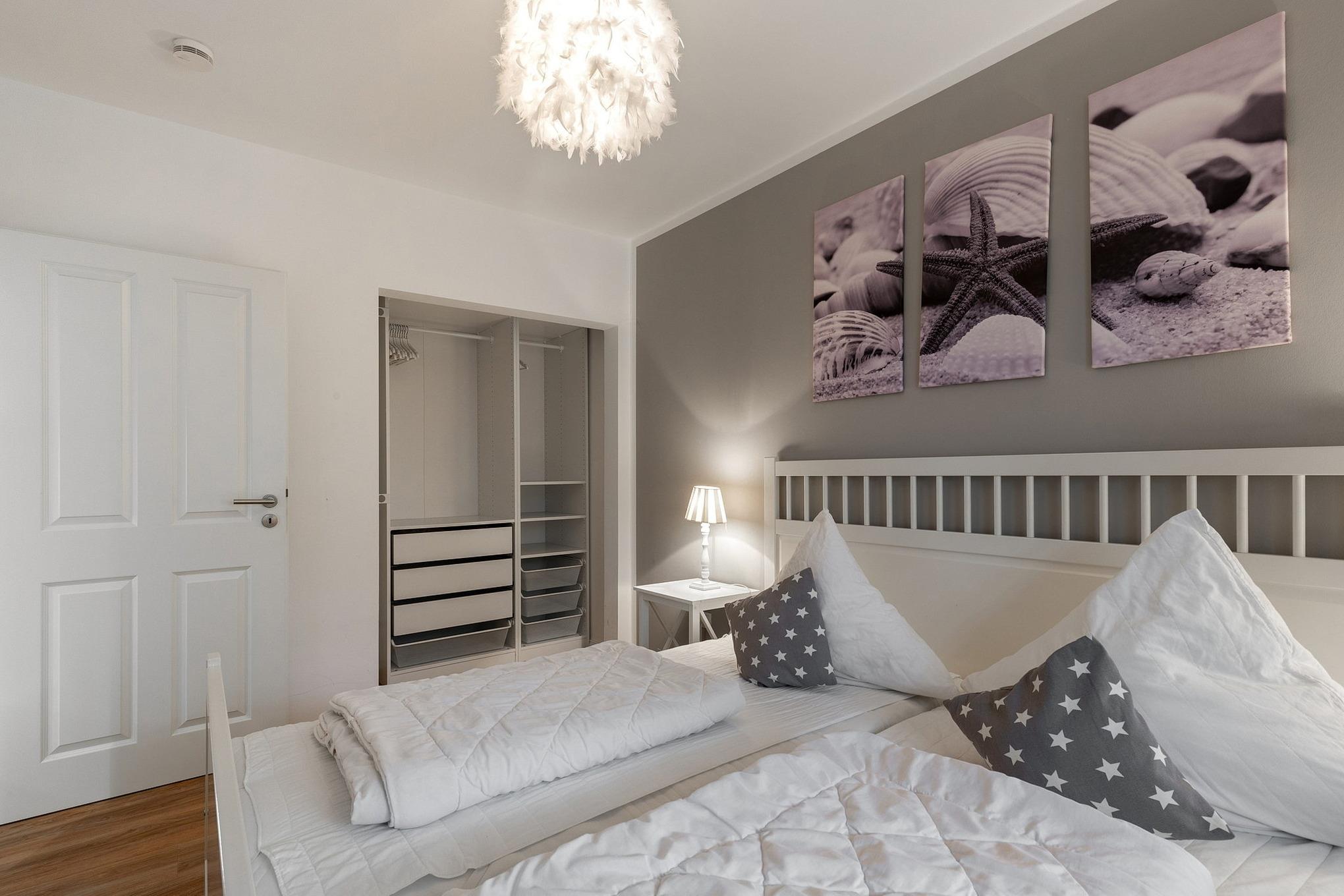 Modernes, geschmackvoll eingerichtetes Schlafzimmer. Das Schlafzimmer ist mit einem Doppelbett (2x 80x200cm), 2 Nachttischen und einem offenen Kleiderschrank ausgestattet. Das Schlafzimmer ist mit Vinylboden ausgelegt, das Fenster zum Laubengang lässt sich durch einen Vorhang etwas verdunkeln.