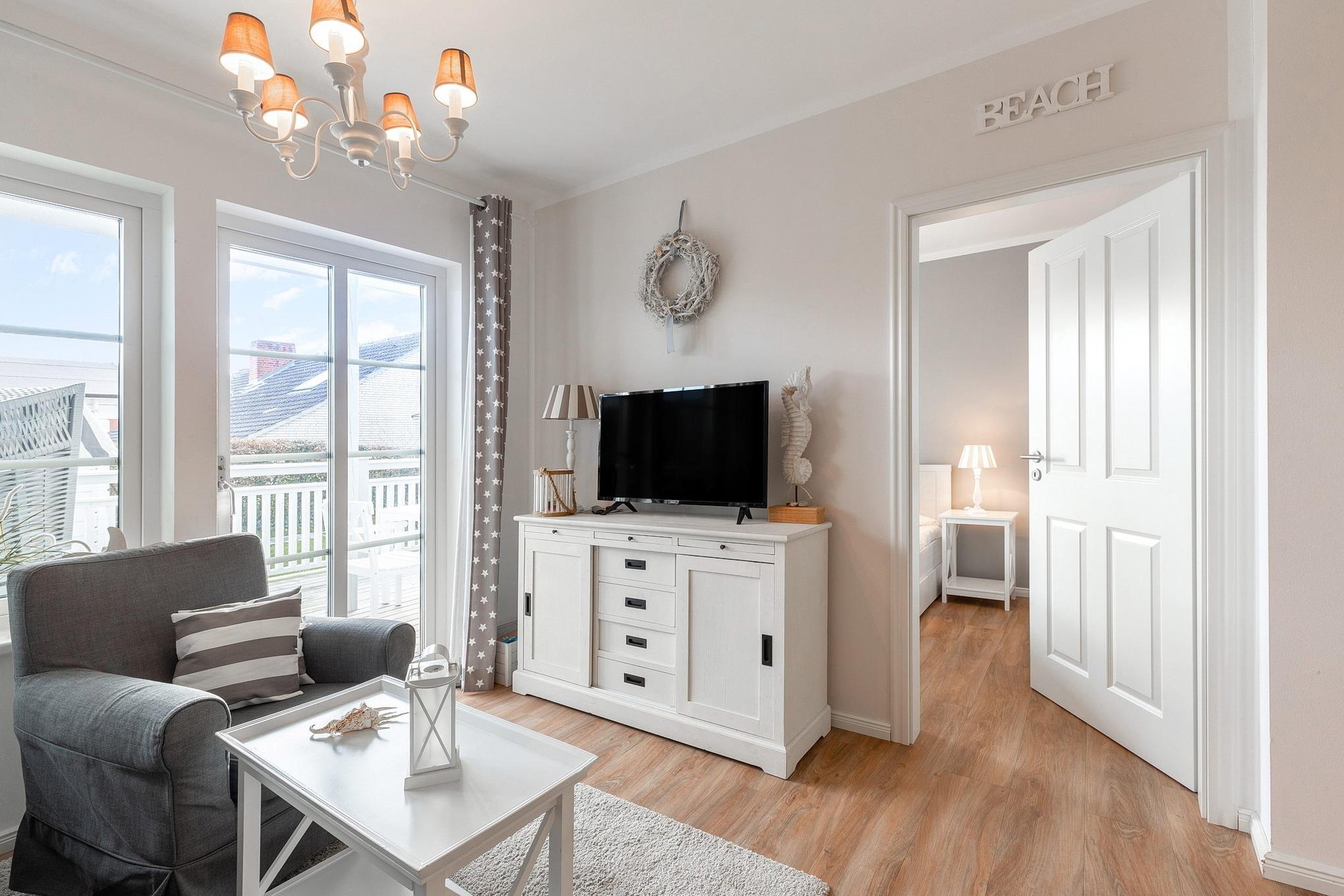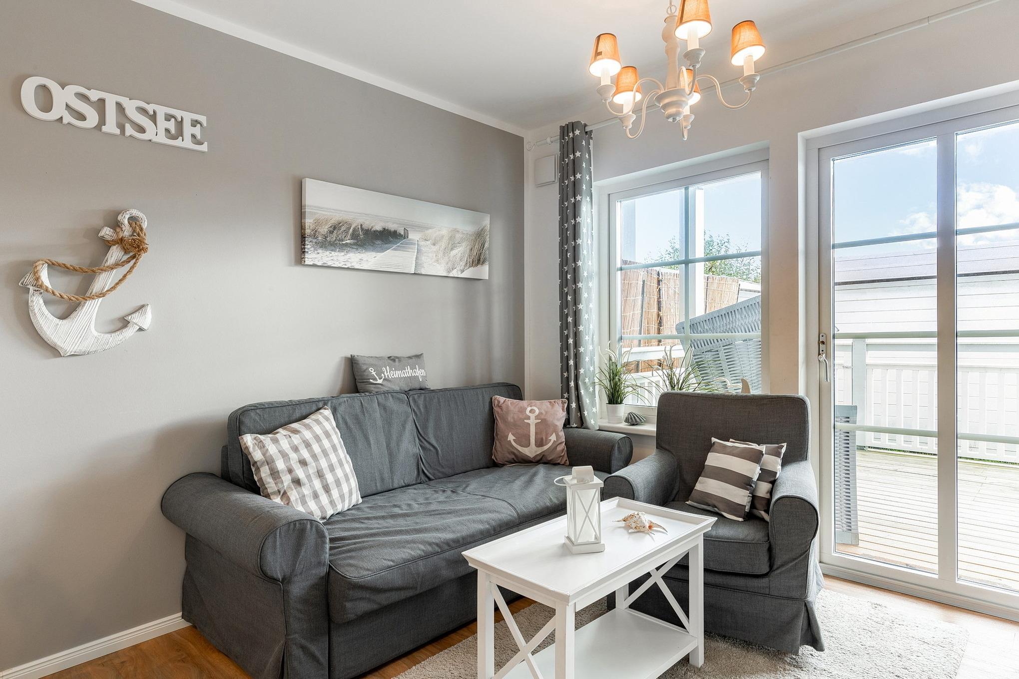Modernes, geschmackvoll eingerichtetes Wohn- und Esszimmer mit Terrassenzugang. Das Wohn- und Esszimmer ist mit einem Sofa, einem Sessel, einer Kommode und einem Essplatz für 4 Personen ausgestattet. Das Zimmer ist mit Vinylboden ausgelegt. Zur Unterhaltung steht ein Sat-Fernseher zur Verfügung.