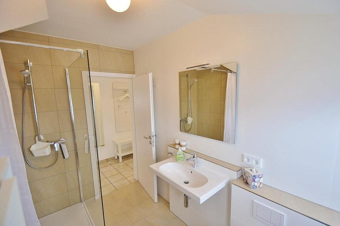 Hell gefliestes modernes Tageslichtbad mit Dusche, Waschbecken und WC.