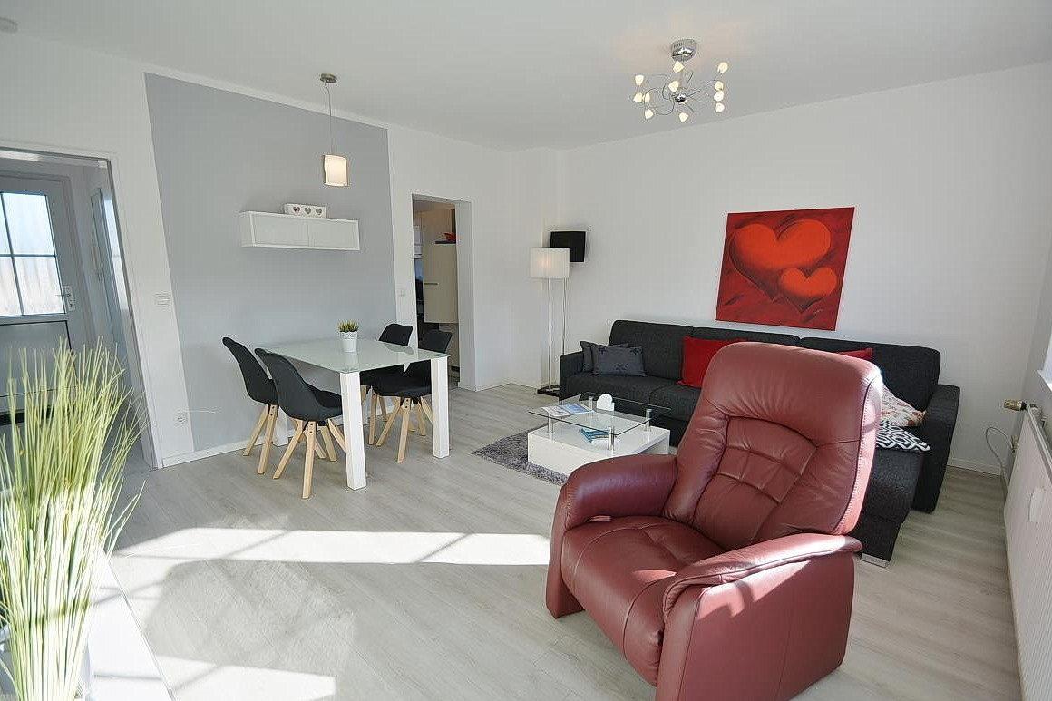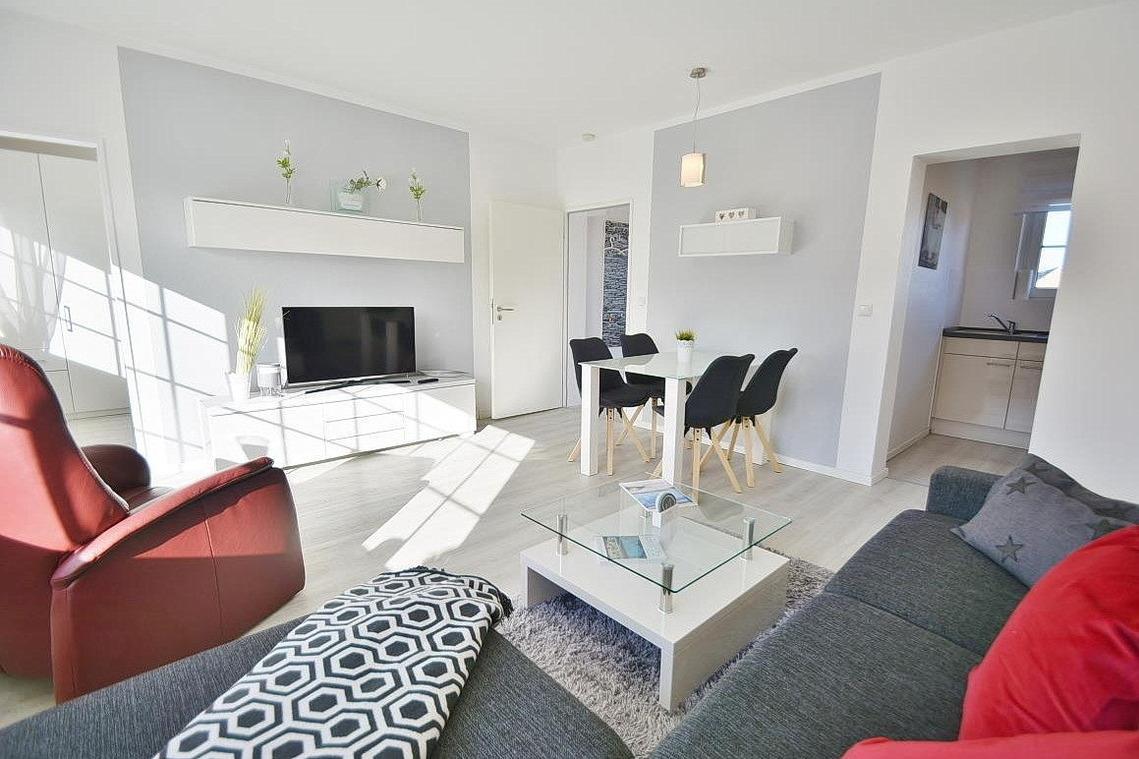 Das helle moderne Wohn- und Esszimmer mit direktem Zugang zum Balkon ist mit einer gemütliche Eckcouch mit Schlaffunktion (150x200cm mit Lattenrost), einem Relax-Sessel sowie einem Essplatz für 4 Personen ausgestattet. Zur Unterhaltung steht ein Flachbildfernseher zur Verfügung. Das Wohnzimmer ist mit Designer-Planken ausgelegt und lässt sich durch ein Rollo verdunkeln.