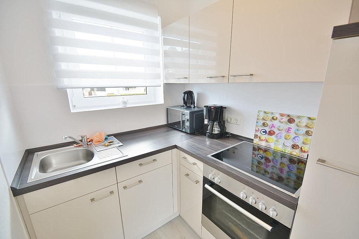 Die separate Küche verfügt über ein 4-Platten Cerankochfeld, einen Backofen sowie einen Kühlschrank mit kleinem 3 Sterne Gefrierfach. Des Weiteren ist sie mit einem Wasserkocher und einem Toaster ausgestattet.