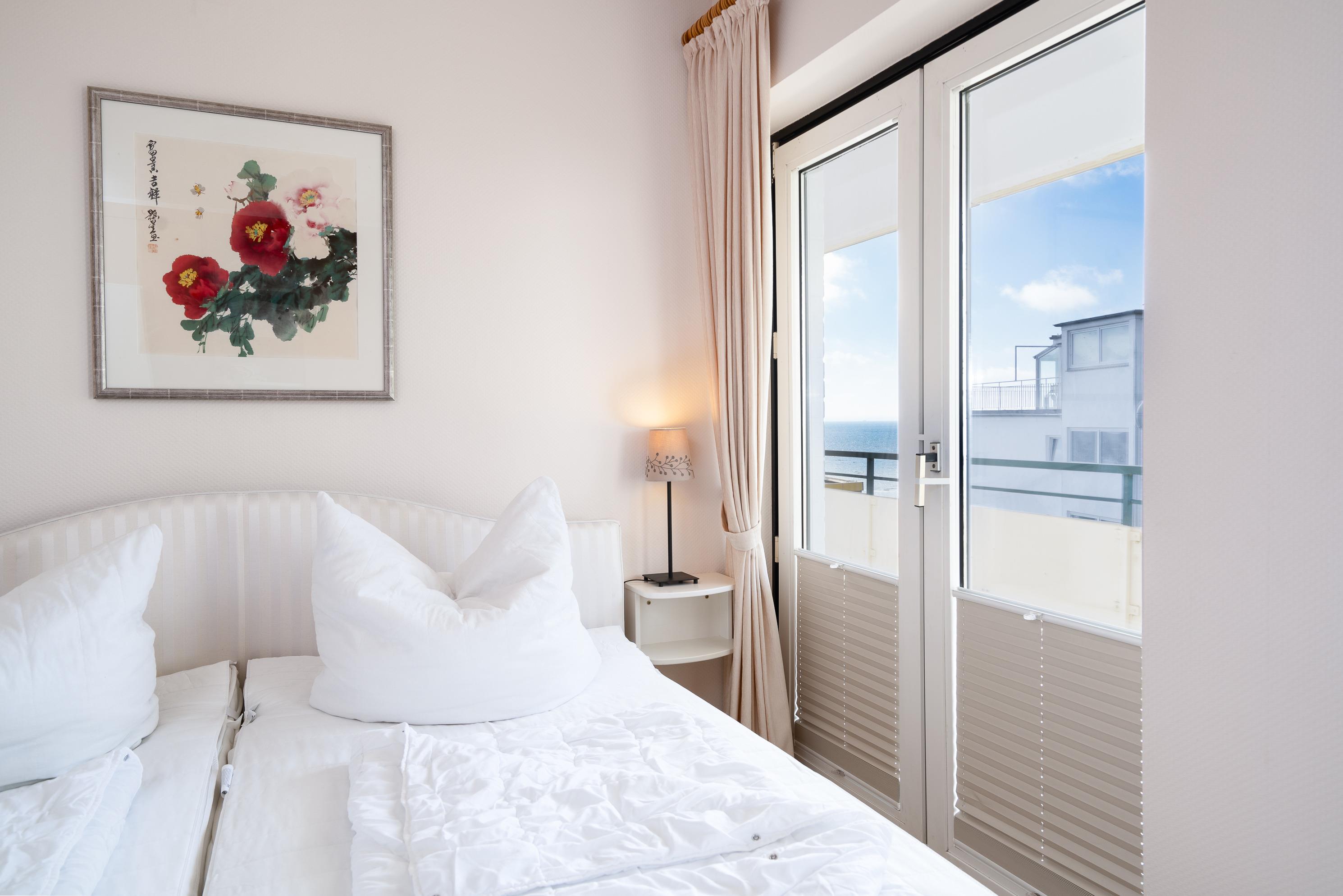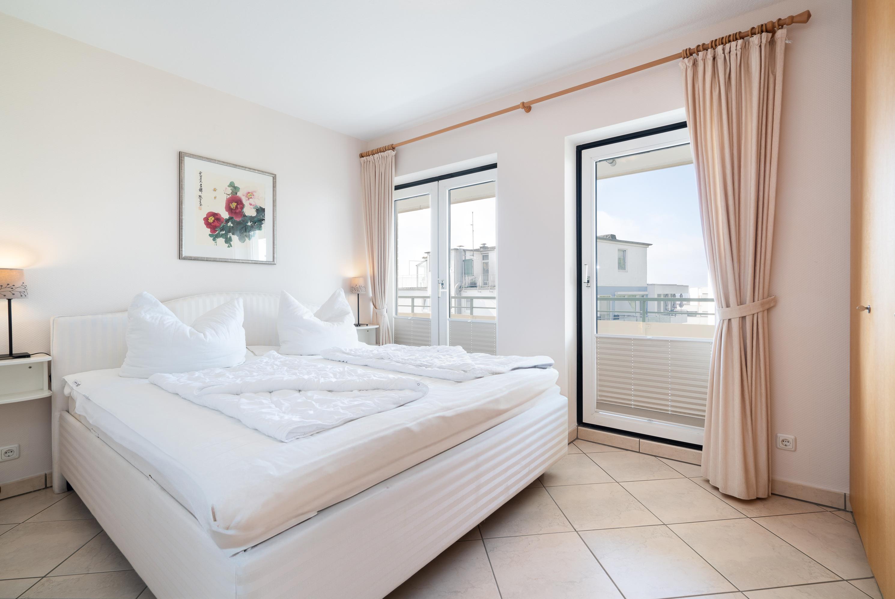 Vom Schlafzimmer ist der große Balkon ebenfalls begehbar. Der Raum verfügt über ein Doppelbett und lässt sich durch Vorhänge verdunkeln.