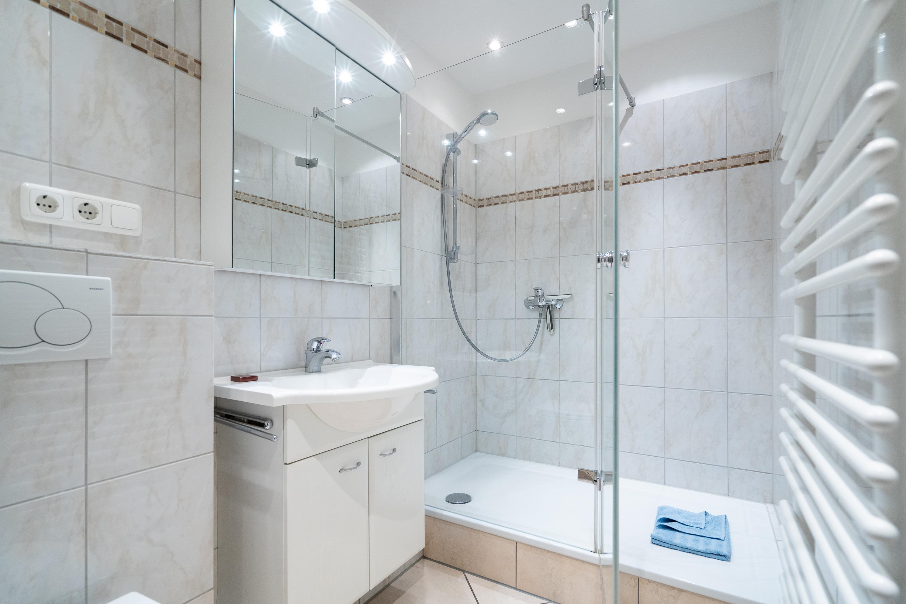 Freundlich helles Badezimmer mit Dusche, WC und Waschbecken.