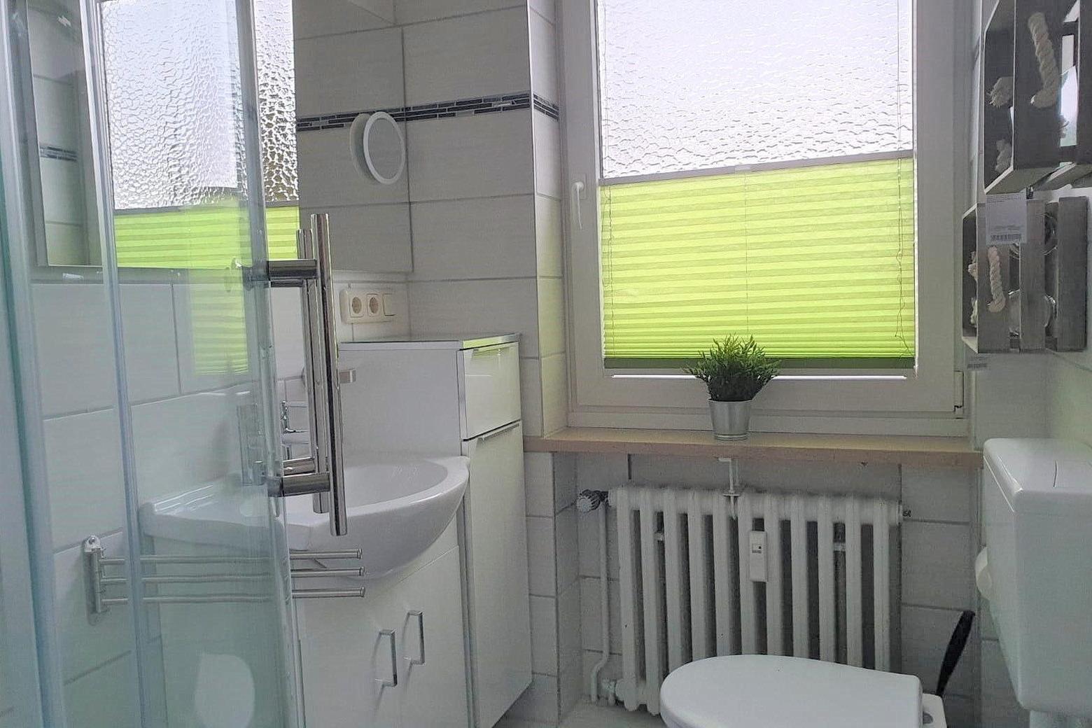 Modernes helles Tageslichtbad mit Dusche, Waschbecken und WC.
