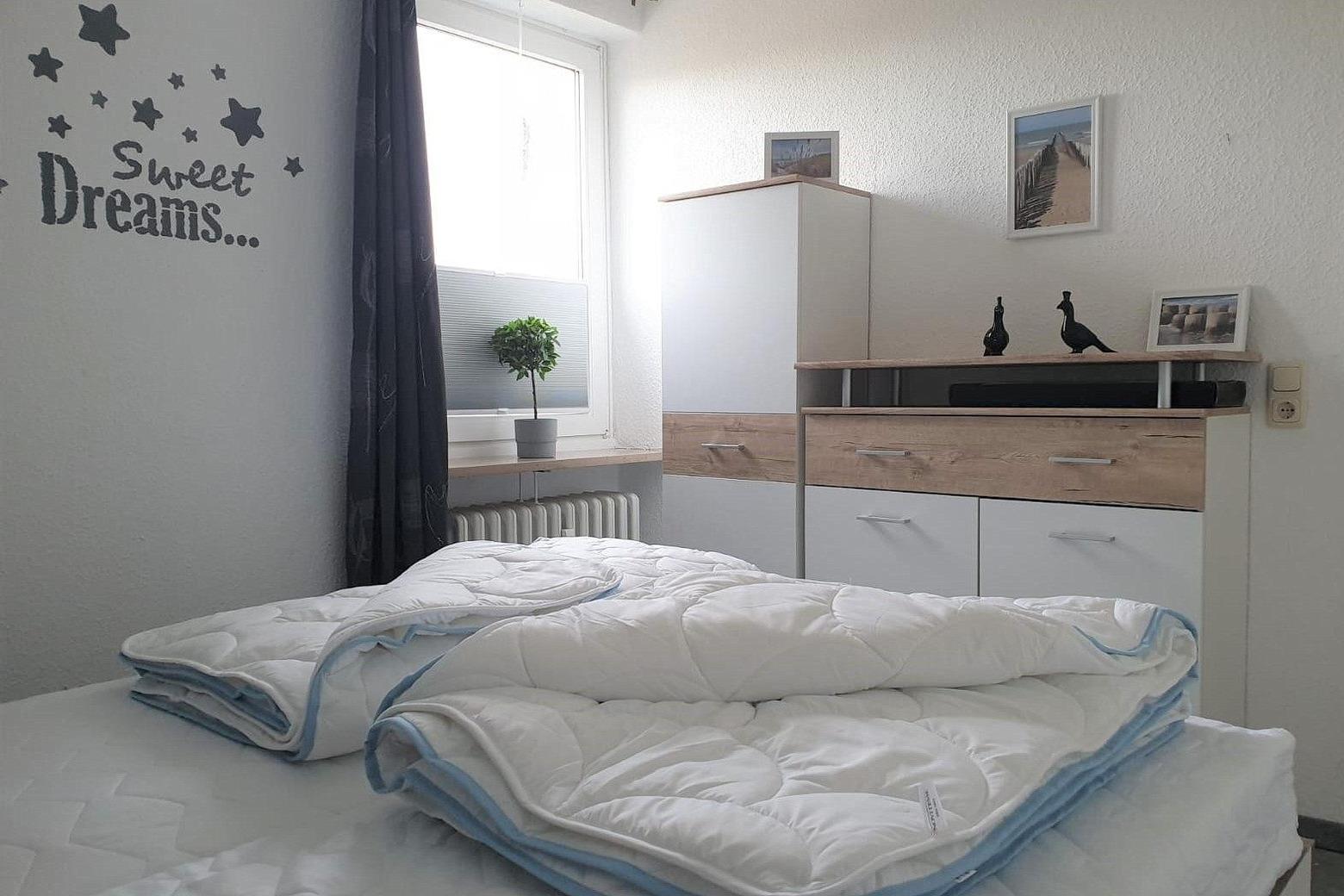 Gemütliches Schlafzimmer mit einem Doppelbett (2x80x200cm) und einem kleinen Kleiderschrank. Der Raum ist mit Vinylboden ausgelegt. Das Fenster lässt sich durch ein Plissee und eine Verdunklungsgardine abdunkeln.