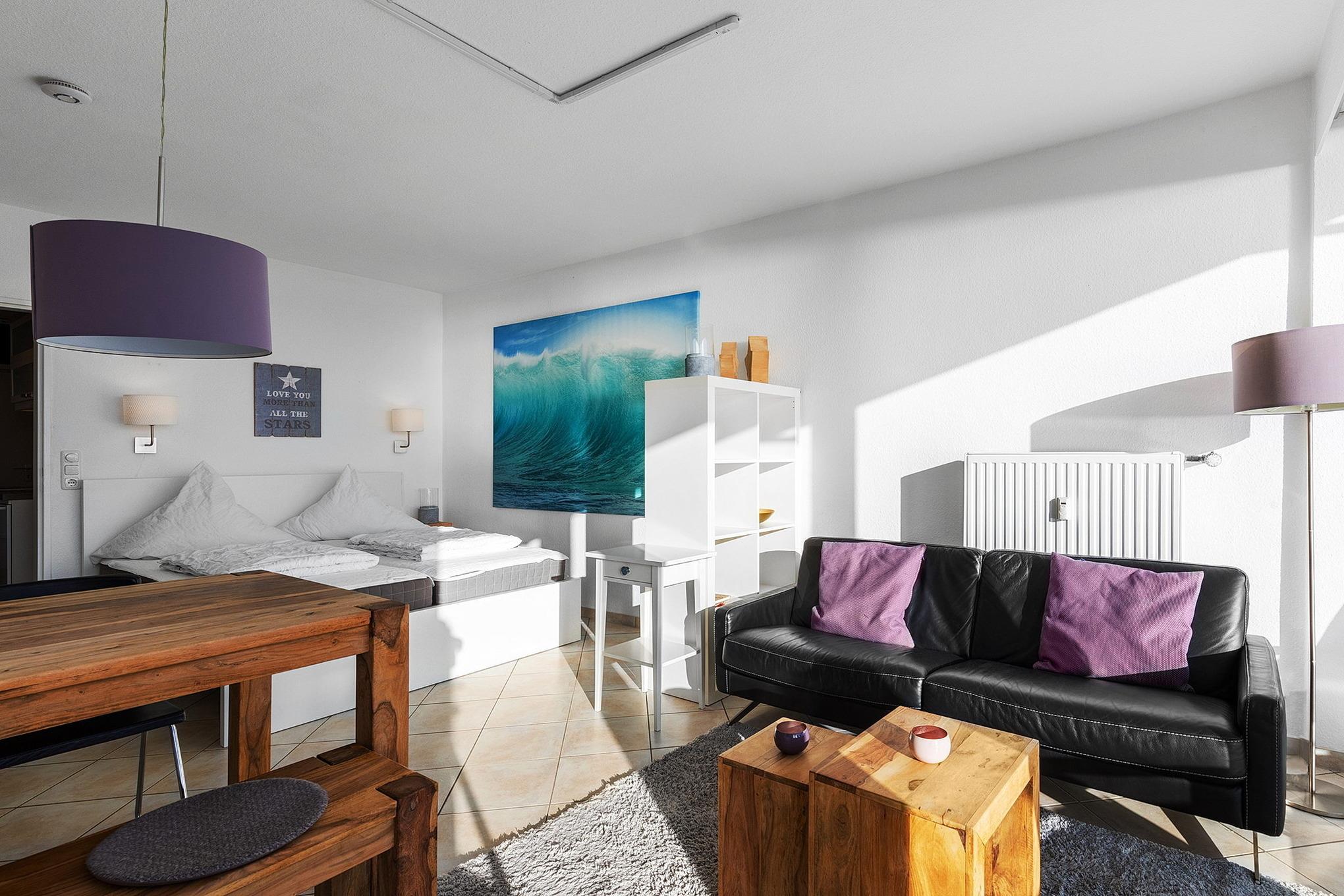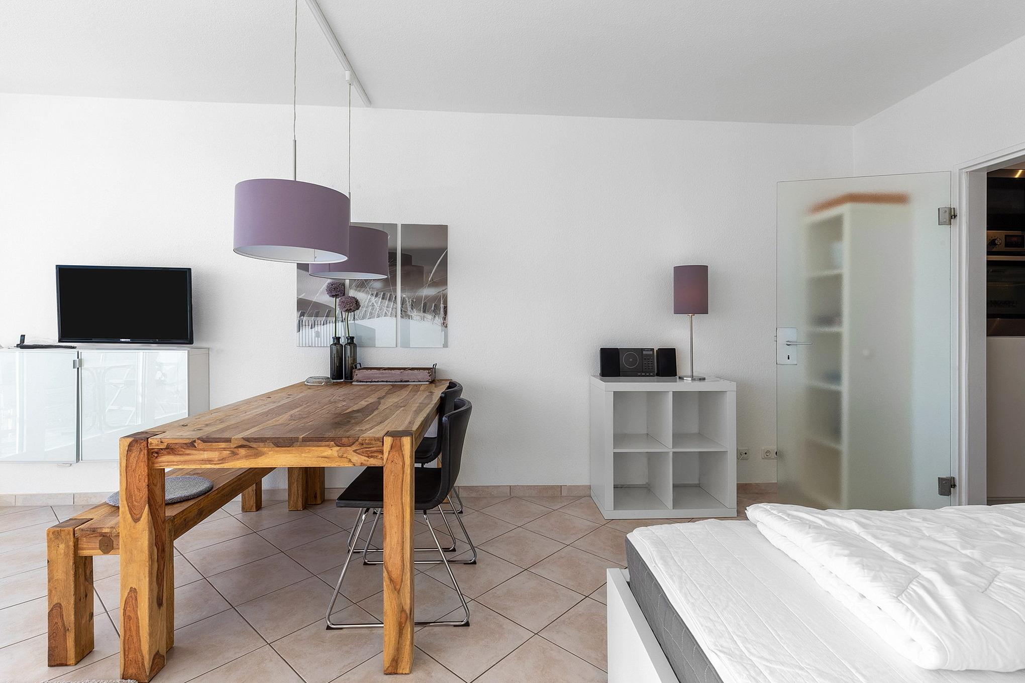 Modern eingerichtetes, helles, freundliches Wohn- und Schlafzimmer mit direktem Zugang zum Balkon. Das Wohn- und Schlafzimmer ist mit einem Essplatz für 4 Personen, einer Ledercouch, einem Couchtisch, einem Regal und einem Doppelbett (2x 80x200cm) ausgestattet. Ein Schlafsessel (80x200cm), sowie ein 4-türiger Kleiderschrank befinden sich im Vorraum der Wohnung. Zur Unterhaltung stehen ein Flachbildfernseher, ein DVD-Player und ein Radiorecorder mit CD-Player zur Verfügung. Das Wohn- und Schlafzimmer ist gefliest. Die Fenster lassen sich durch Vorhänge und Plissees vollständig verdunkeln.
