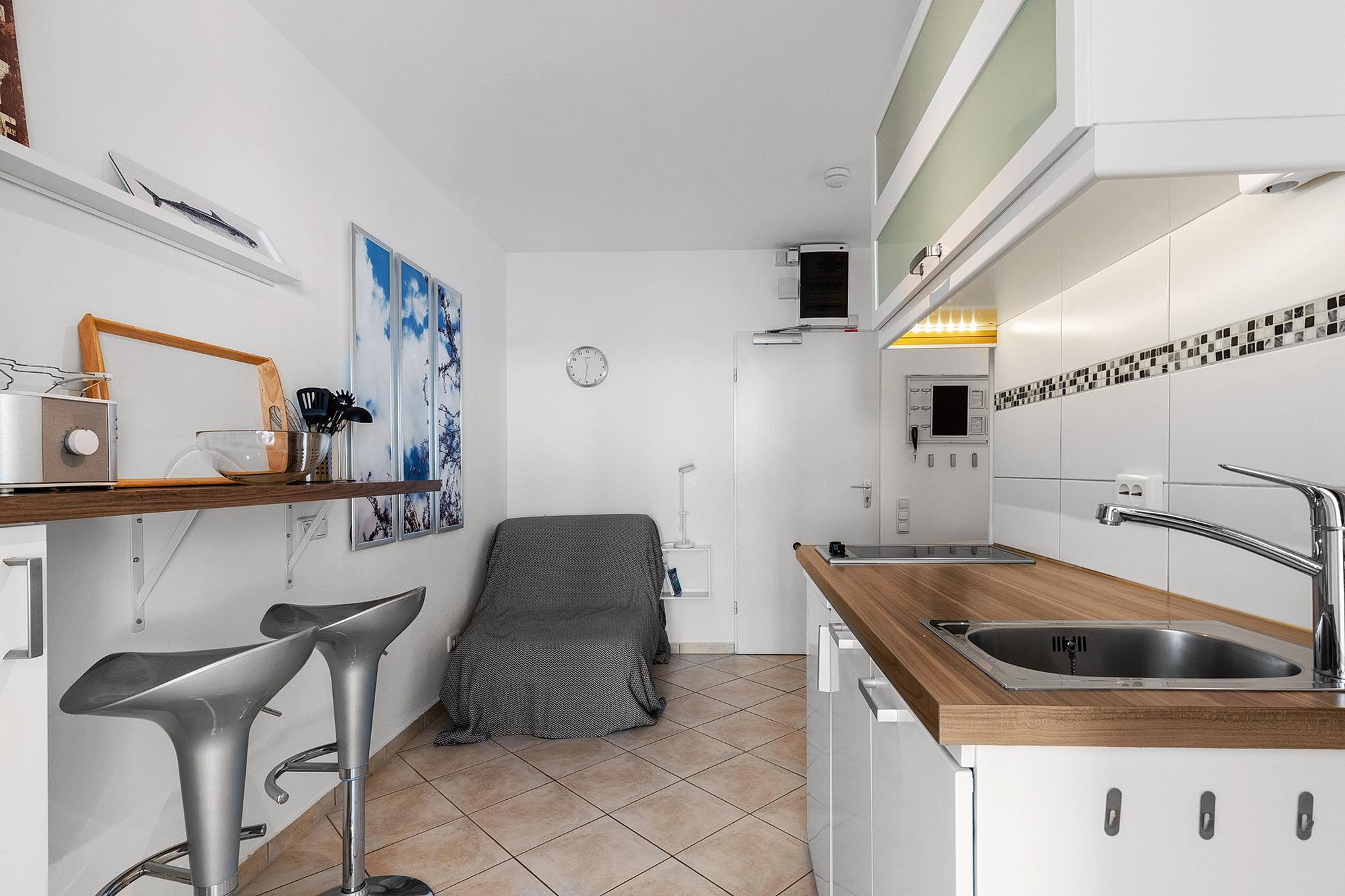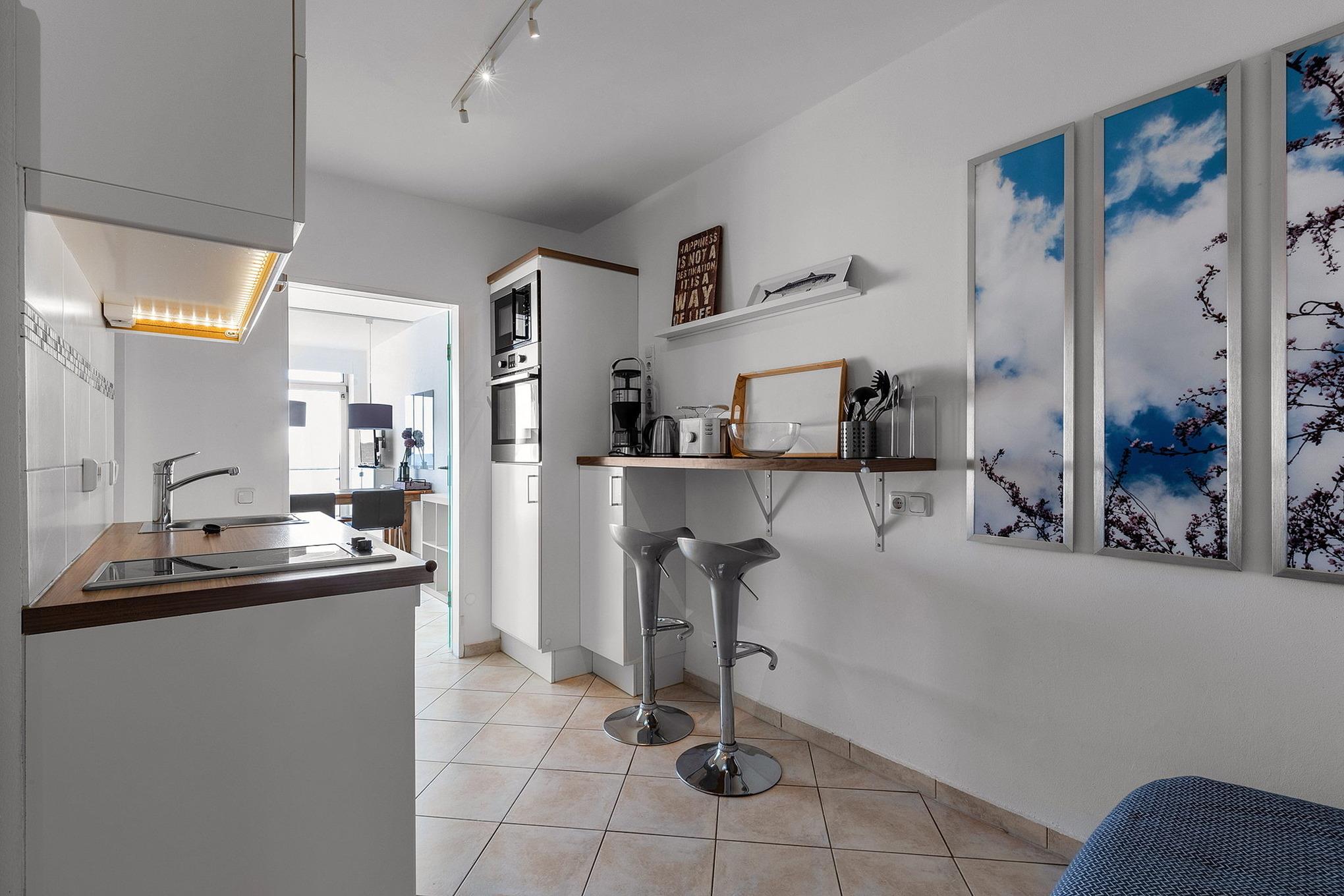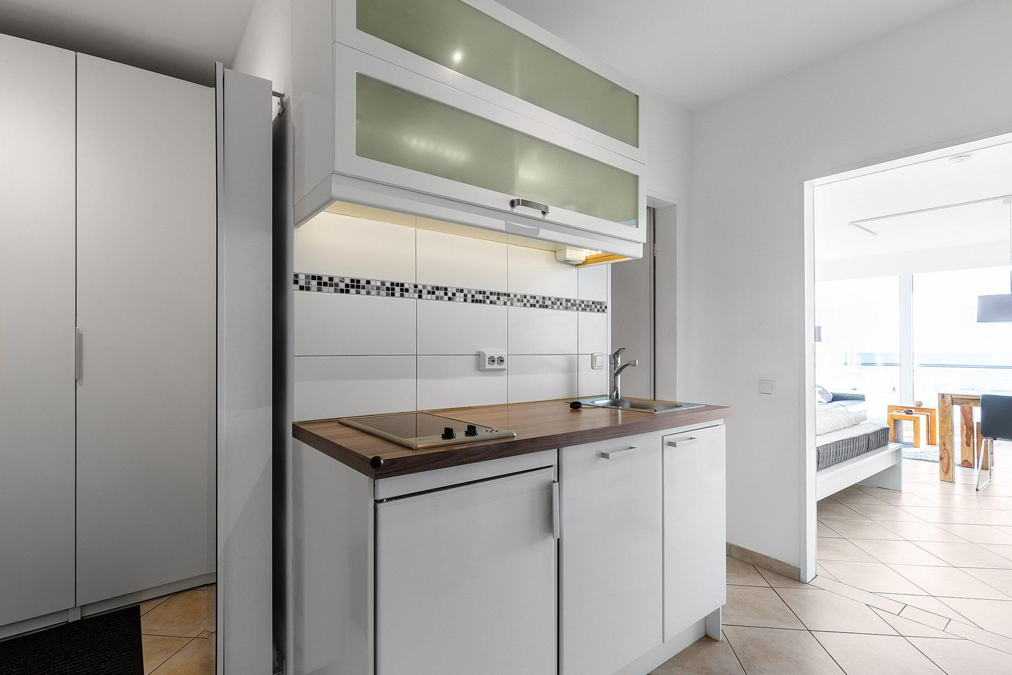 Moderne, komplett eingerichtete Pantryküche mit 2-Platten Cerankochfeld, Backofen, Spülmaschine, Kühlschrank mit kleinem 3-Sterne Gefrierfach, Mikrowelle, Toaster, Kaffeemaschine und Wasserkocher.