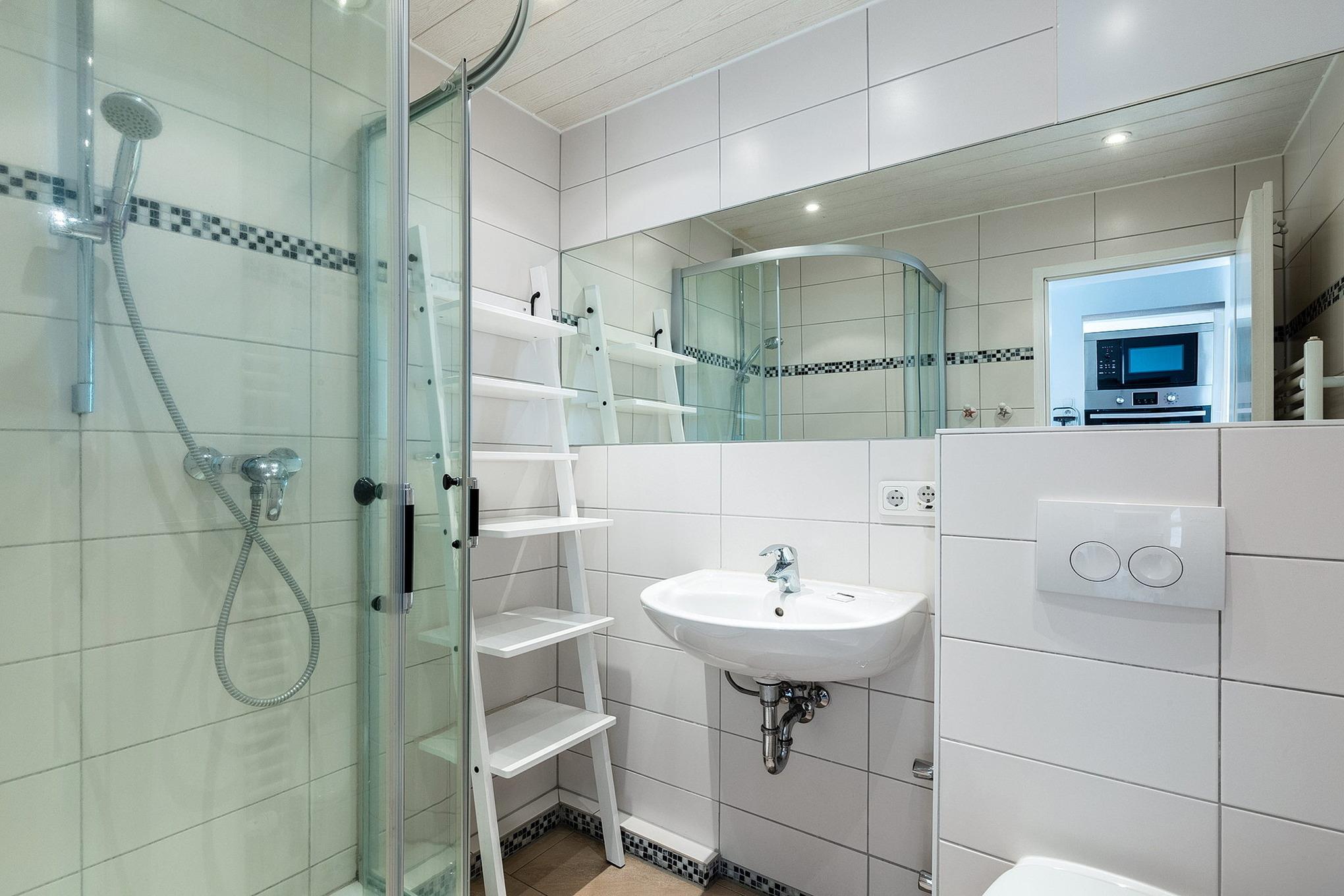 Das moderne, hell geflieste Bad ist mit Dusche, Waschbecken und WC ausgestattet.