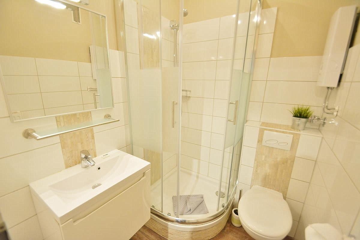 Modernes, freundliches, hell gefliestes Bad mit Dusche, Toilette und Waschbecken.