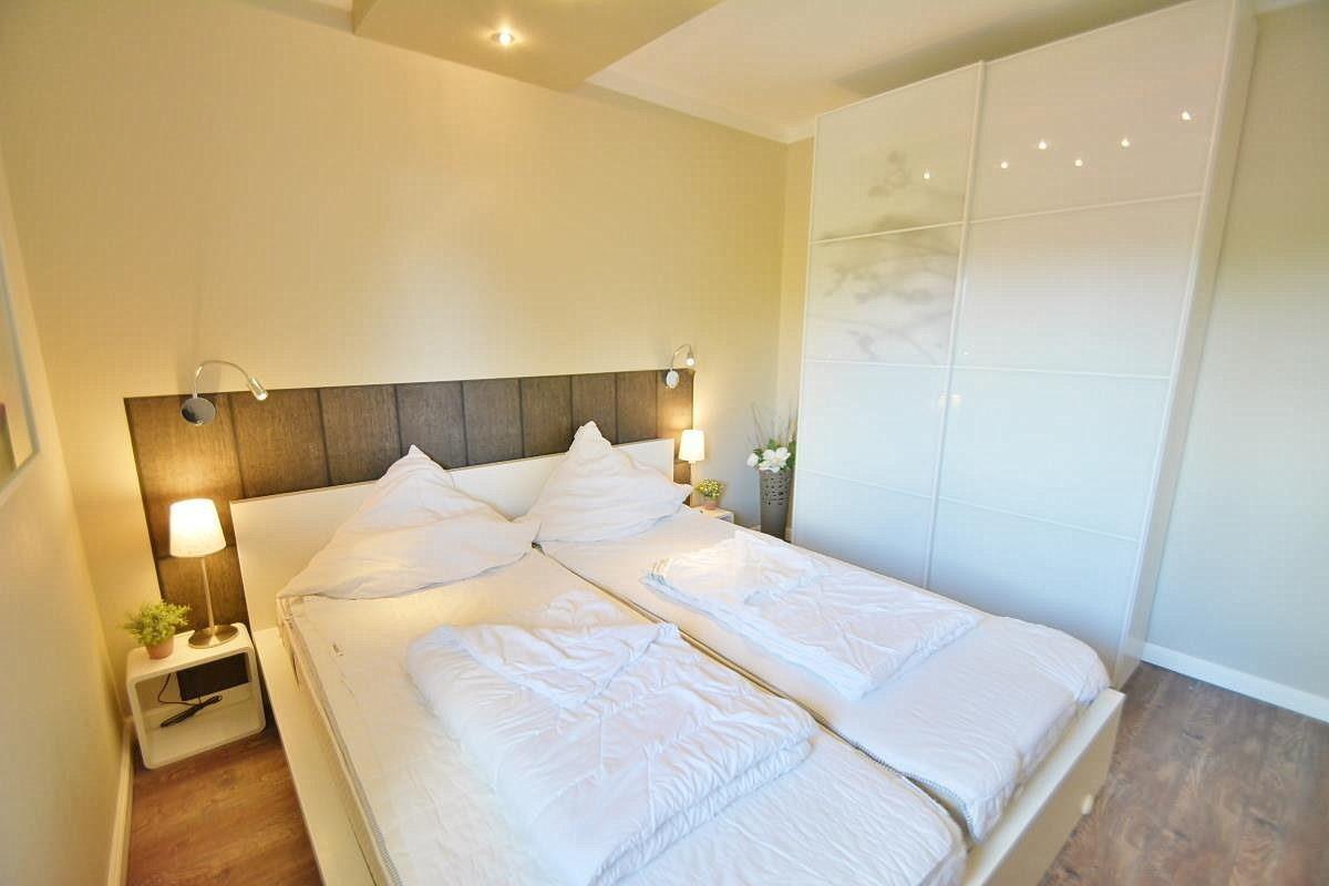 Modernes, geschmackvoll eingerichtetes Schlafzimmer. Das Zimmer ist mit einem Doppelbett (2x 90x200cm) und einem Kleiderschrank ausgestattet. Das Schlafzimmer ist mit Designer-Planken (Holzoptik) ausgelegt. Das Fenster zum Laubengang lässt sich durch eine Jalousie etwas abdunkeln.