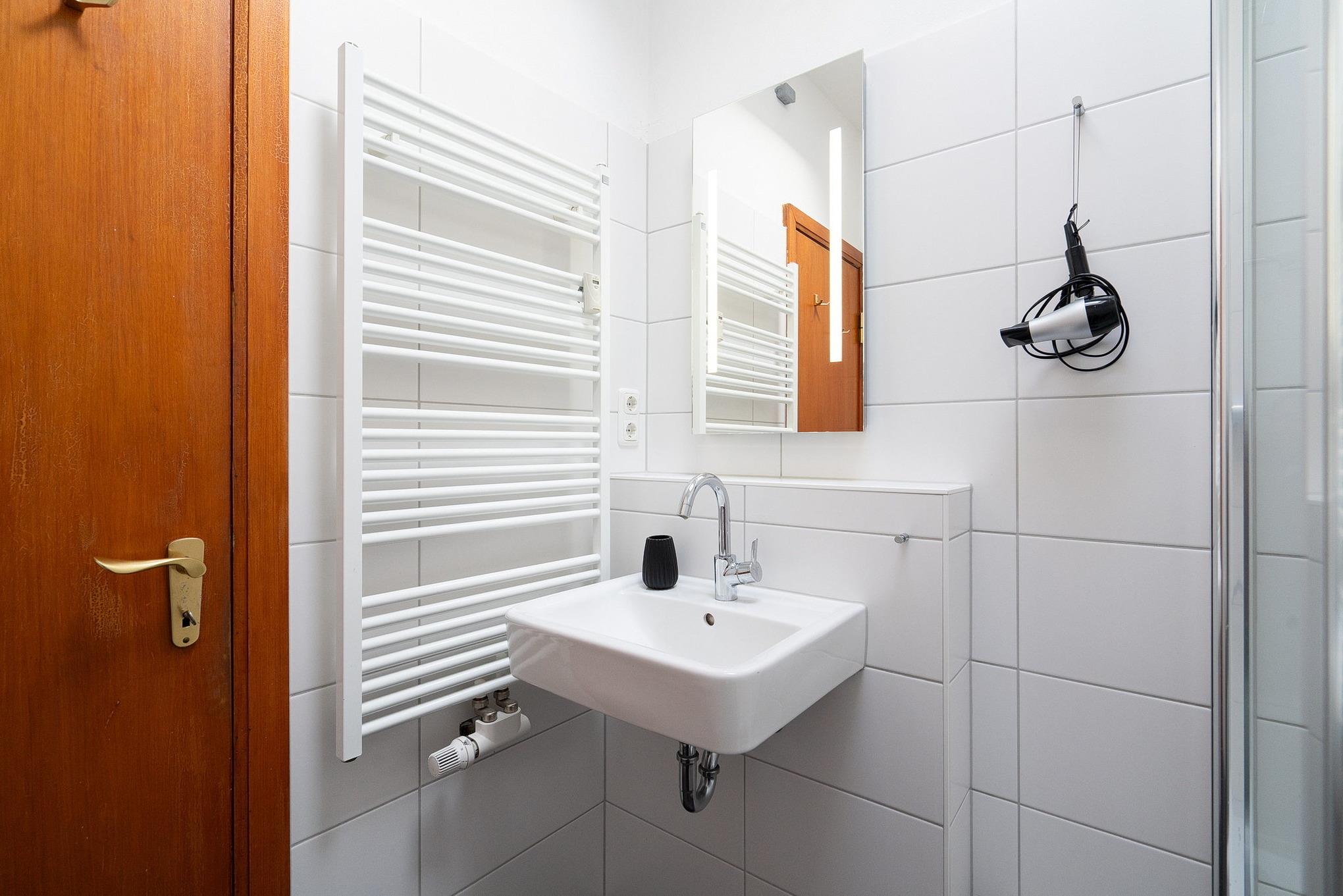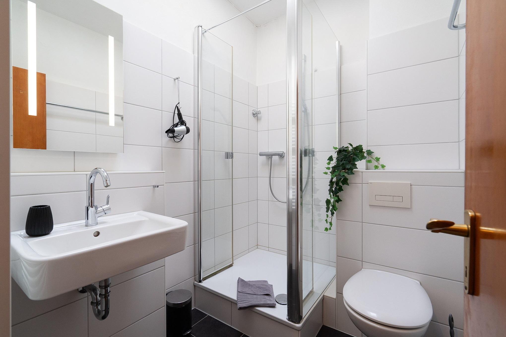 Modernes, renoviertes, hell gefliestes Tageslichtbad mit Dusche, WC und Waschbecken.
