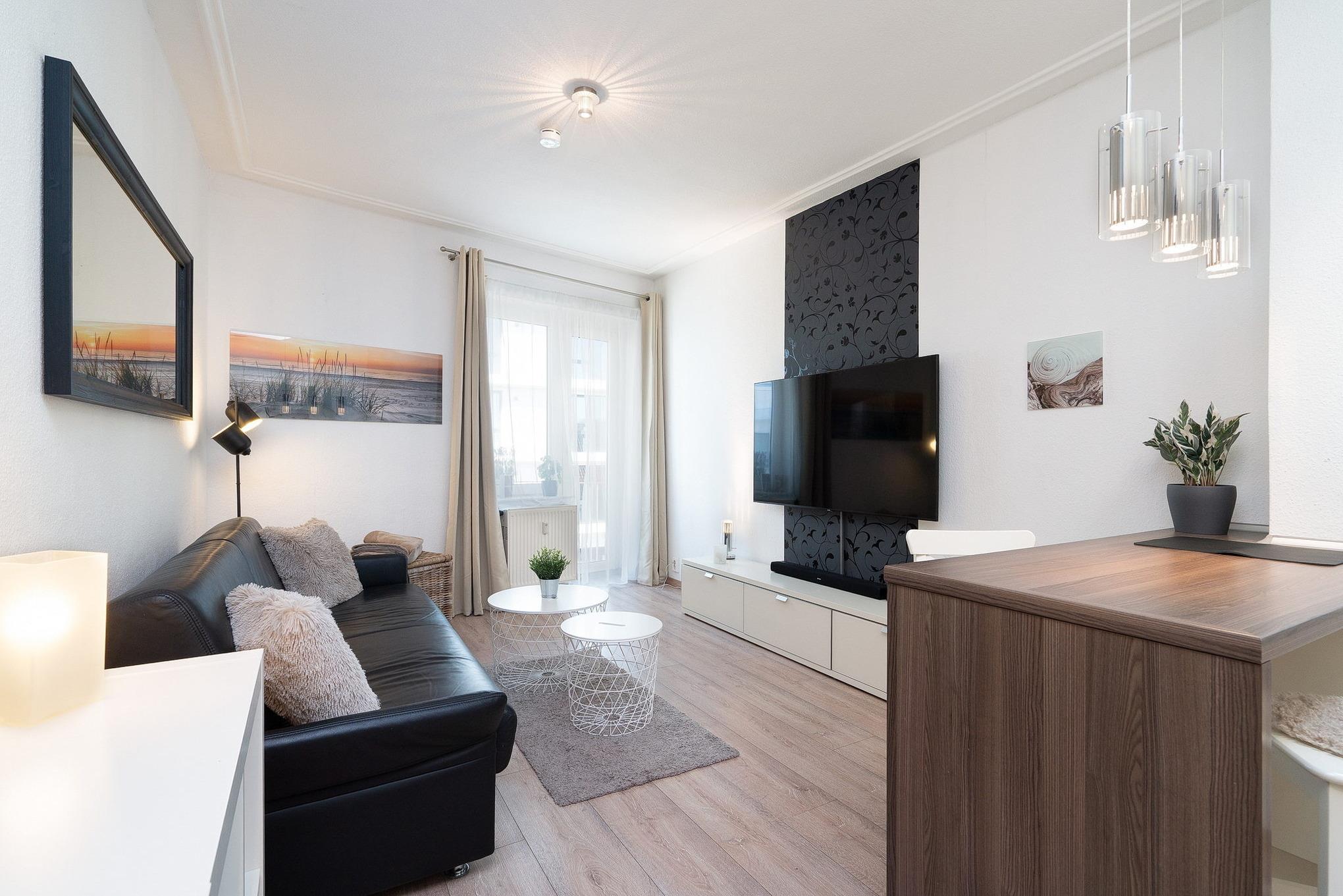 Komplett renoviertes Wohn- und Schlafzimmer mit direktem Zugang zum Balkon. Das Wohn- und Schlafzimmer ist mit einer Schlafcouch mit einer hochwertigen Matratze (160 x 200cm), einer Kommode und einem Essplatz für 2 Personen ausgestattet. Ein 2-türiger Kleiderschrank steht im Flur zur Verfügung. Zur Unterhaltung stehen ein 60" Samsung Tv auf einem Lowboard und eine Bluetooth Soundbar. Das Wohn- und Schlafzimmer ist mit modernem Laminatboden ausgelegt. Das Fenster lässt sich durch einen Vorhang etwas verdunkeln.