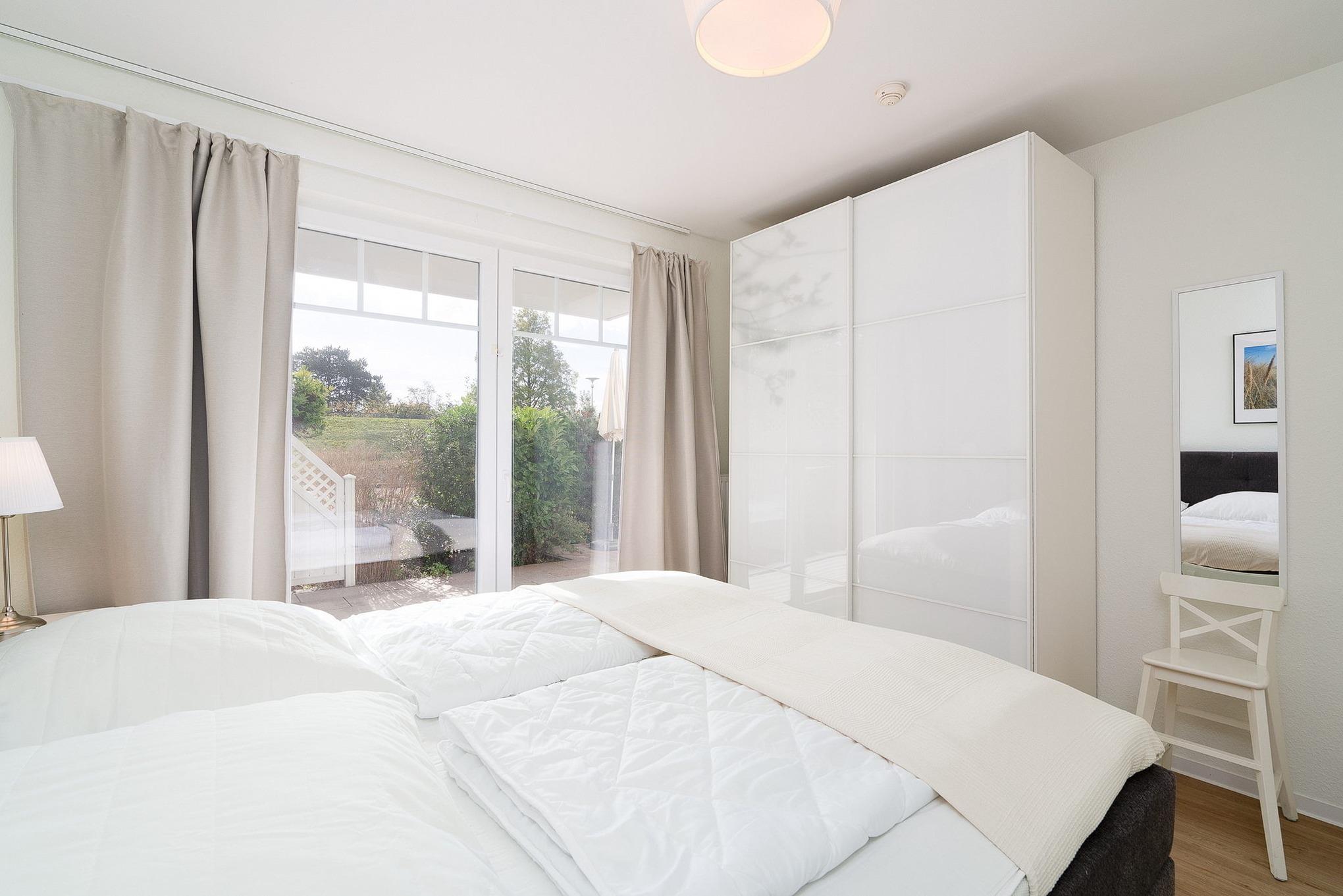 Das einfach eingerichtete Schlafzimmer ist mit einem Doppelbett (180x200cm) und einem Kleiderschrank ausgestattet. Das Fenster lässt sich vollständig verdunkeln.
