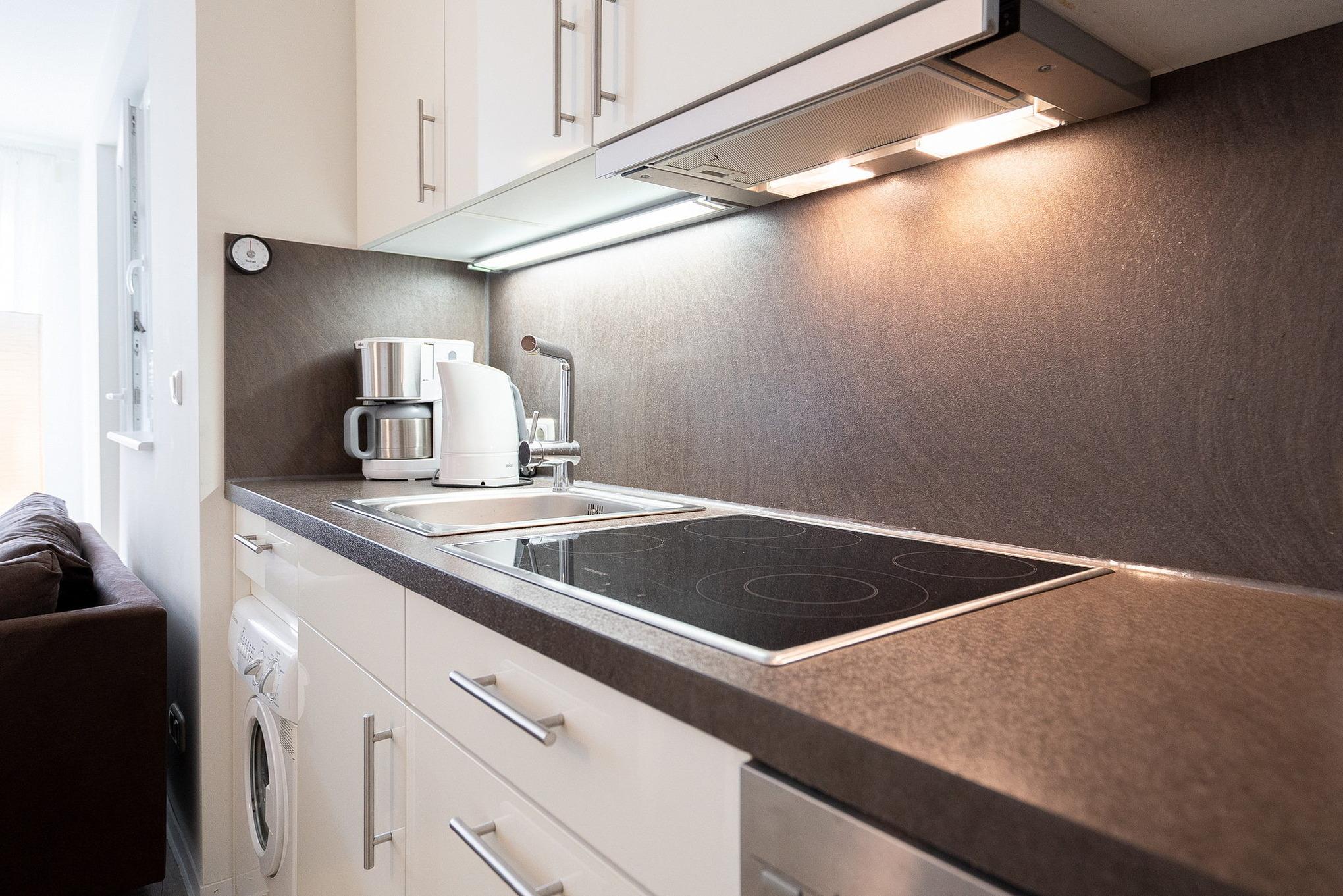 Moderne, komplett eingerichtete, zum Wohn- und Esszimmer offen Küche mit 4 Platten-Cerankochfeld, Backofen, Spülmaschine, Mikrowelle, Kühlschrank mit kleinem 3-Sterne Gefrierfach, Kaffeemaschine, Wasserkocher und Toaster. Außerdem befindet sich in der Küche eine kleine Waschmaschine.