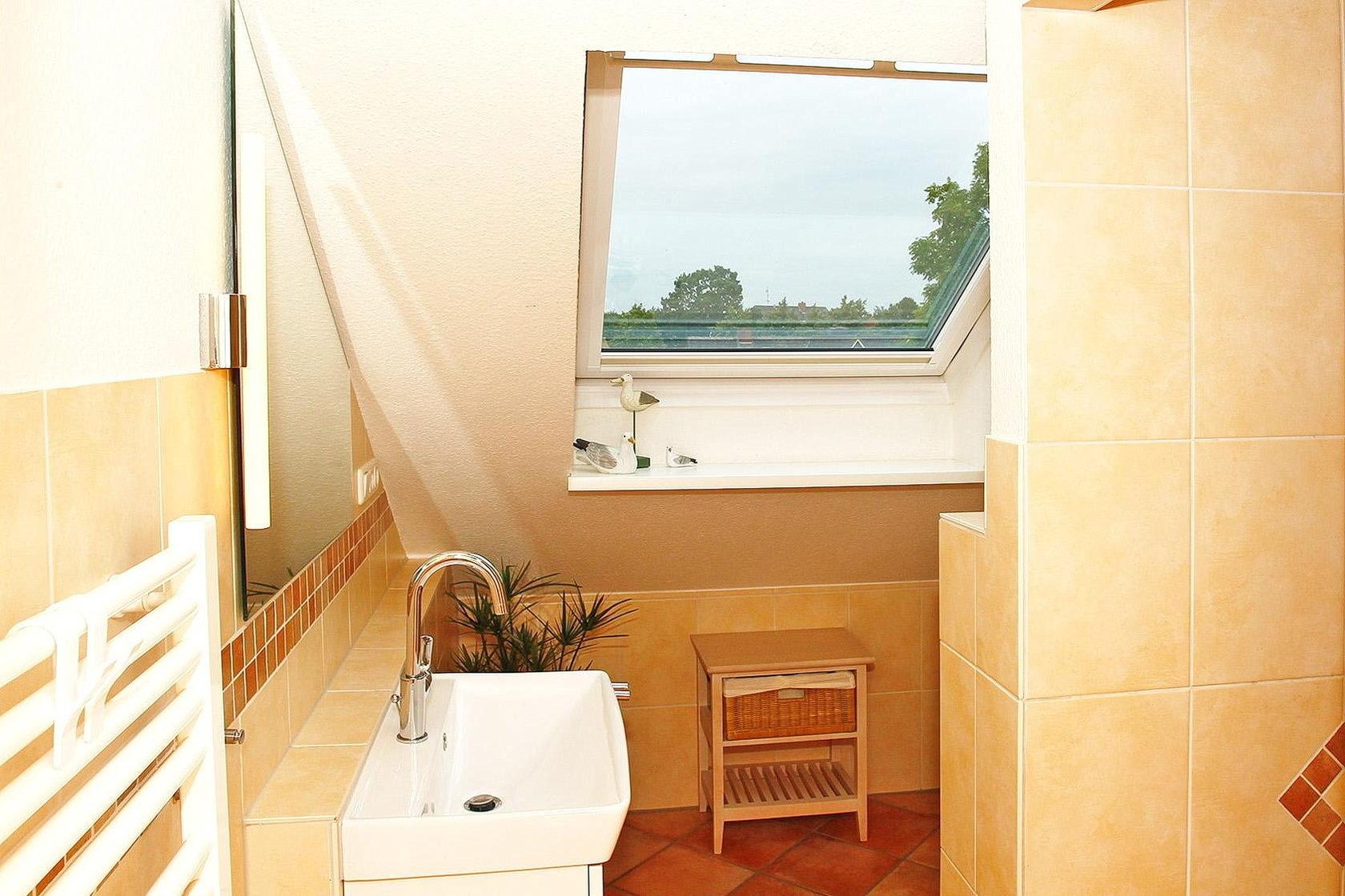 Modernes Tageslichtbad mit Dusche, Toilette und Waschbecken.