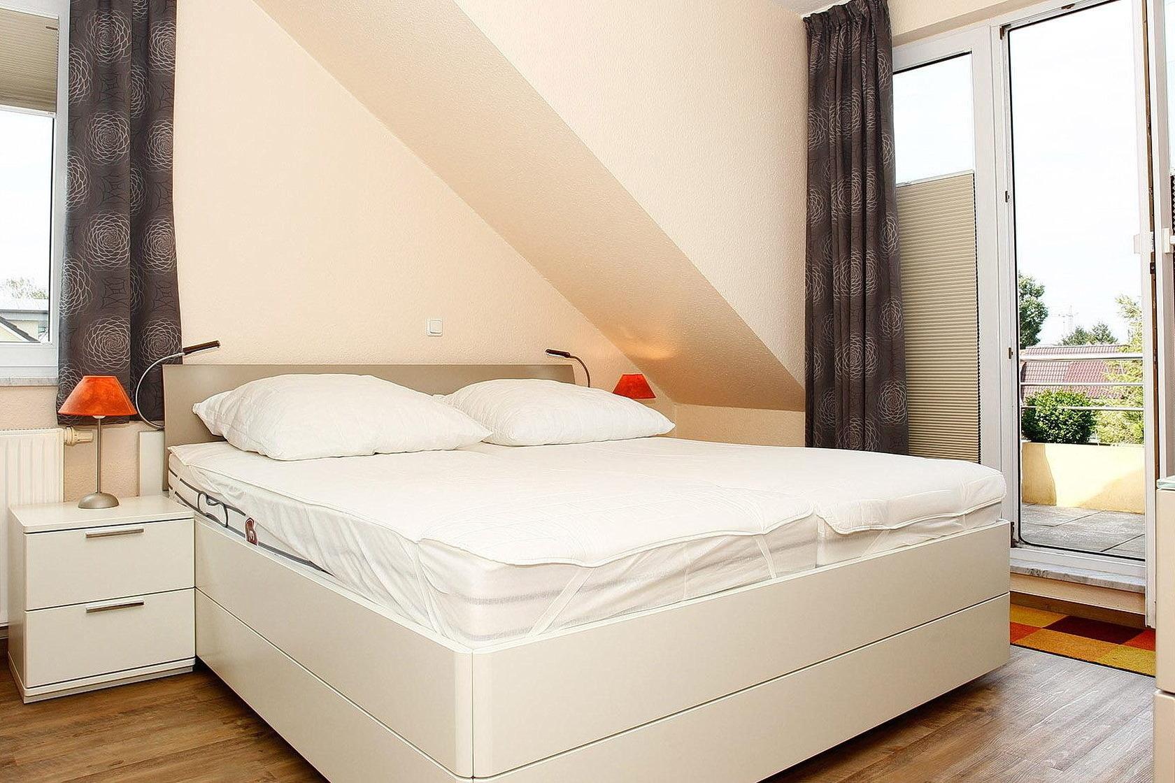 Modernes, freundliches Schlafzimmer mit direktem Zugang zum Balkon in nord-westliche Richtung. Das Schlafzimmer ist mit einem Doppelbett (2x 90x200cm), 2 Nachttischen, einem Stuhl und einem Kleiderschrank ausgestattet. Das Zimmer ist mit Laminatboden ausgelegt, die Fenster lassen sich durch einen blickdichten Vorhang verdunkeln.