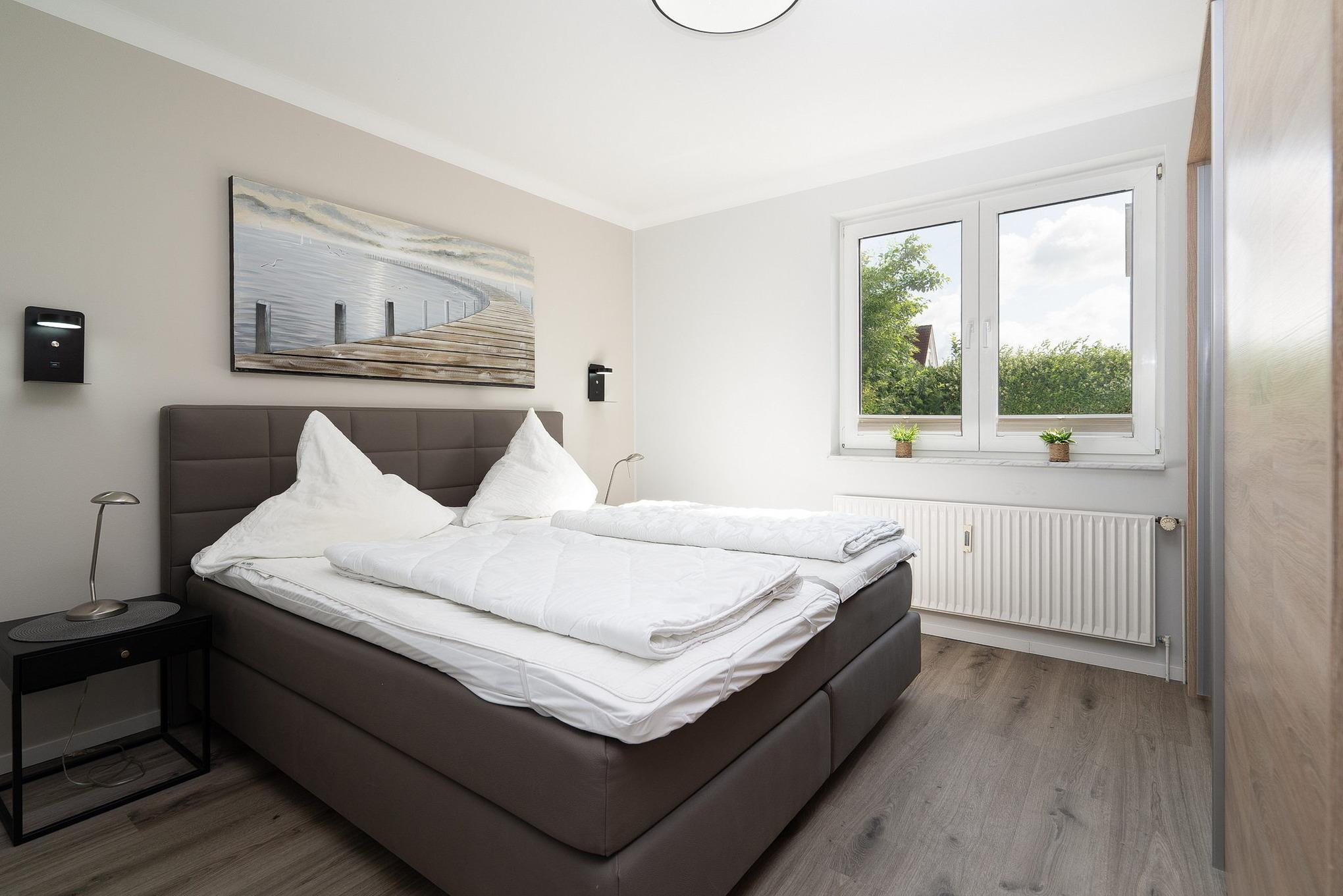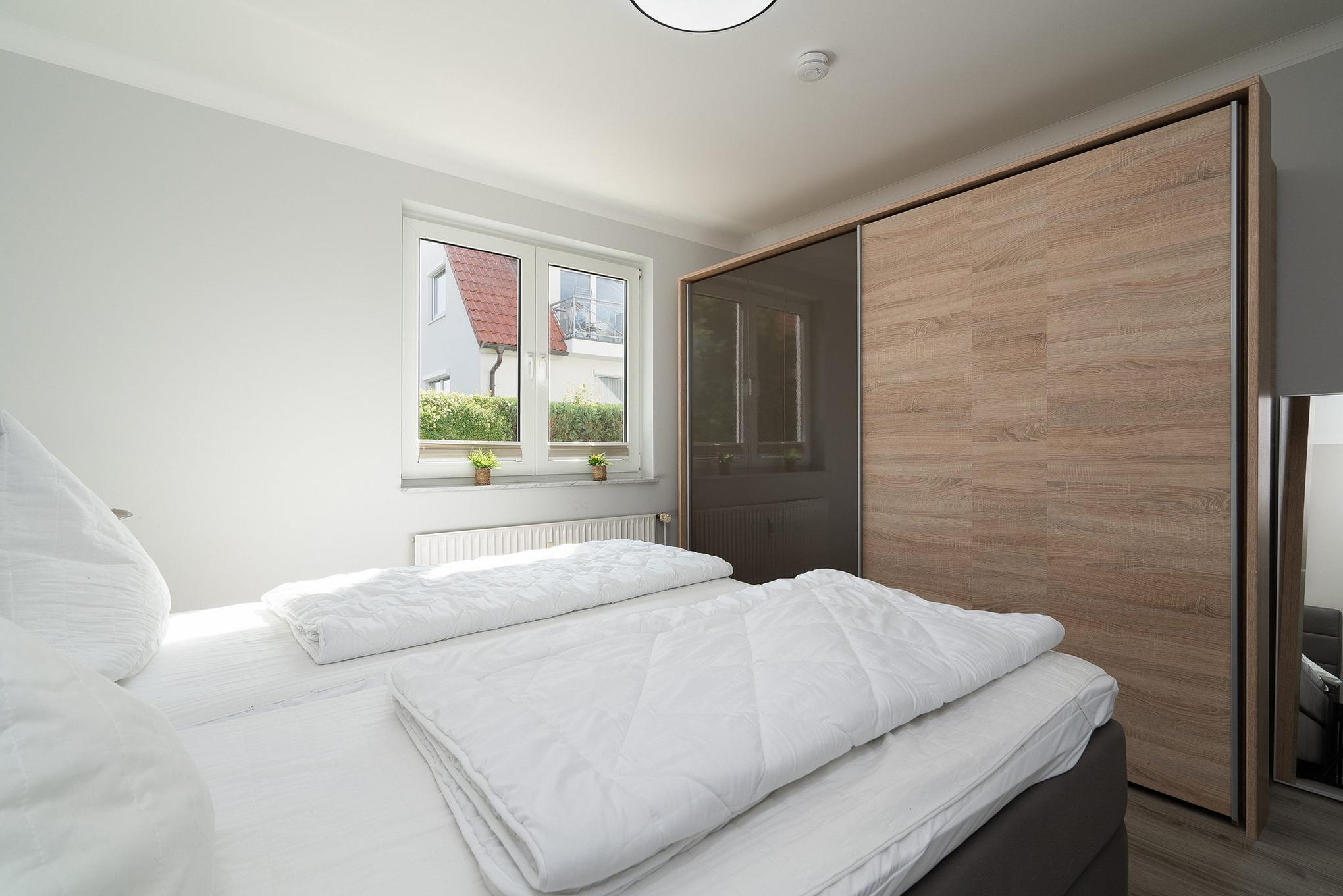 Das modern ausgestattete Schlafzimmer wurde mit einem neuen Boxspringbett (180x200cm) ausgestattet und verfügt über einen Kleiderschrank mit platzsparenden Schiebetüren. Der Raum wurde ebenfalls mit dem pflegeleichten, modernen Designboden ausgelegt. Die Fenster lassen sich durch die Plissees verdunkeln.