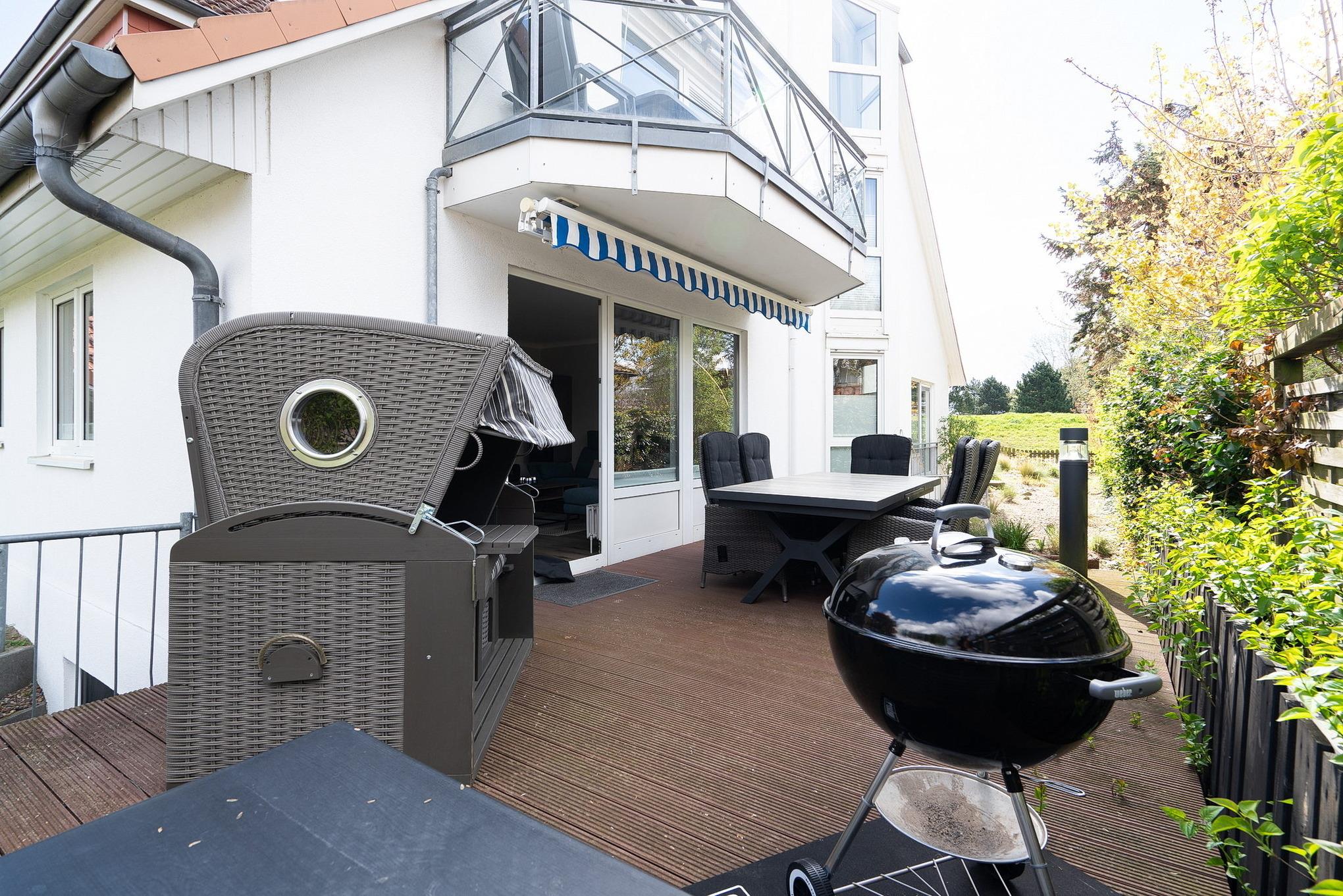 Vom Wohn-Essbereich haben Sie direkten Zugang zur großen Terrasse, in westlicher Richtung, die ebenfalls mit viel Komfort ausgestattet wurde: großer Tisch mit Holzkeramikplatte, Rattan Stühle mit verstellbaren Rücklehnen, Markise sowie einen Standkorb. Hier können Sie Ihren Urlaubstag ganz entspannt starten oder in der Abendsonne ausklingen lassen. Gönnen Sie sich diese Oase der Entspannung.[nbsp][nbsp]