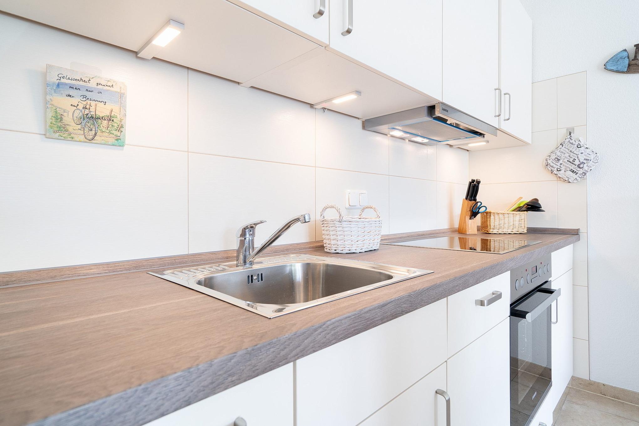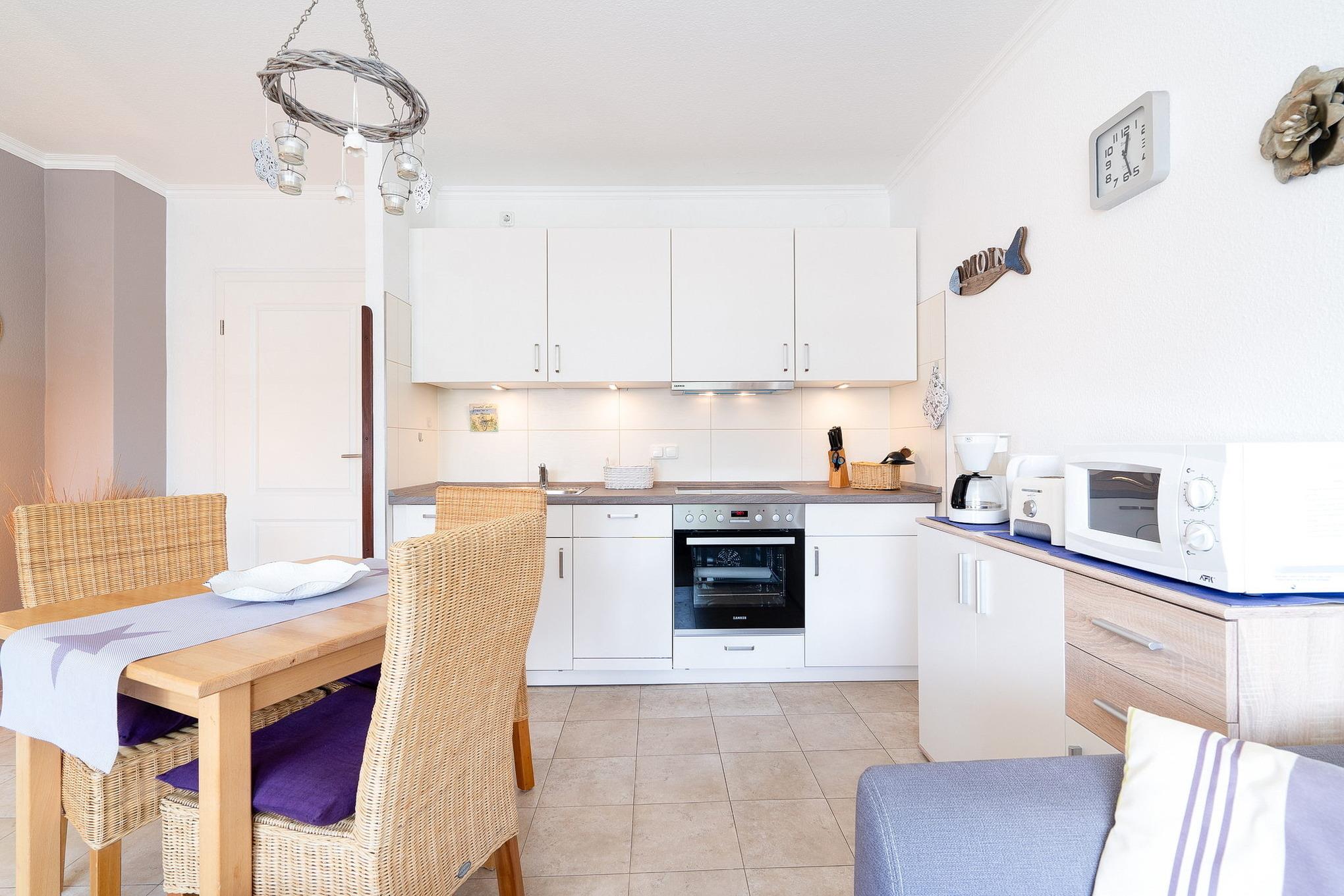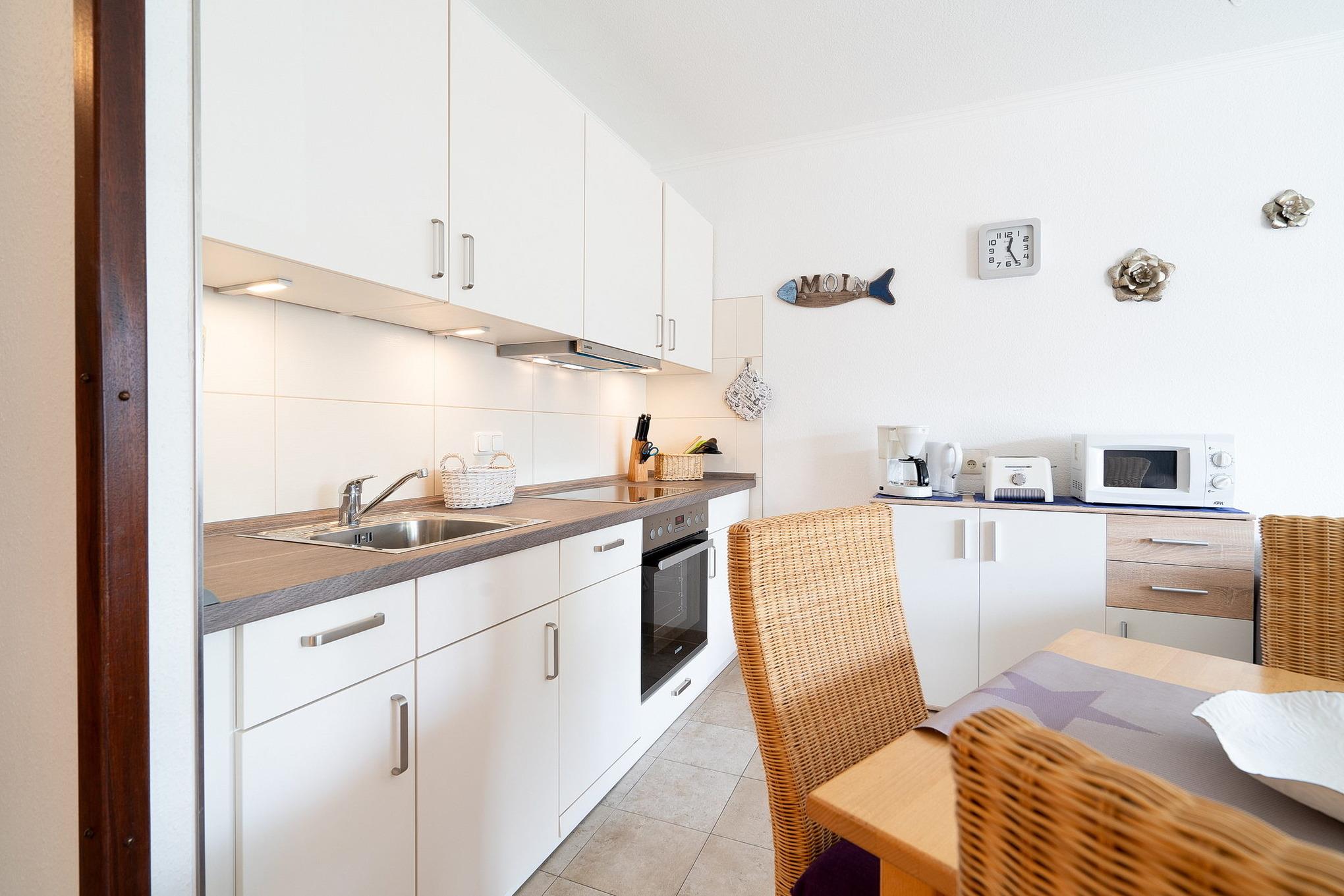 Komplett eingerichtete, zum Wohnzimmer offene Küche mit Cerankochfeld, Backofen, Dunstabzugshaube, Geschirrspüler, Mikrowelle, Toaster, Wasserkocher, Eierkocher, Kaffeemaschine und Kühlschrank mit kleinem Gefrierfach.