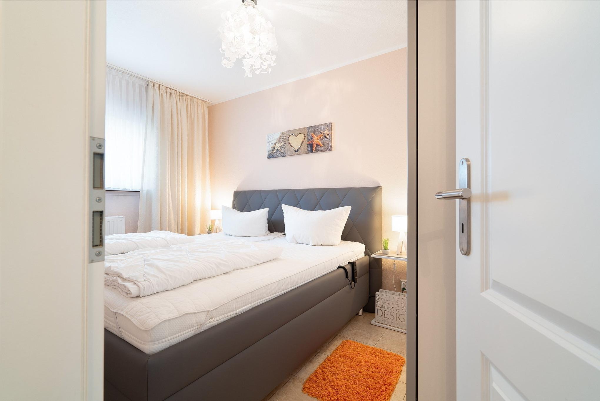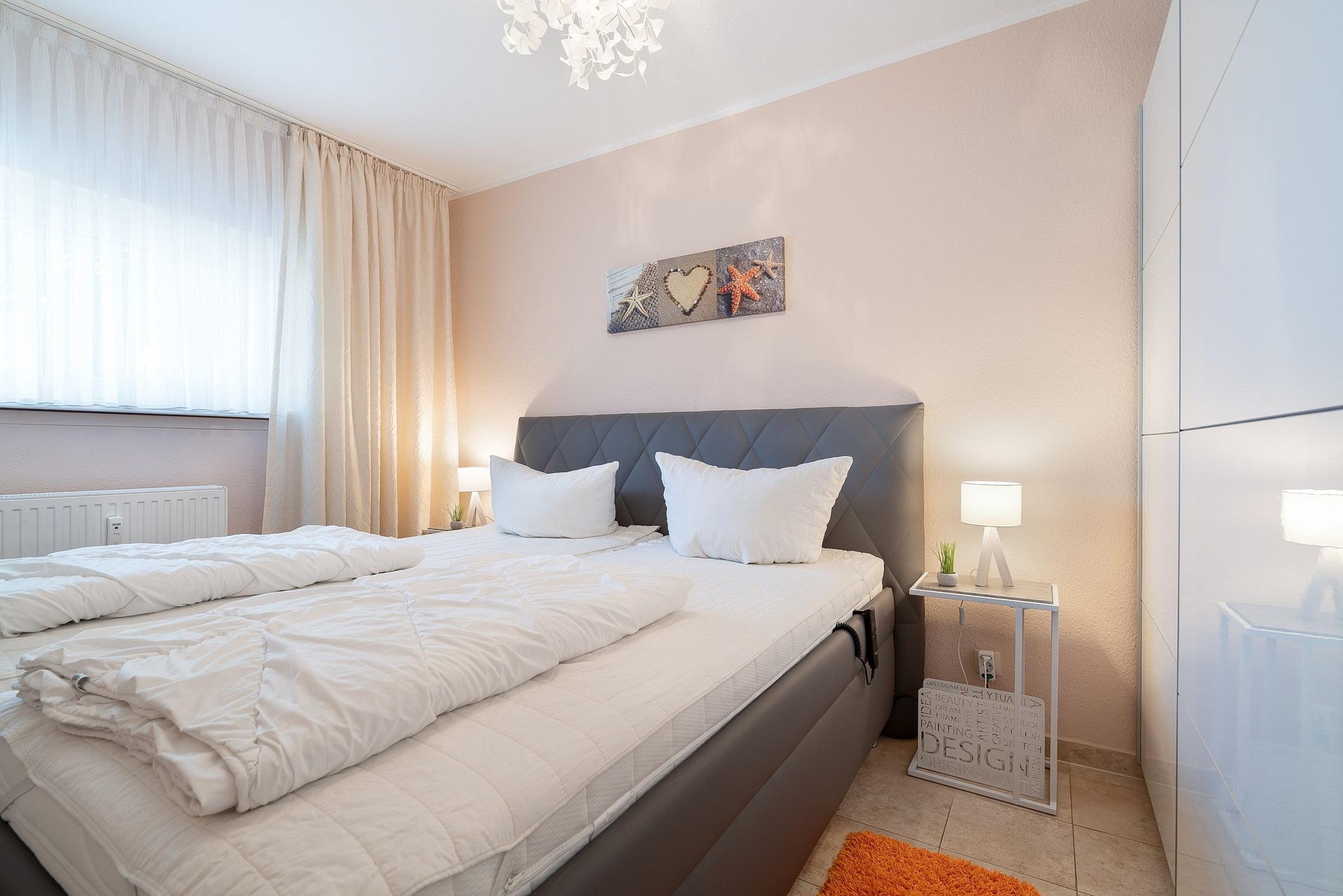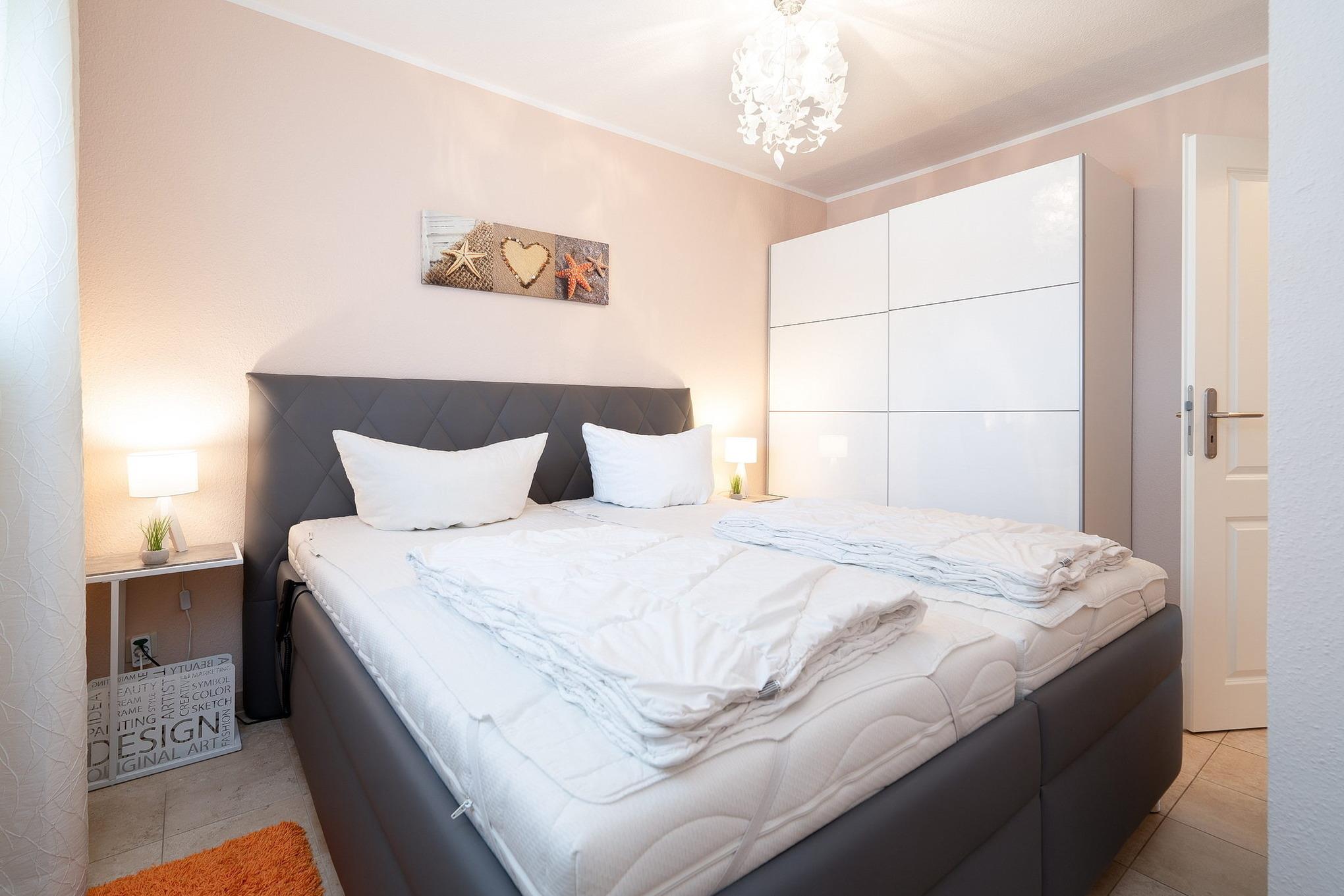 Modernes, gefliestes Schlafzimmer mit Polsterbett. Das Schlafzimmer ist mit einem Polster-Doppelbett (2x 90cm x 200cm) mit verstellbarem Lattenrost (Kopf- und Fußteil), 2 Nachttischen und einem Kleiderschrank ausgestattet. Das Fenster zum Laubengang lässt sich durch einen Außenrolladen und einer Gardine verdunkeln.