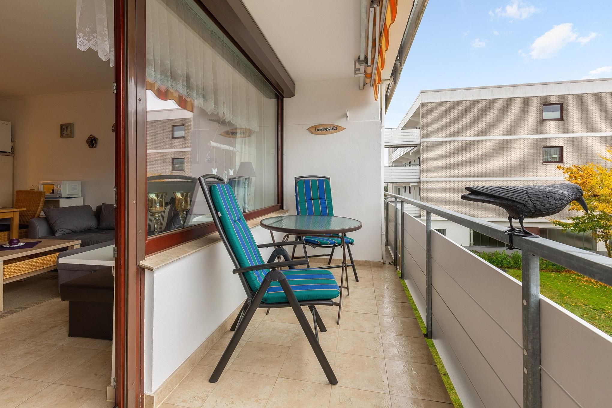 Balkon in süd-westliche Ausrichtung mit Sitzplätzen für 2 Personen. Eine Markise sorgt an sonnigen Tagen für angenehmen Schatten, außerdem steht ein Wäscheständer zur Verfügung. Eigener PKW-Stellplatz vor dem Haus. Abschließbarer Fahrradkeller im Haus. Waschmaschine und Trockner gegen Gebühr im Haus.