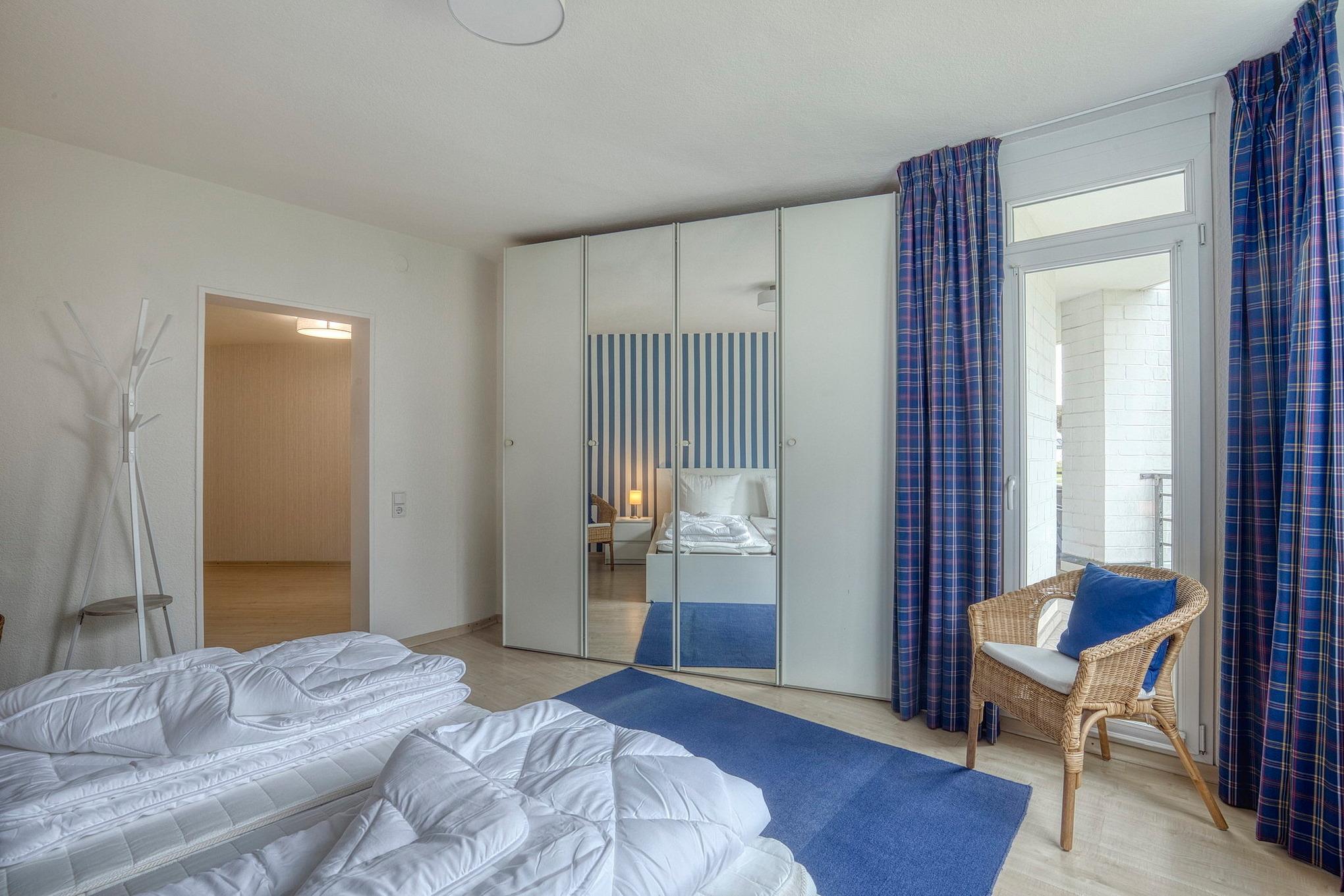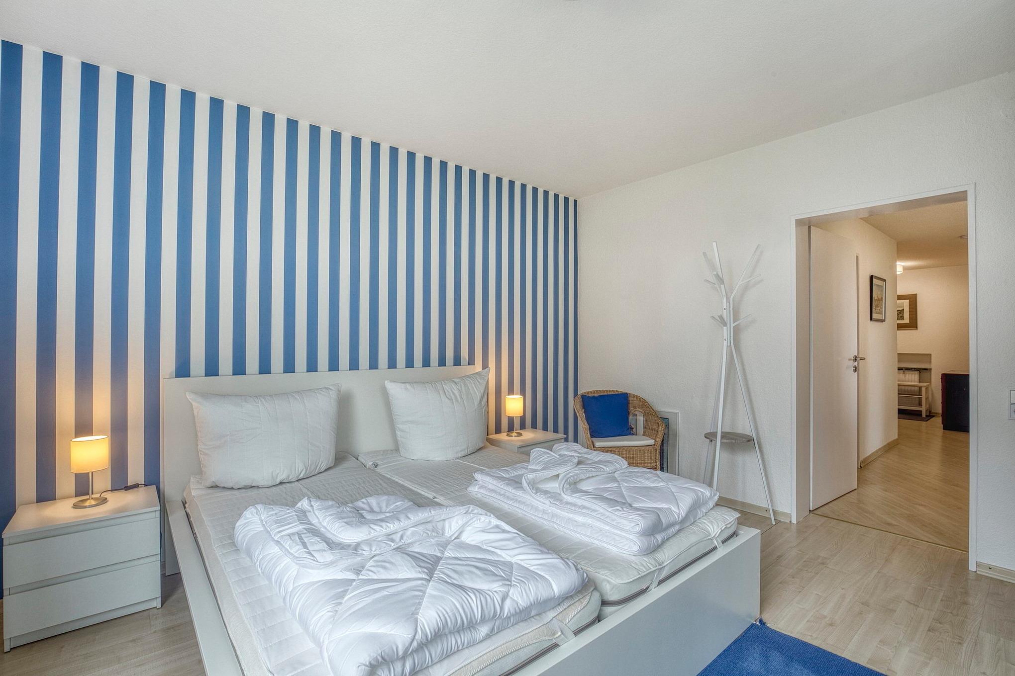 Das freundliche, gepflegte Schlafzimmer ist mit Laminat ausgelegt. Im Schlafzimmer befindet sich ein Doppelbett (2 getrennte Matratzen in der Größe 90cm x 200cm) und einem großen 2-Türigen Kleiderschrank.