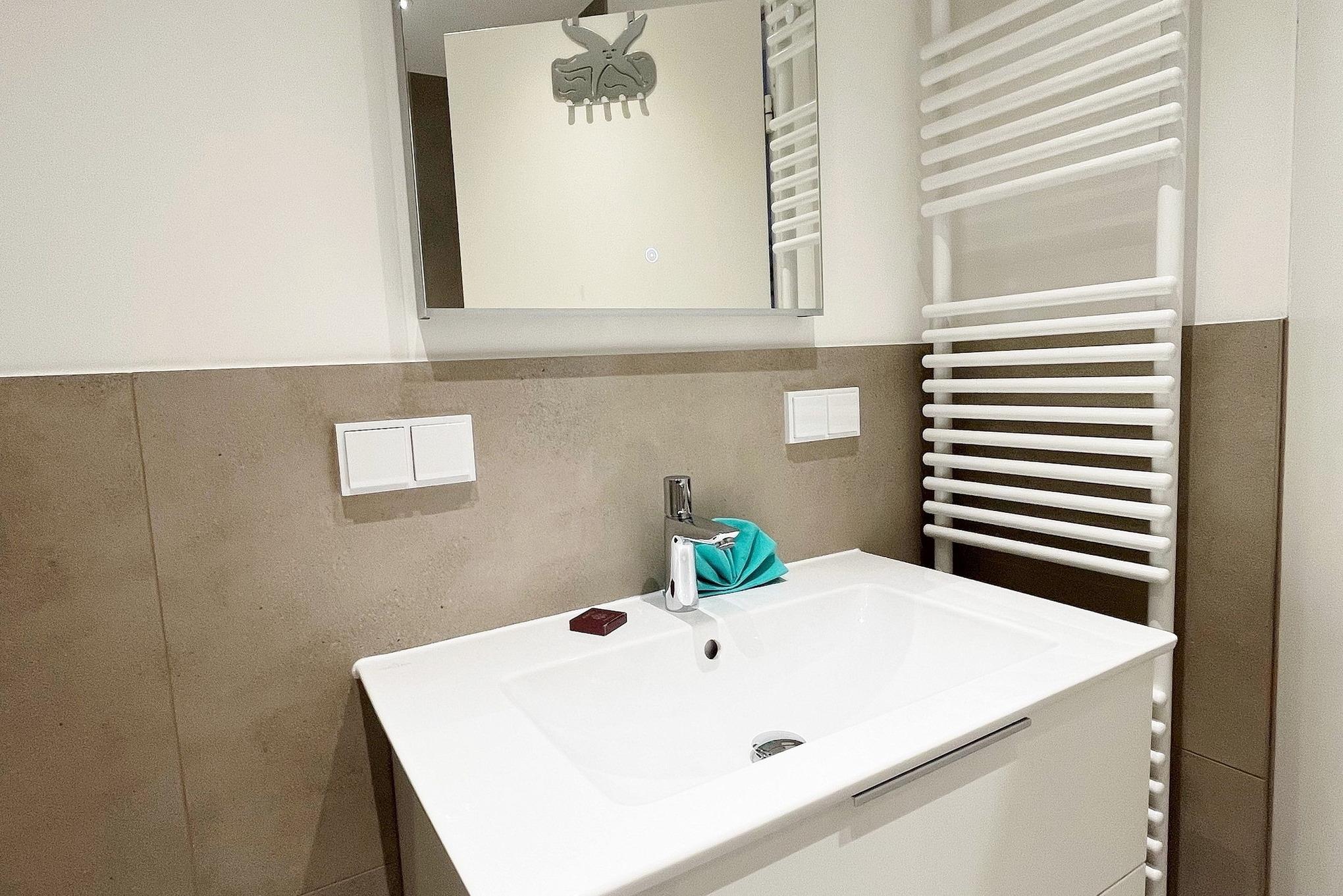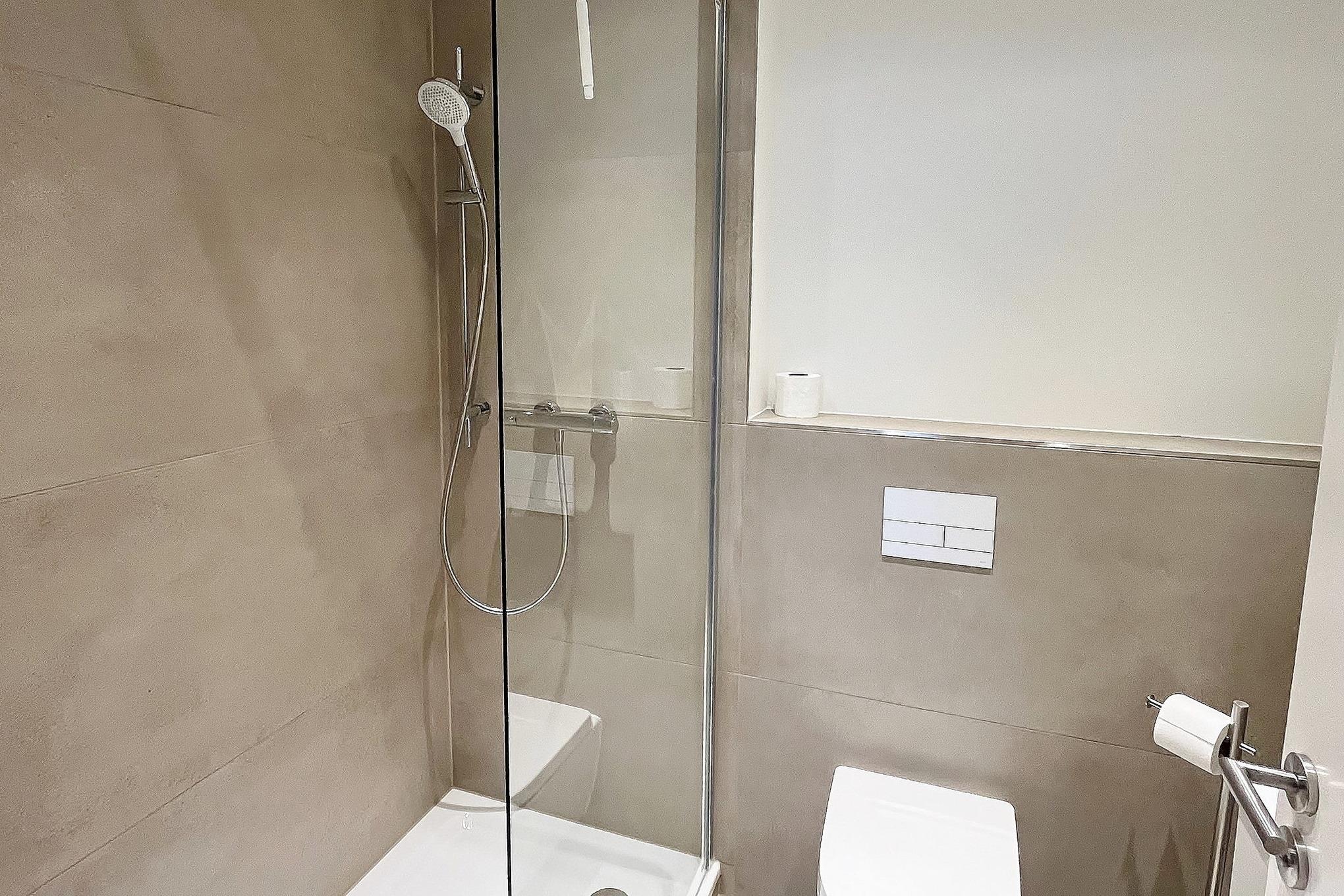 Seit April 2025 neu renoviertes, helles Bad mit Dusche, WC und Waschbecken.