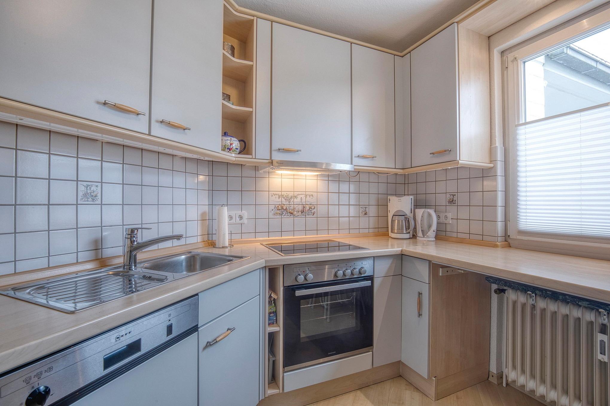 Komplett eingerichtete, gepflegte Küche. Die Küche ist mit einem 4-Flammen Cerankochfeld mit Backofen, einem Kühlschrank mit kleinem 1-Sterne Gefrierfach, Spülmaschine, Wasserkocher, Kaffeemaschine, Eierkocher, Mikrowelle und Toaster ausgestattet.