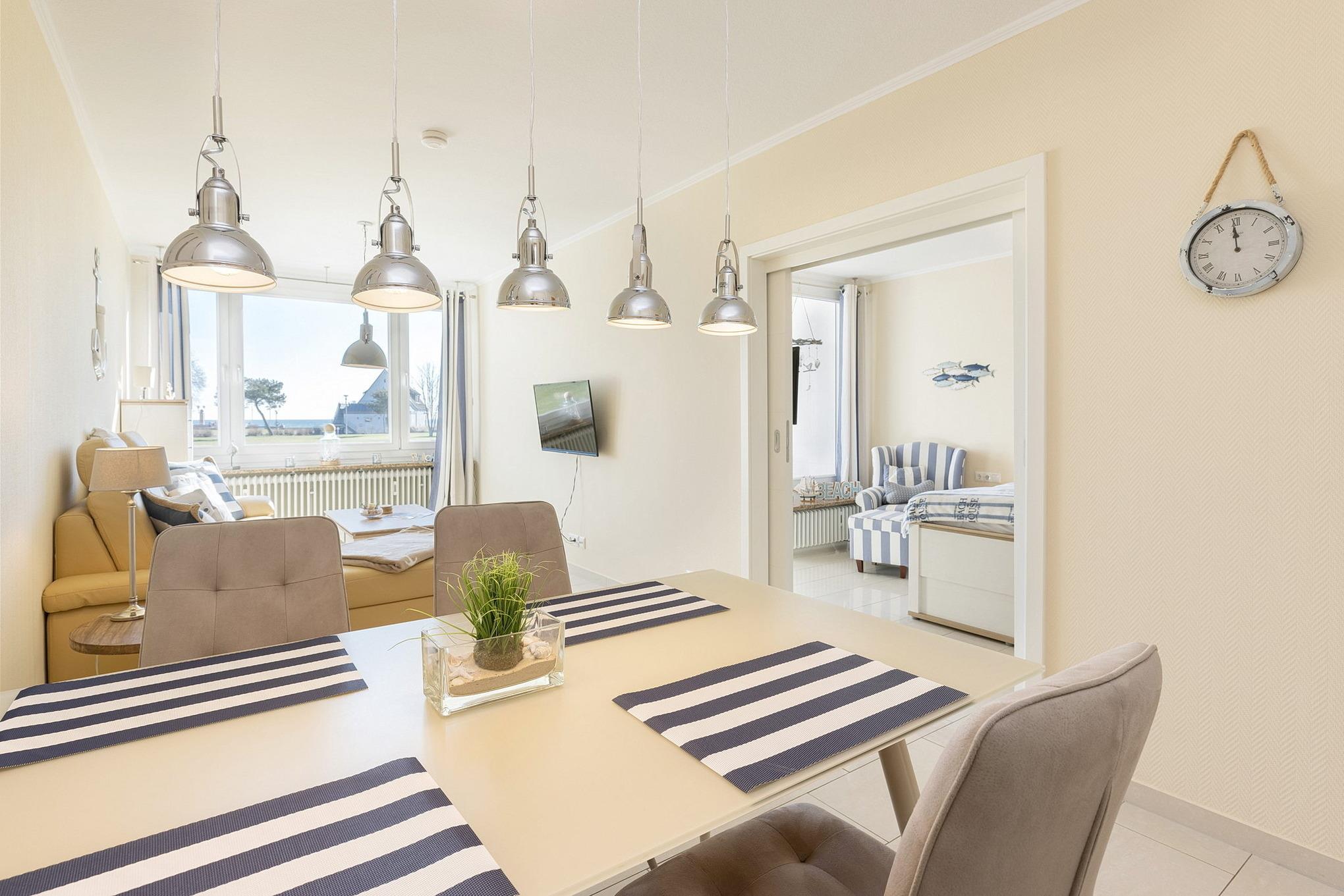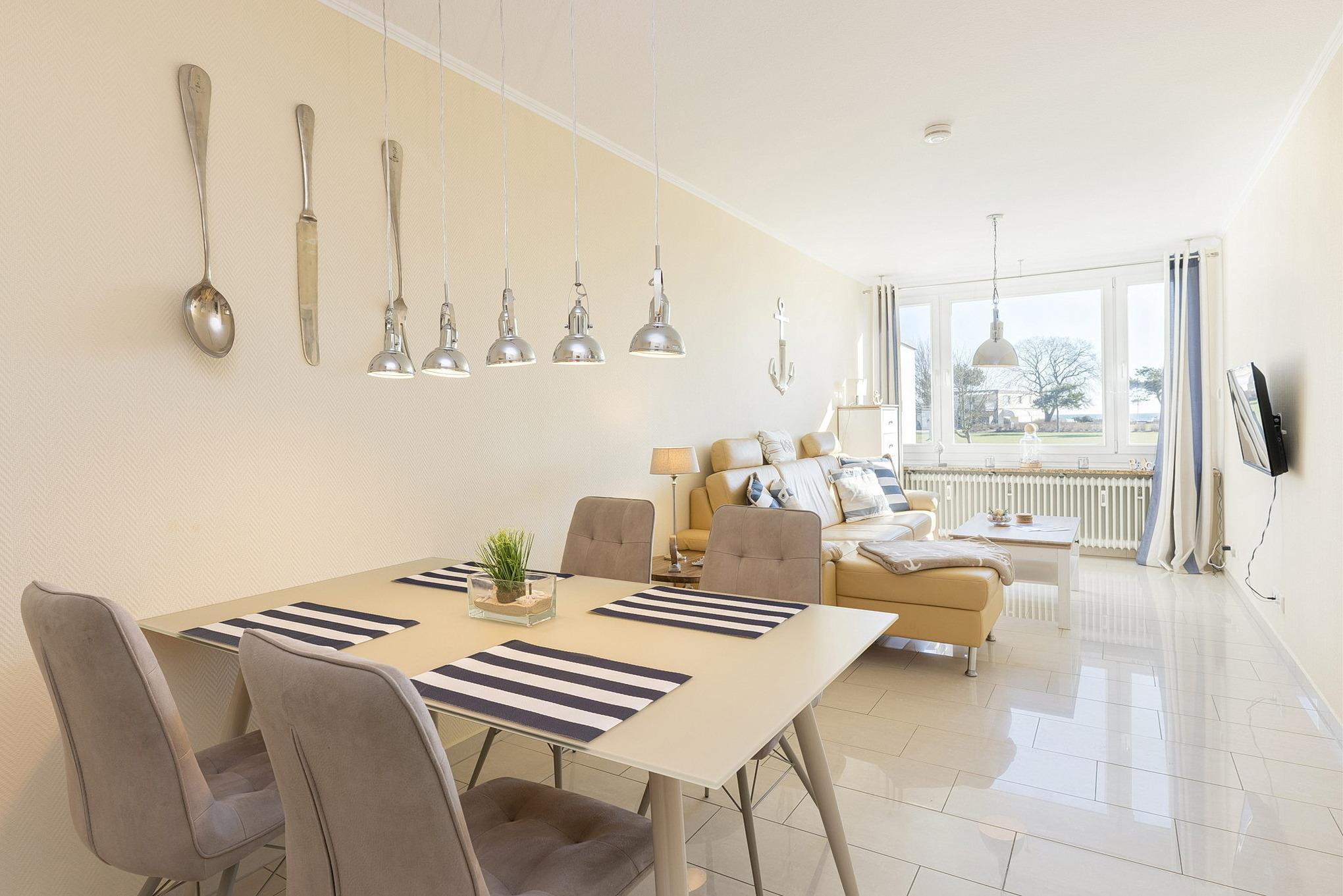 Moderner Wohnbereich mit Seeblick. Das Zimmer ist ausgestattet mit einer hellen Leder-Couch und einem Essplatz für 4 Personen sowie einer Kommode. Zur Unterhaltung steht ein Flachbild-TV zur Verfügung. Der Boden ist hell gefliest. Die Fenster lassen sich mit Außen-Jalousien verdunkeln.