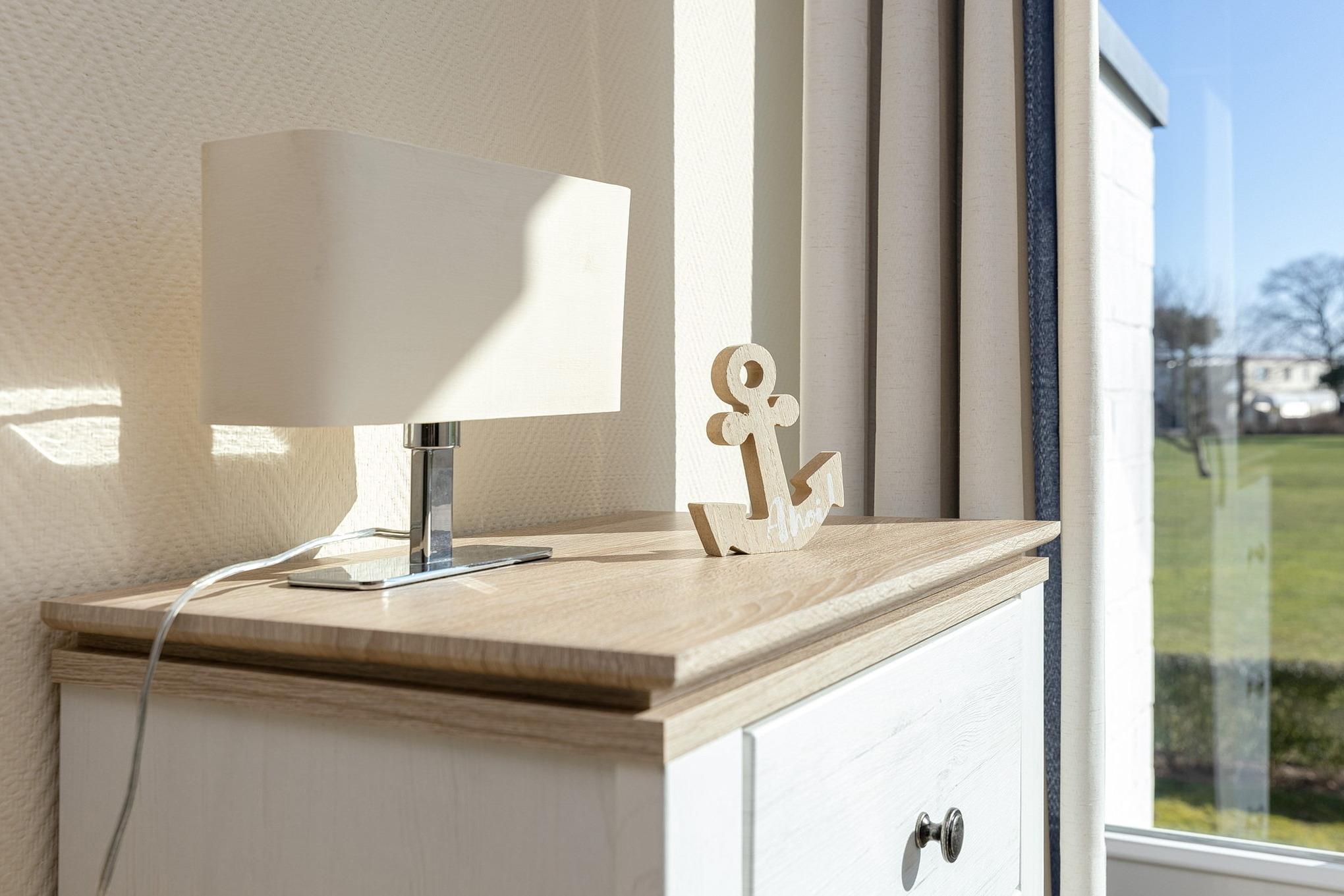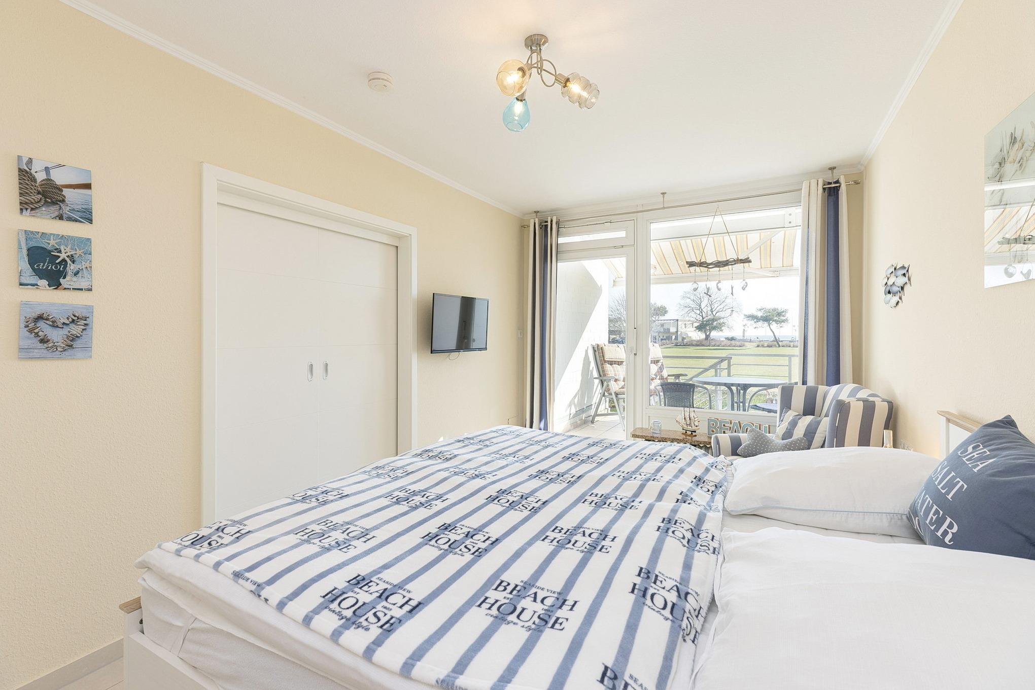 Kleines gemütlich eingerichtetes Schlafzimmer mit kleinem Kleiderschrank und direktem Zugang zum Balkon mit Seeblick. Das Zimmer ist hell gefliest und mit einem Doppelbett (2x90x200cm), einem Sessel sowie 2 Nachttischen ausgestattet. Zur Unterhaltung steht ein Flachbild-TV zur Verfügung. Die Fenster lassen sich mit Außen-Jalousien verdunkeln.