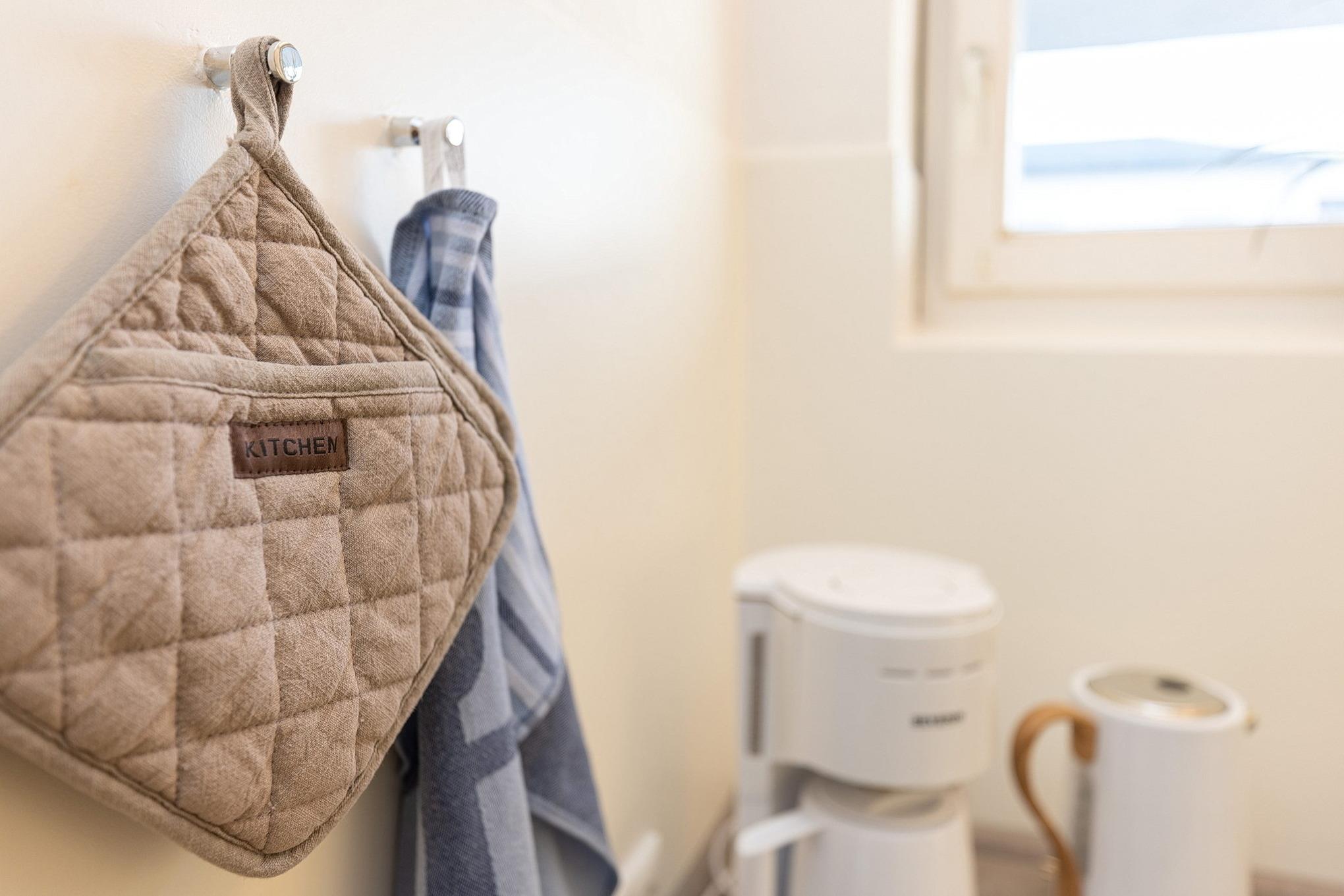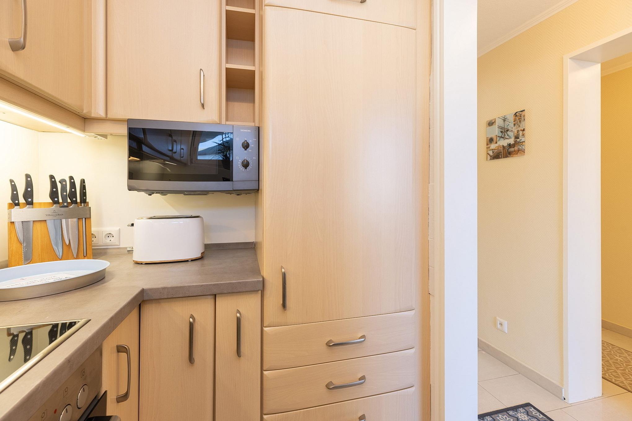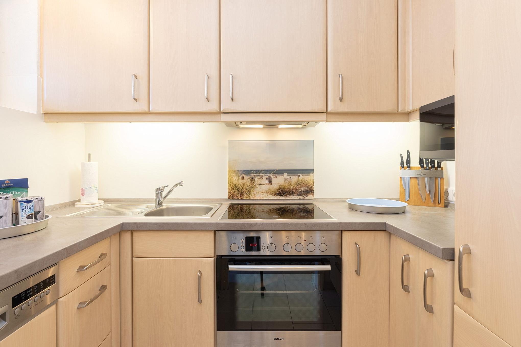 Offene komplett ausgestattete Küche mit 4-Platten Cerankochfeld, Backofen, Spülmaschine und Kühlschrank. Ebenso stehen eine Kaffeemaschine, ein Toaster und ein Wasserkocher zur Verfügung.