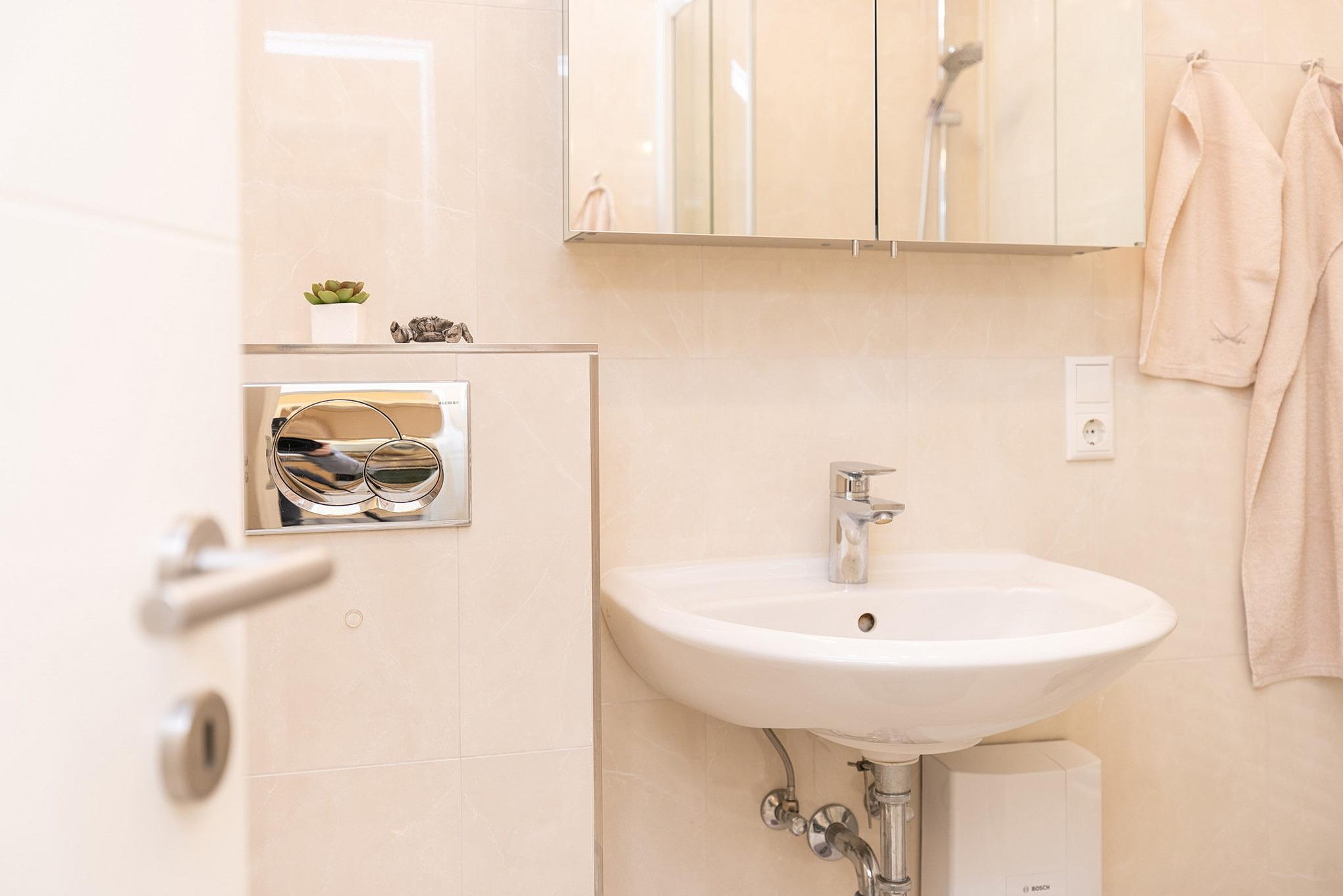 Helles Bad mit Dusche, WC und Waschbecken.