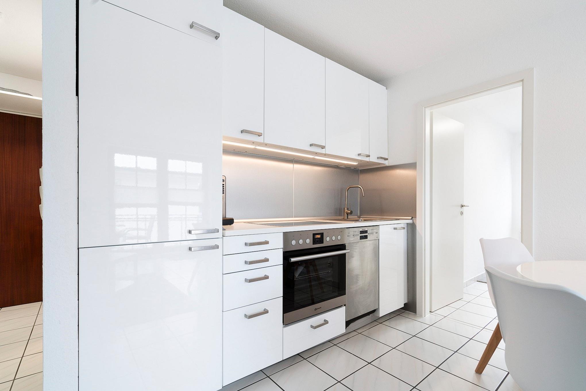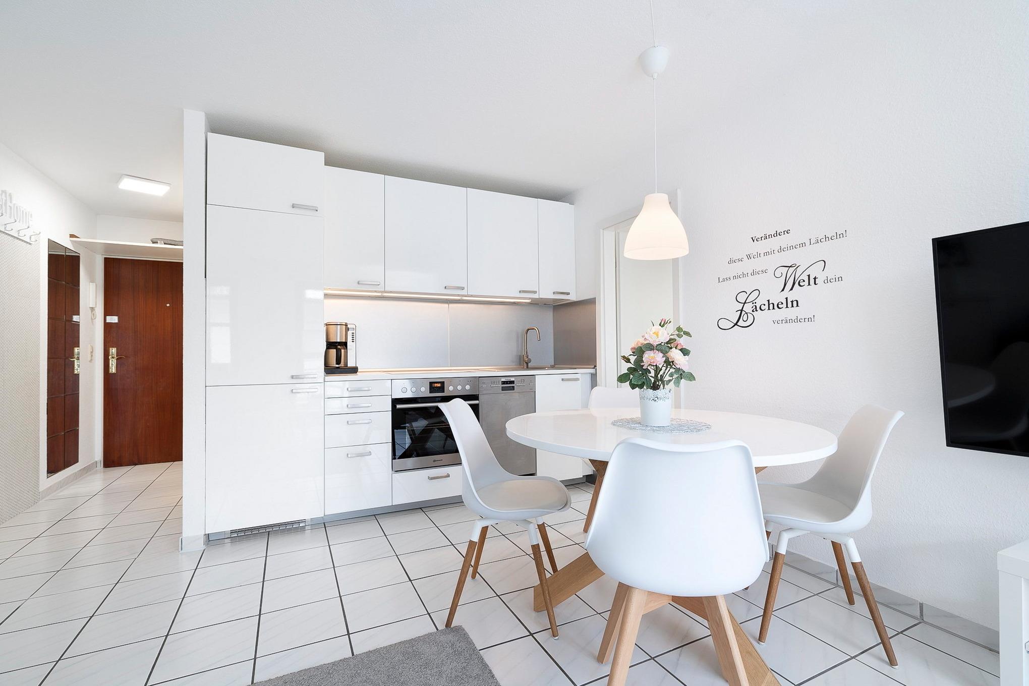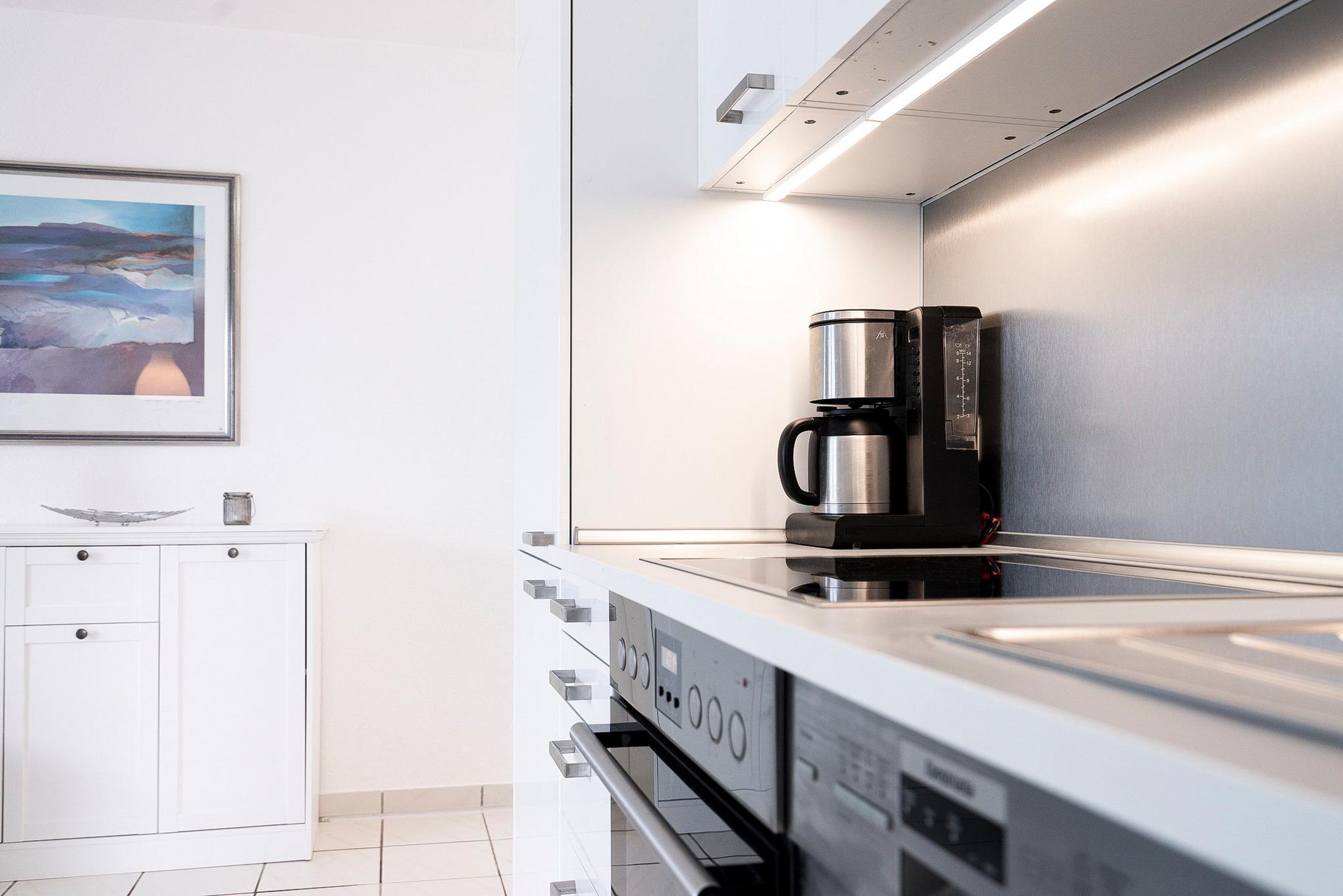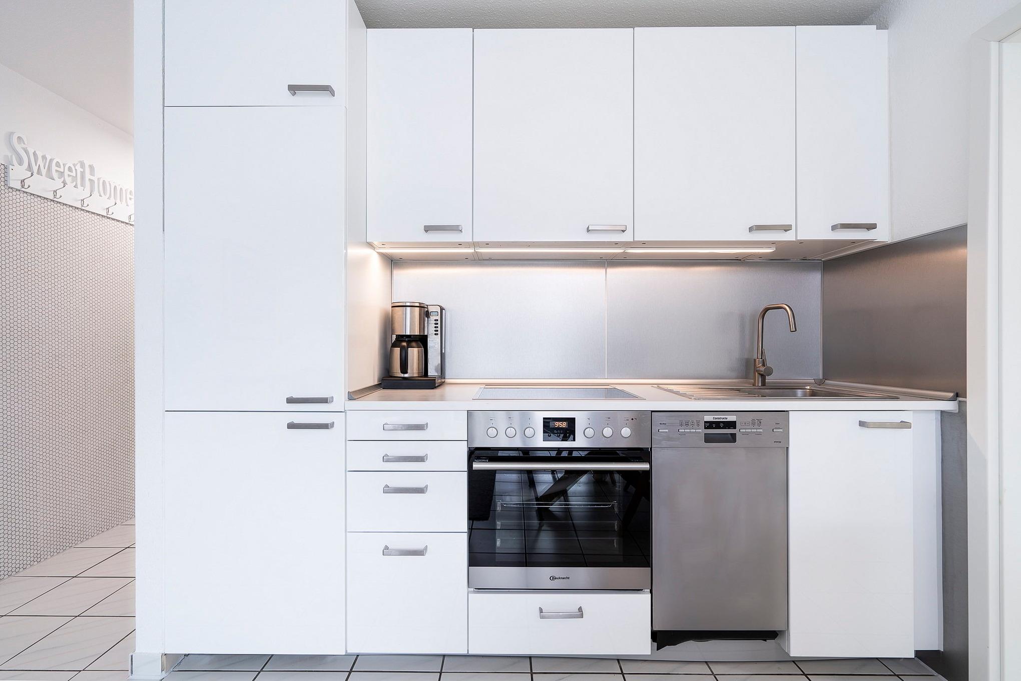 Komplett ausgestattete, zum Wohn- [&] Esszimmer offene, moderne Küche mit 4 Platten Cerankochfeld, Backofen, Kühlschrank mit 3* Gefrierfach und Spülmaschine. Geschirr, Besteck, Wasserkocher, Eierkocher, Kaffeemaschine, etc. sind selbstverständlich ebenfalls vorhanden.