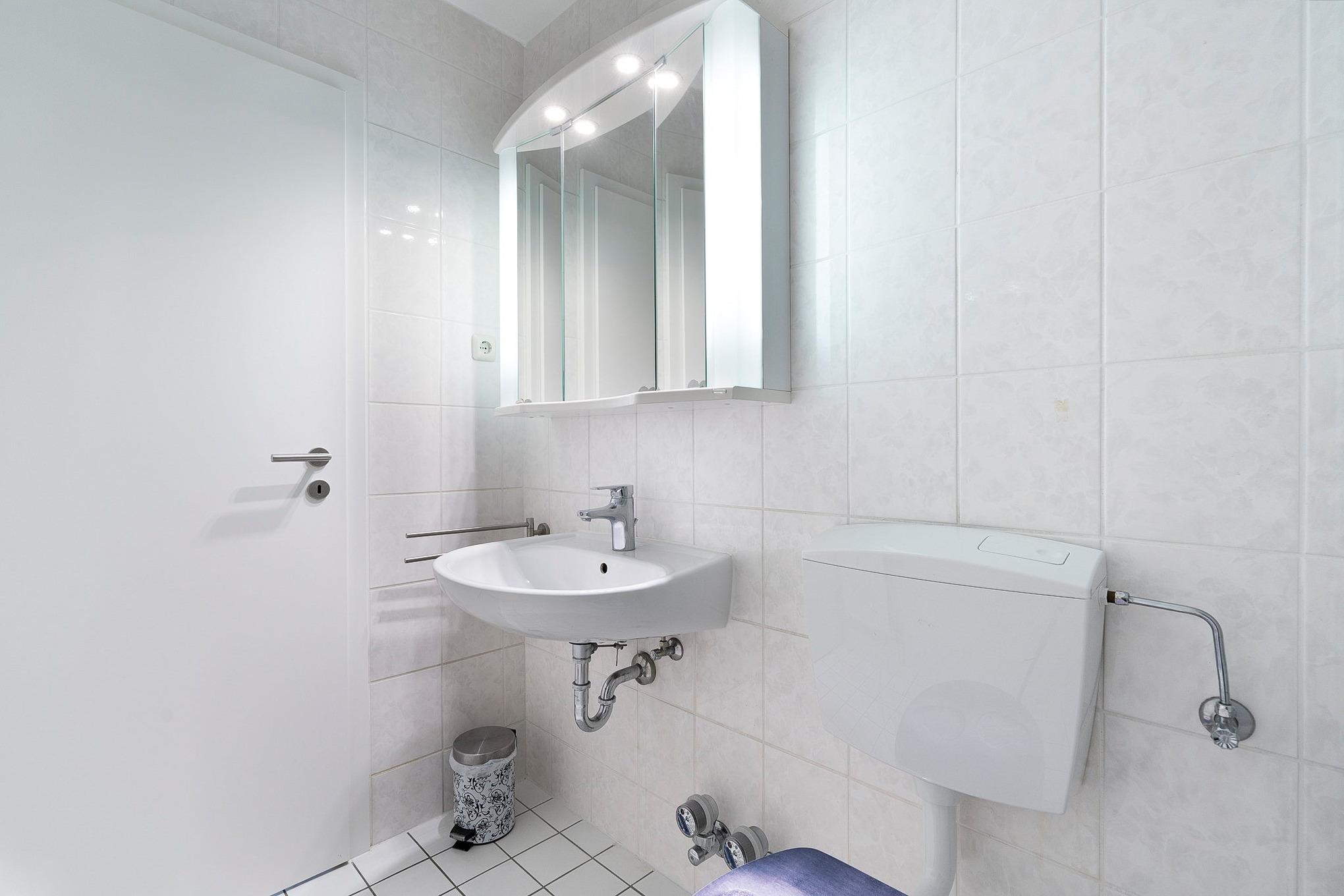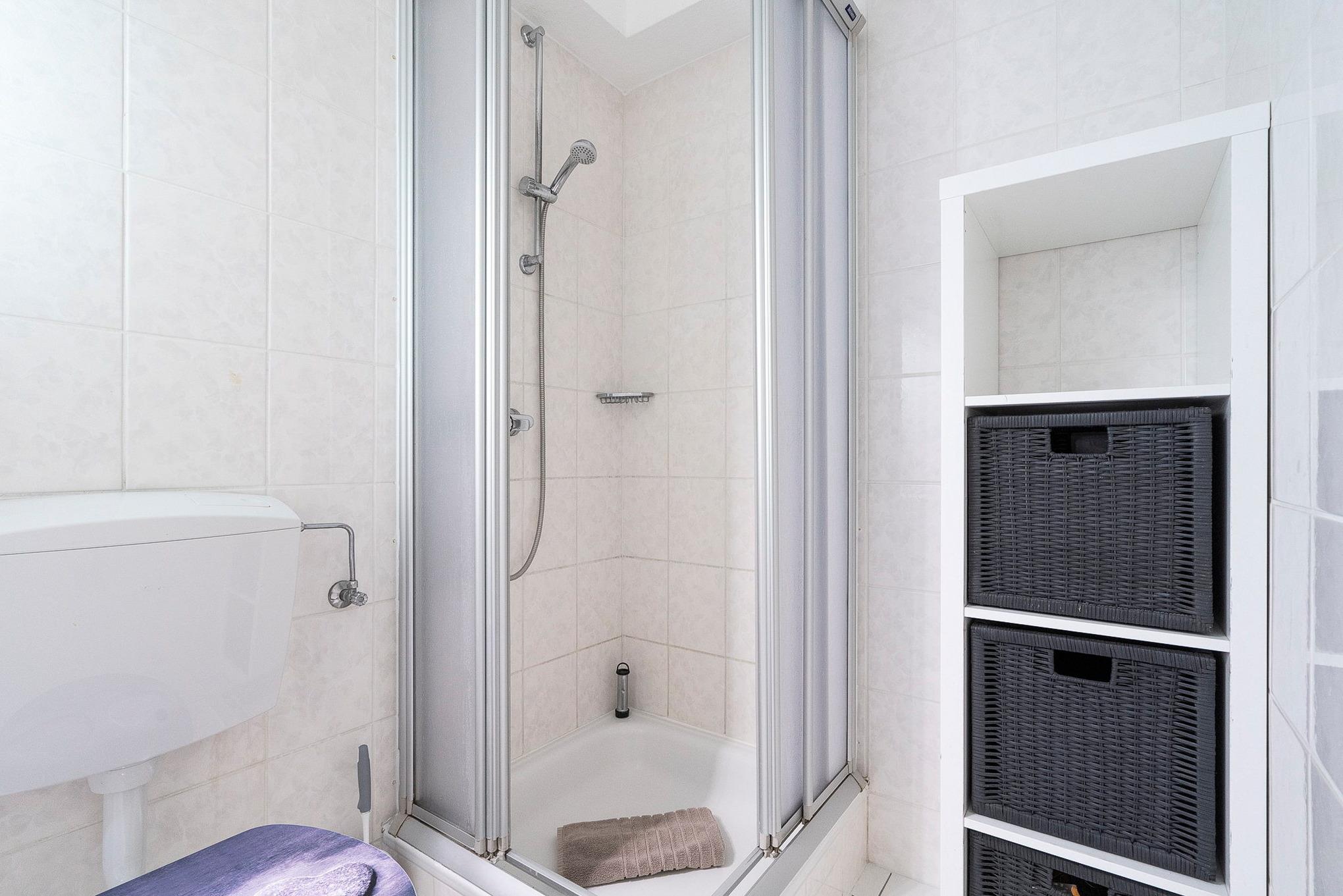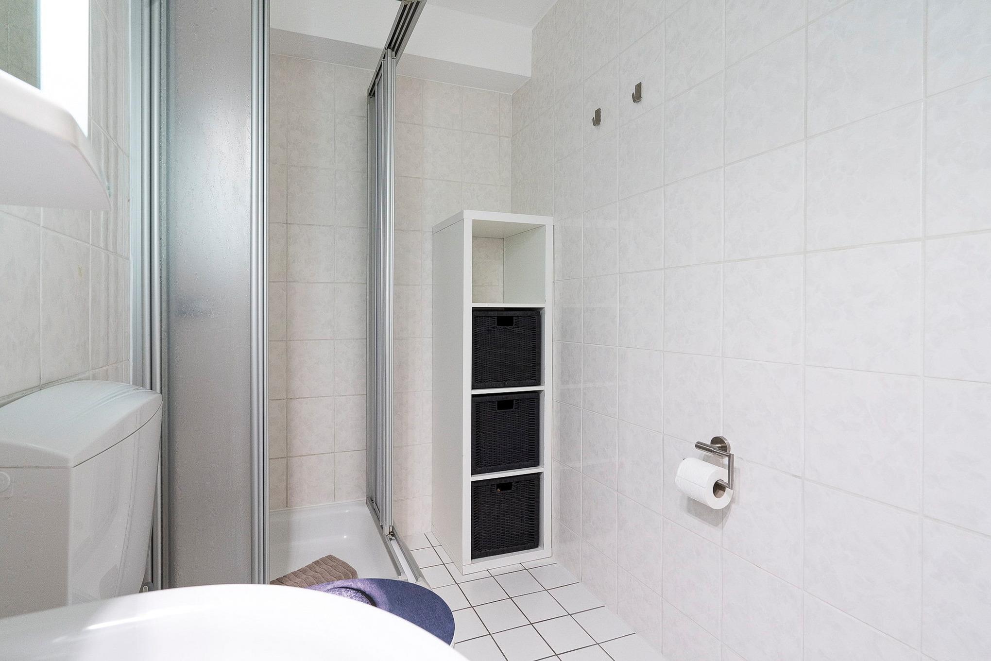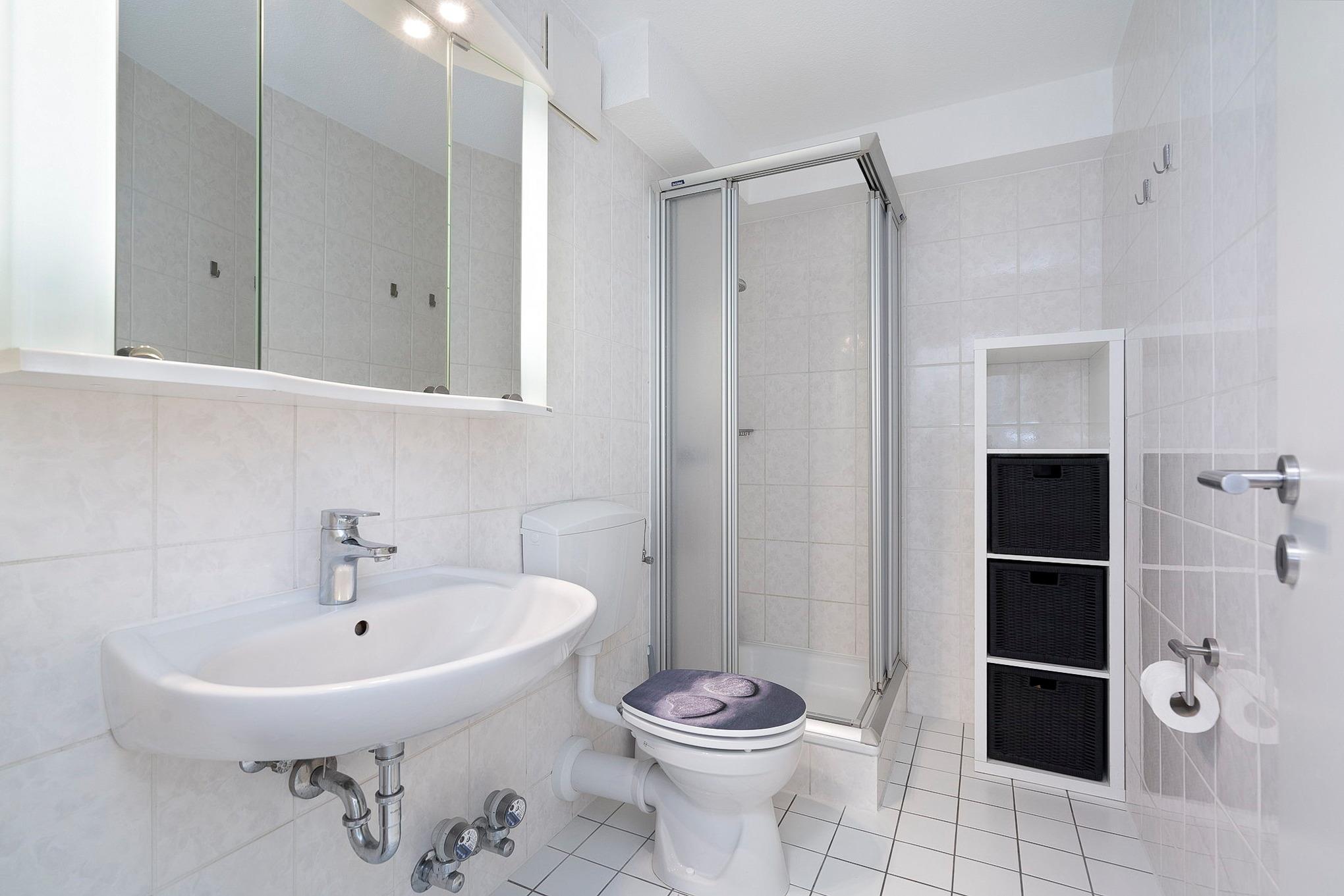 Modernes, hell gefliestes Bad mit Dusche, Waschbecken und WC.