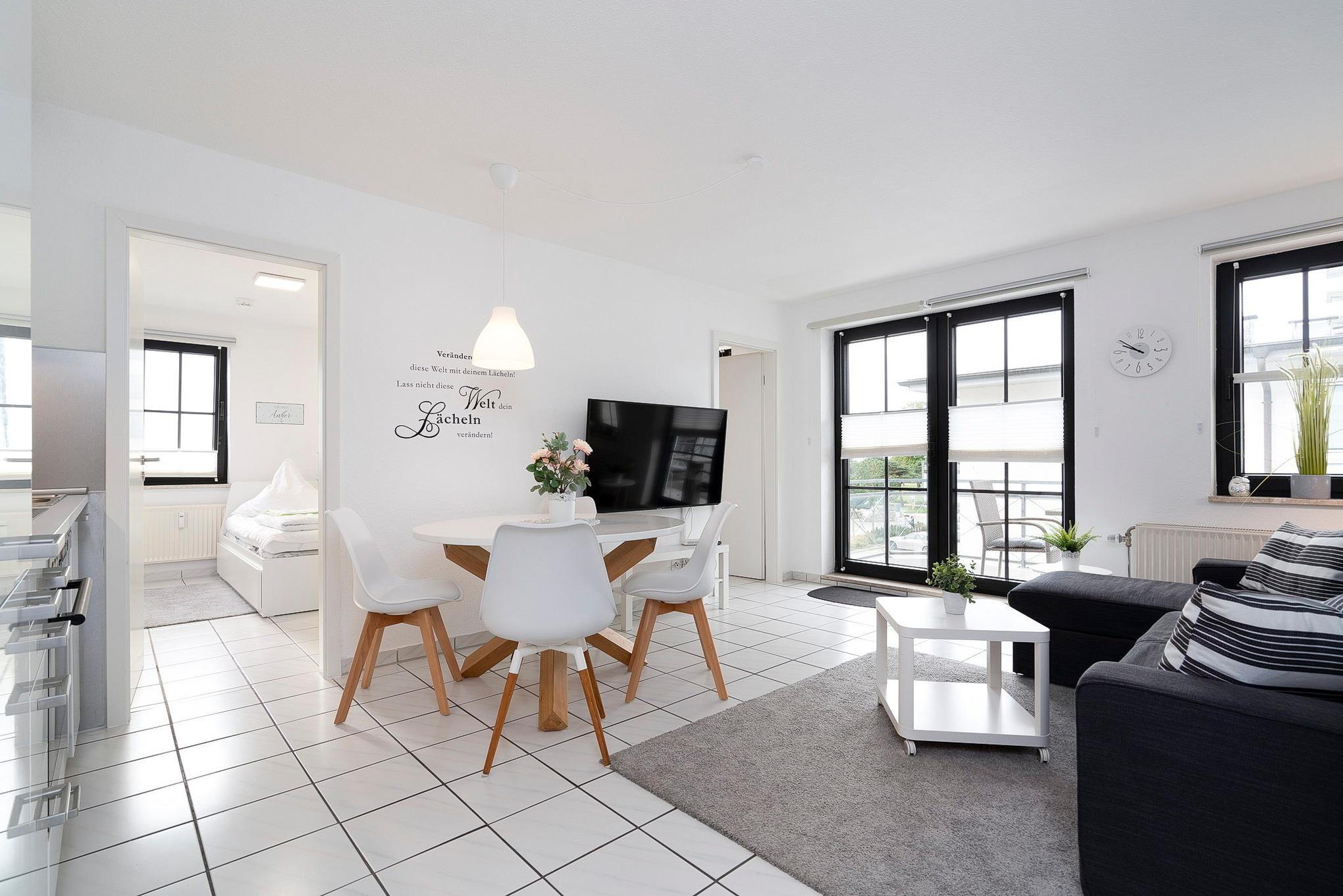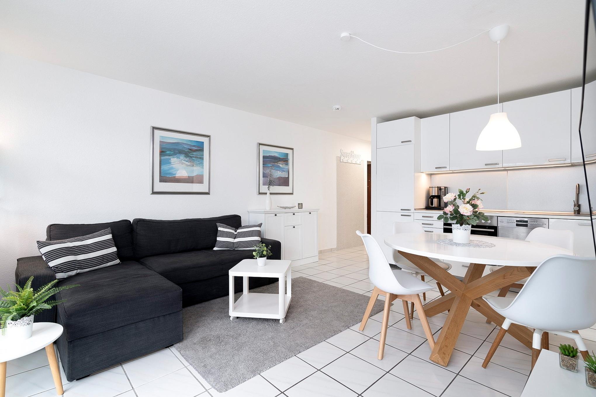 Modernes, hell gefliestes Wohn- [&] Esszimmer mit einer Couch und 2 Sesseln. Ein HD-Fernseher sowie DVD-Player stehen Ihnen zur Verfügung. Ein Esstisch für 4 Personen steht ebenfalls bereit. In der Kommode finden sie eine Spielesammlung für nette gemeinsame Stunden. Die Fenster lassen sich durch Innenrollos etwas verdunkeln.
