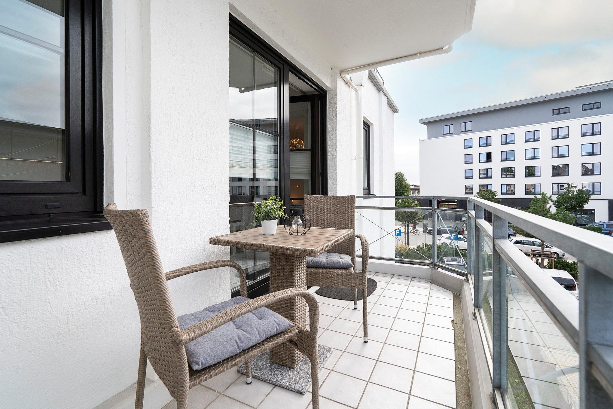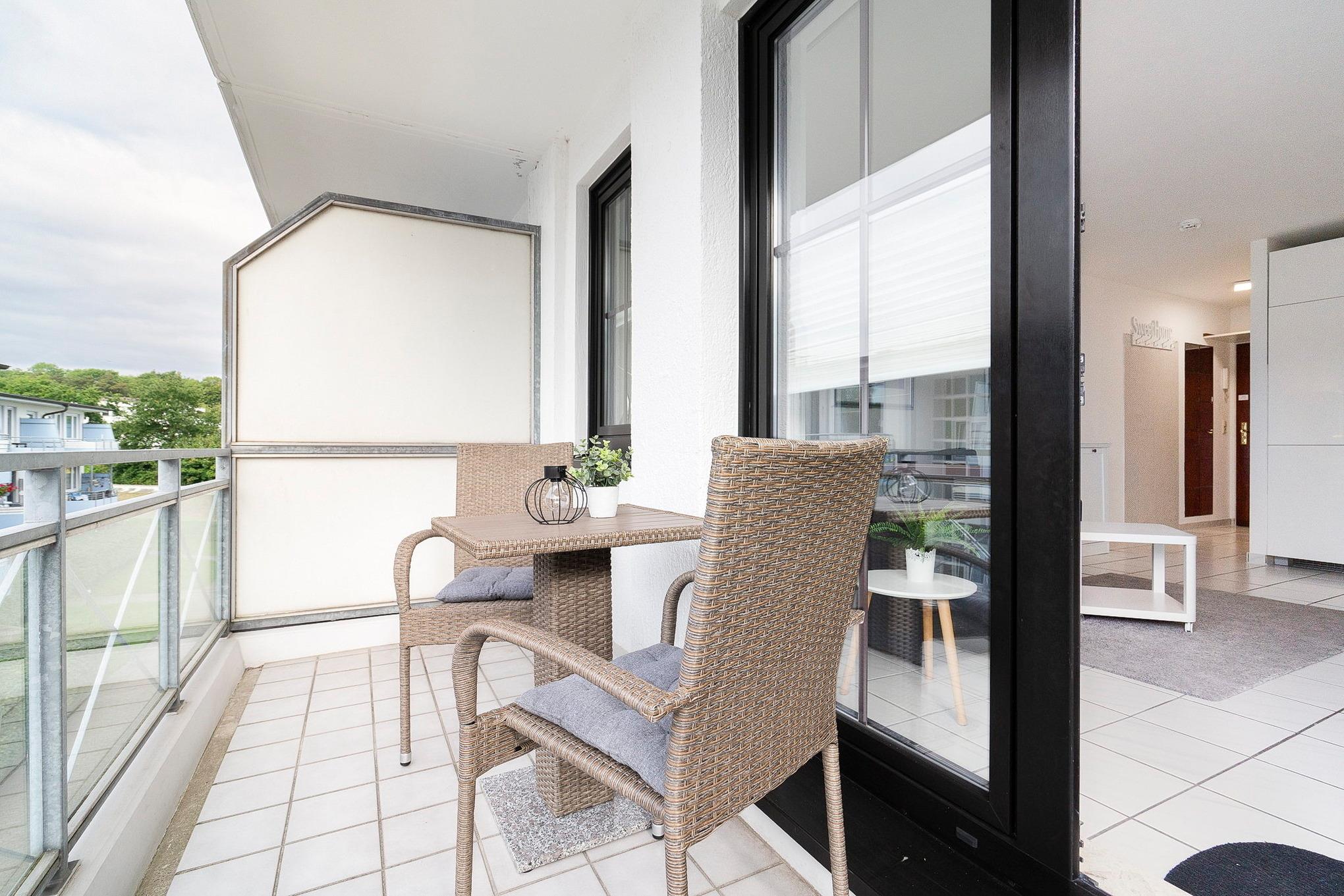 Schöner, sonniger Balkon mit geringem Teilseeblick, in süd-westliche Richtung lädt zum Frühstück, Mittag-[&] Abendessen ein. Eigener Pkw-Stellplatz hinterm Haus. Waschmaschine und Trockner gegen Gebühr. Fahrradkeller.