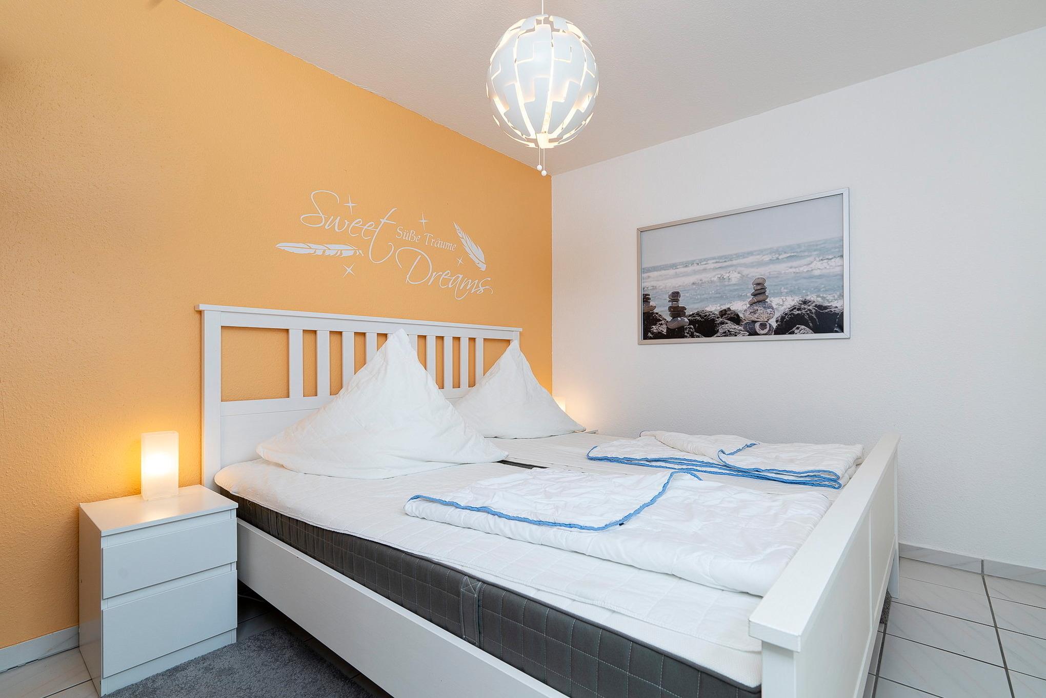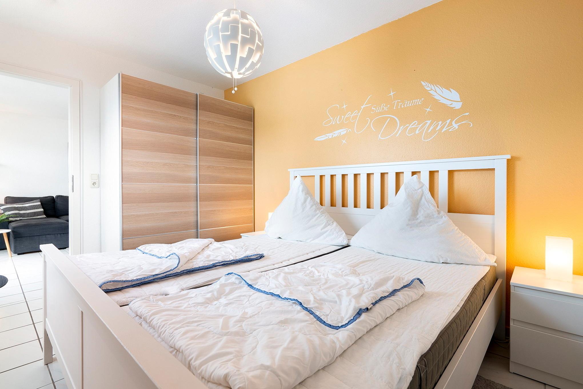Modernes, hell gefliestes Schlafzimmer mit einem bequemen Doppelbett und einem geräumigen Kleiderschrank. Das Fenster lässt sich durch ein Innenrollo etwas verdunkeln.