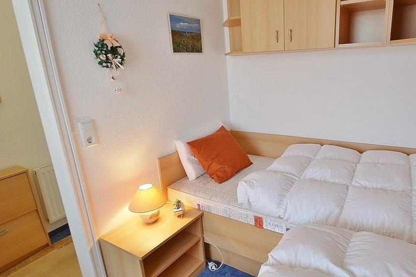 Das Schlafzimmer ist ausgestattet mit 2 Einzelbetten (1x90x190cm und 1x90x200cm) ausgestattet. Der Raum ist mit Teppich ausgelegt, das Fenster lässt sich durch einen Vorhang verdunkeln.