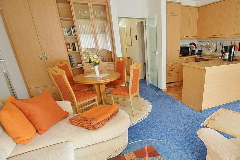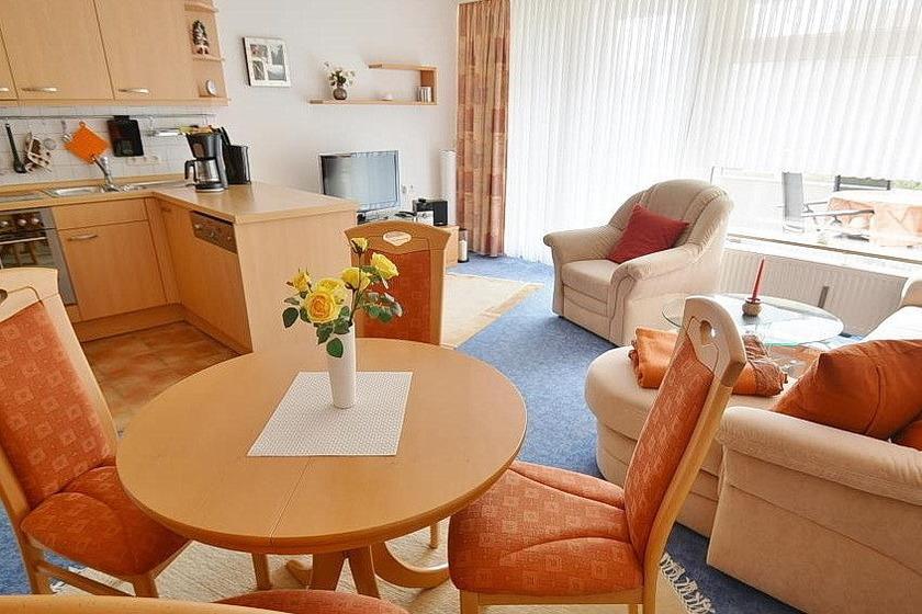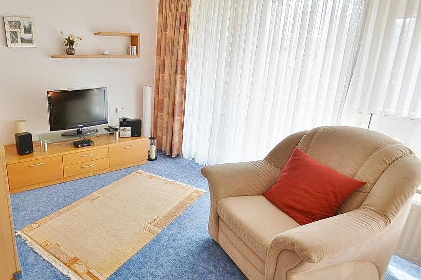 Das Wohnzimmer mit direktem Zugang zum Balkon ist mit einer gemütlichen Eckcouch mit Schlaffunktion (120x200cm), einem Sessel sowie einem Essplatz für 4 Personen ausgestattet. Zur Unterhaltung stehen ein Flachbildfernseher und eine kleine Stereoanlage zur Verfügung. Der Raum ist mit Teppichboden ausgelegt. Die Fenster lassen sich durch Vorhänge verdunkeln.