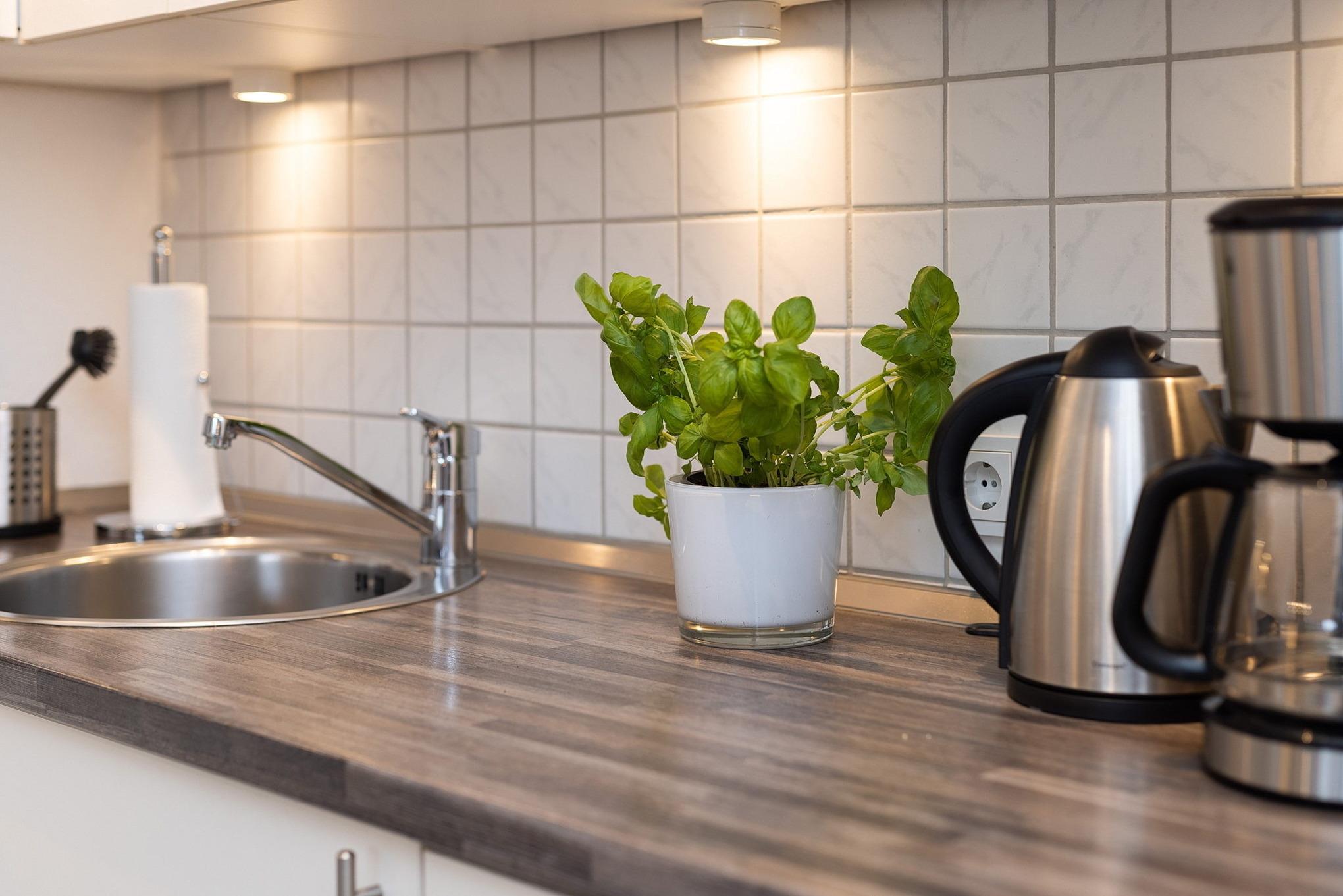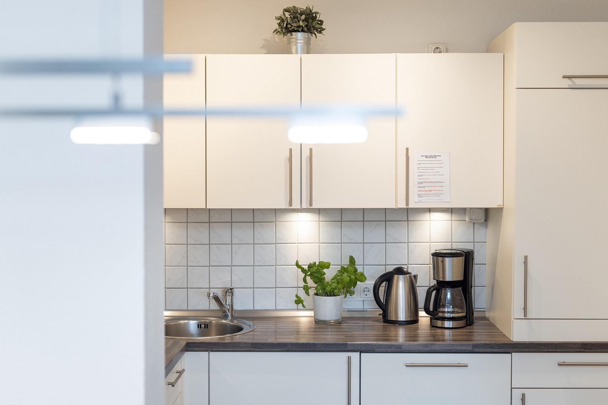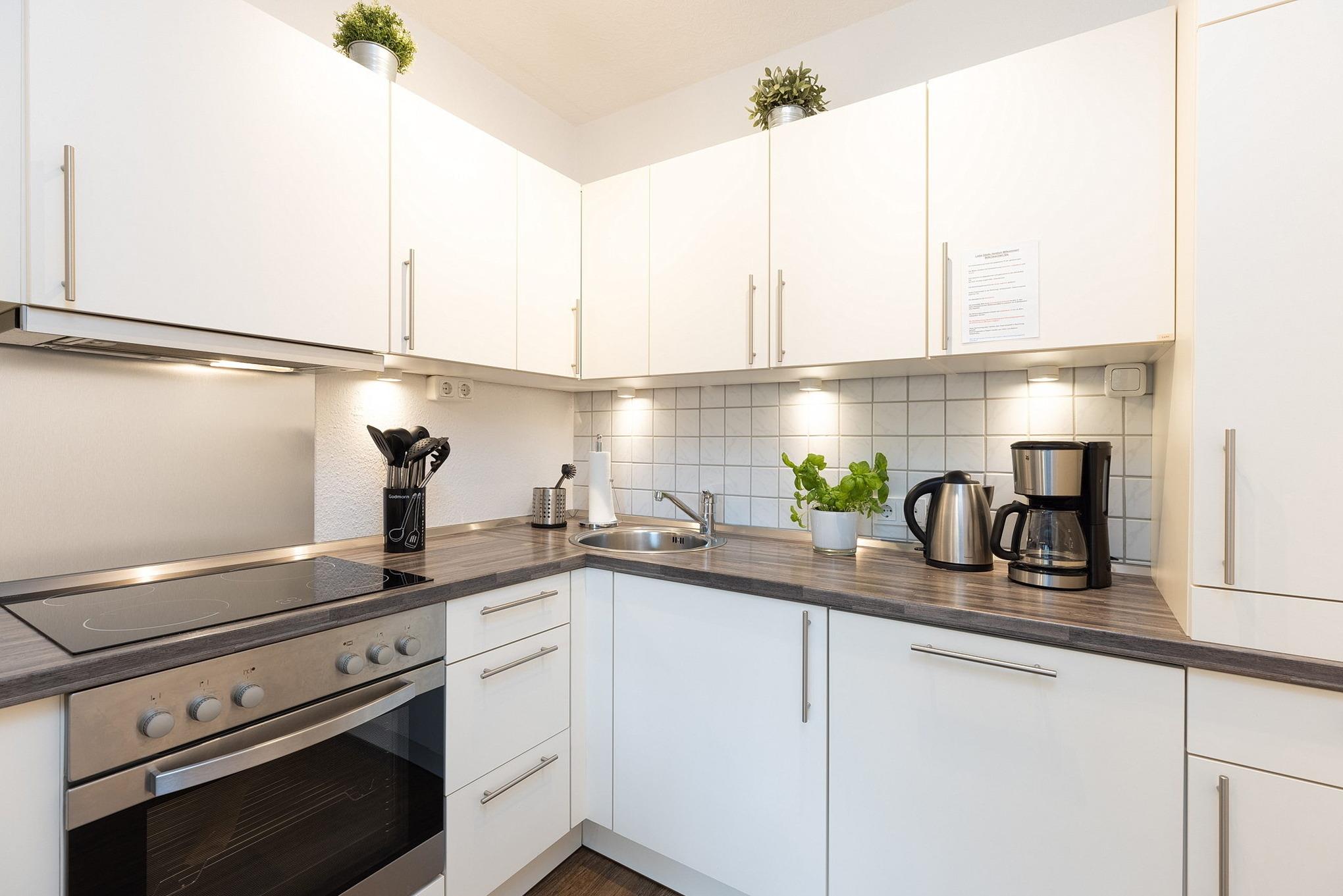 Komplett ausgestattete Küche mit 4-Platten E-Herd, Spülmaschine, Mikrowelle mit Grillfunktion, Kühlschrank mit kleinem 3-Sterne Gefrierfach, Wasserkocher und Kaffeemaschine.