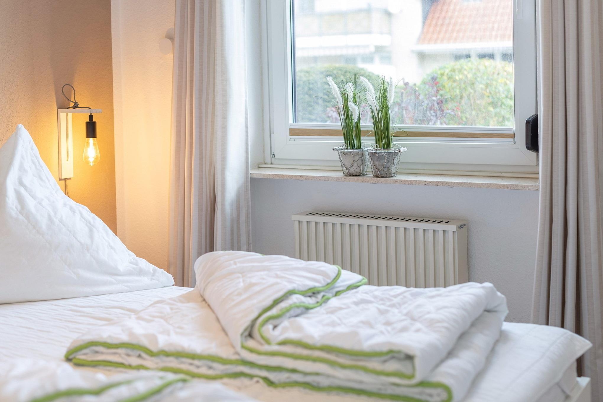 Modern ausgestattetes Schlafzimmer mit einem Doppelbett (2x 90x200cm), 2 Nachttischen, einem kleinen Kleiderschrank und einer Kommode. Das Schlafzimmer ist mit Laminatboden ausgelegt, das Fenster lässt sich durch einen Vorhang und einem Außenrollo vollständig verdunkeln.