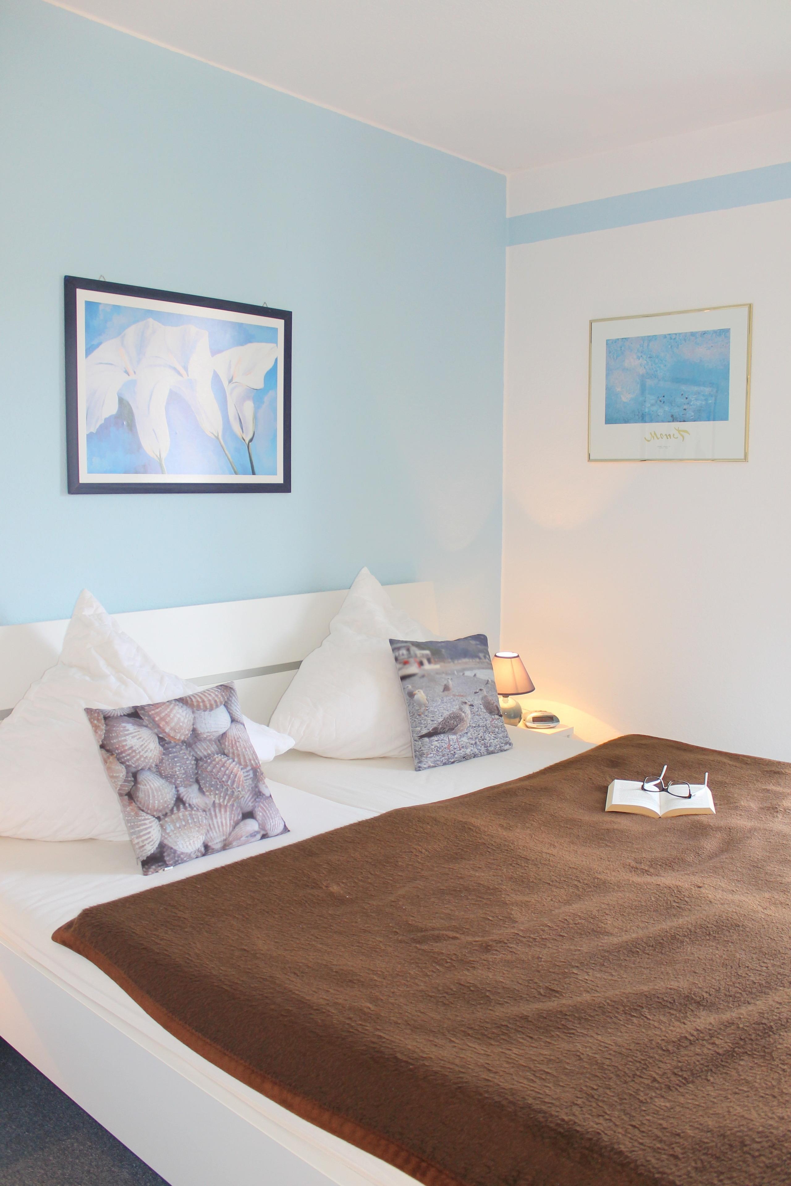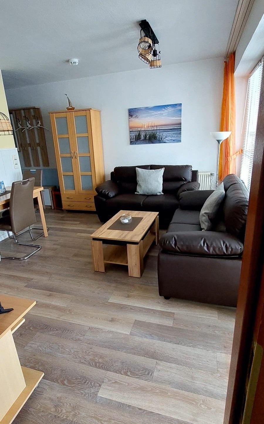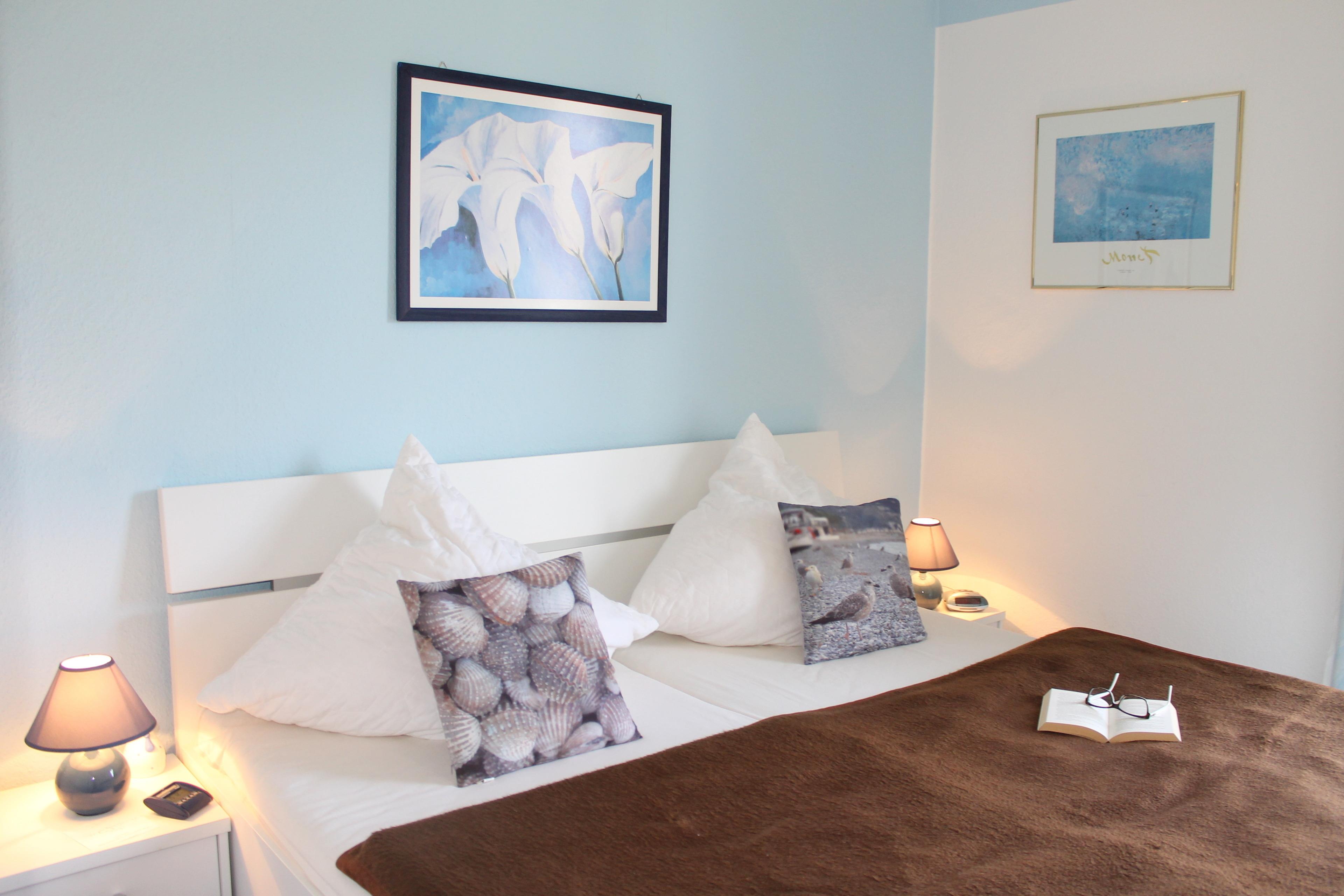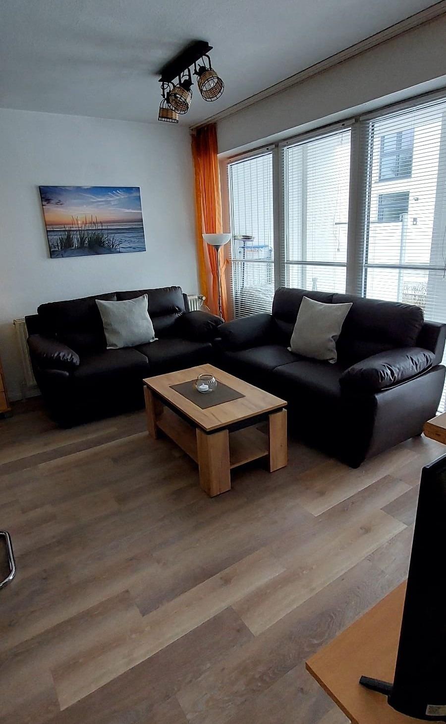Das Wohnzimmer ist mit einer gemütlichen Sitzecke, TV, DVD-Player mit einer DVD-Sammlung für Groß & Klein, WLAN, einem Essplatz sowie einer offene Küchenzeile versehen. Die kleine Küchenzeile ist u.a. mit einem 2-Plattenherd, einer keinen Geschirrspülmaschine, einem Backofen, sowie einer Kaffeemaschine ausgestattet. Vom Wohnbereich aus haben Sie Zugang zur möbilierten Terrasse in SüdWest-Lage. Das Badezimmer verfügt über Dusche/WC und eine Handtuchheizung. Eins der beiden Schlafzimmer ist mit einem Doppelbett (getrennte Matratzen, offenes Fußende; Maße: 1,80 x 2,00 m) und einem Kleiderschrank versehen, ein bodentiefes Fenster ist vorhanden. Das Kinderzimmer ist mit einem Etagenbett (mit Schutzgitter) sowie einem Kleiderschrank versehen, auch hier befindet sich ein bodentiefes Fenster. Die Wohnung ist mit Steckdosenschutz versehen und eine Sammlung an Gesellschaftsspielen und Büchern speziell für Familien ist vorhanden.