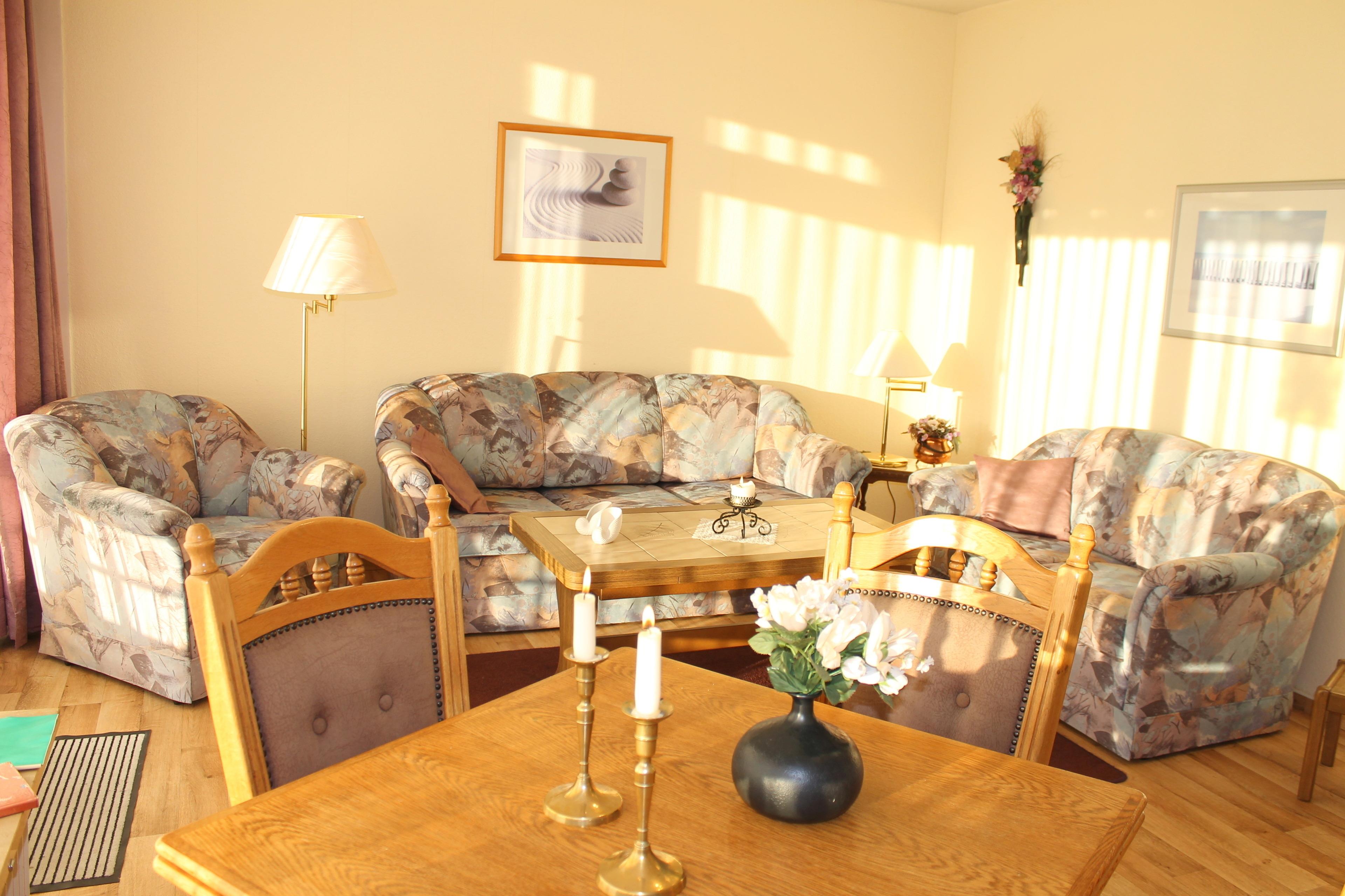 Das Wohnzimmer ist stilvoll eingerichtet und verfügt über eine ausziehbare Doppelschlafcouch (1,60 x 2 m), Kabel-TV, kostenloses WLAN und Radio-CD-Player. Sie können hier gemütlich relaxen oder auch eine schöne Zeit mit Ihrer Familie verbringen. Die separate Küche ist vollständig ausgestattet und verfügt über alle modernen Geräte wie ein 4-Platten-Ceranfeld, Backofen, ein 4-Sterne Kühlschrank, eine Mikrowelle sowie Kleingeräte wie eine Kaffeemaschine, einen Eierkocher und einen Wasserkocher. Sie können hier Ihre eigenen Mahlzeiten zubereiten und somit auch in den Ferien Ihre Kochkünste unter Beweis stellen.